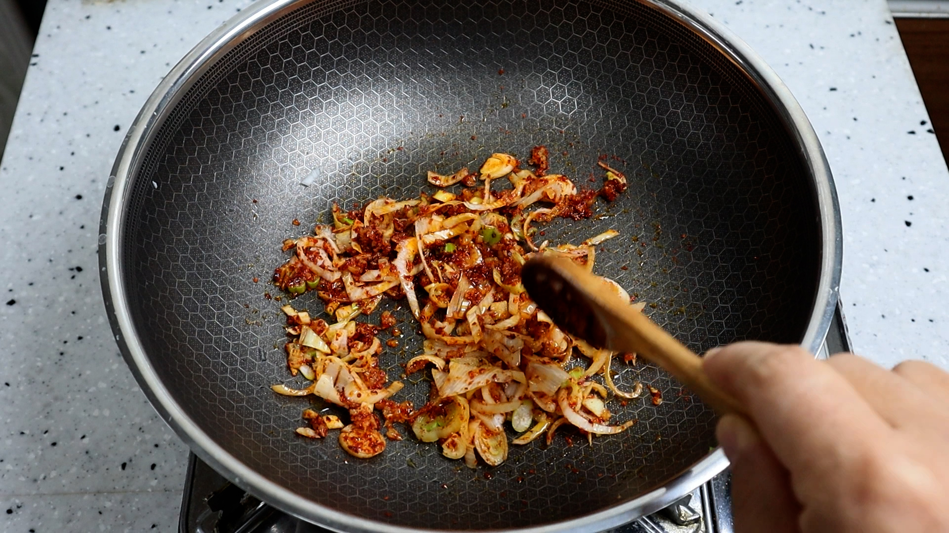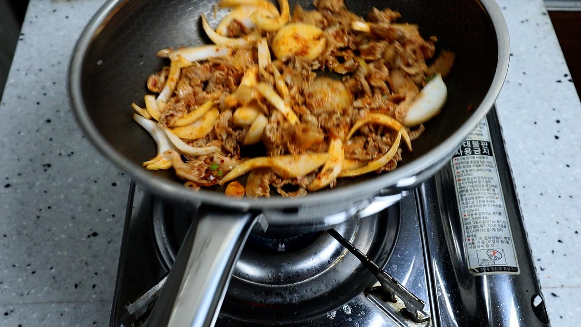 15. 양파를 넣고 불을 강불로 올리고 1분 30초 정도를 볶아주세요.