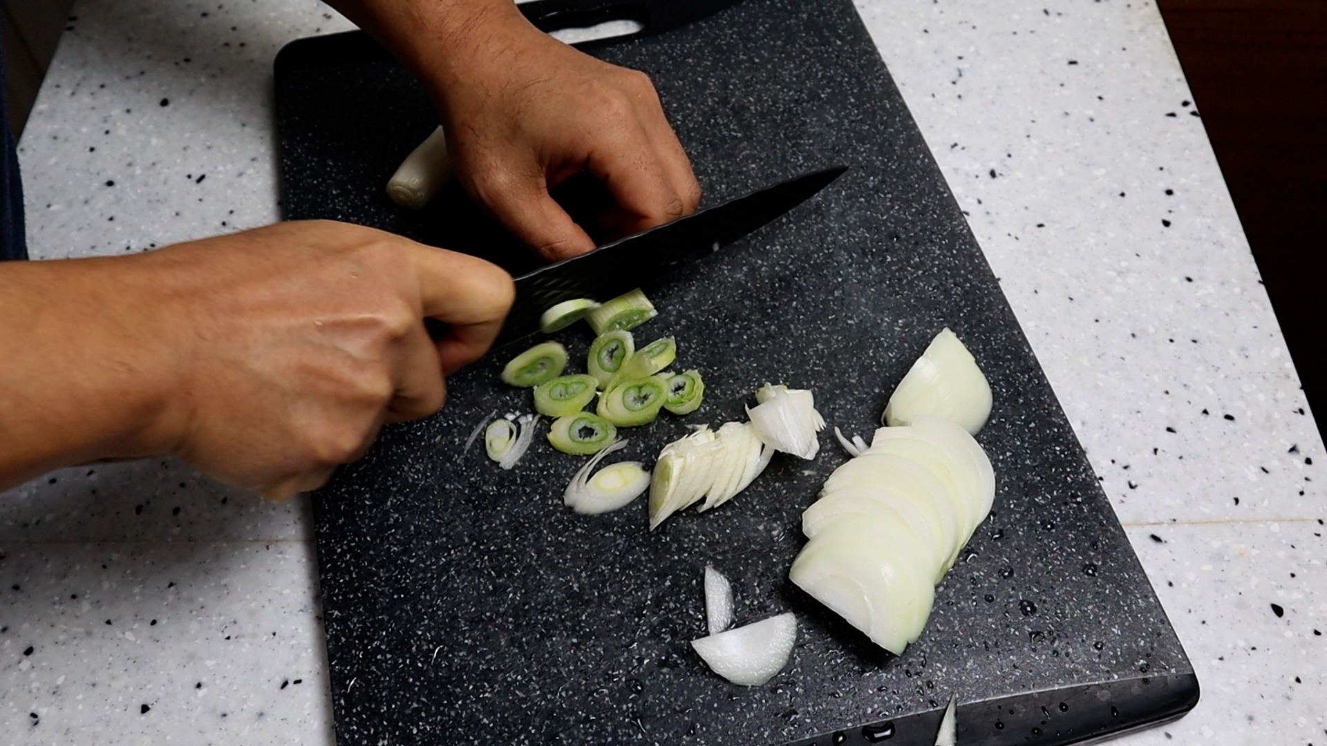 1. 양파는 1cm 보다 조금 작게 채를 썰어주세요. 큼직한 식감을 좋아하시면 좀 큼직해도 됩니다.