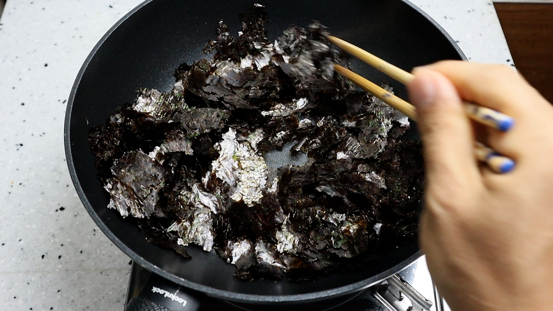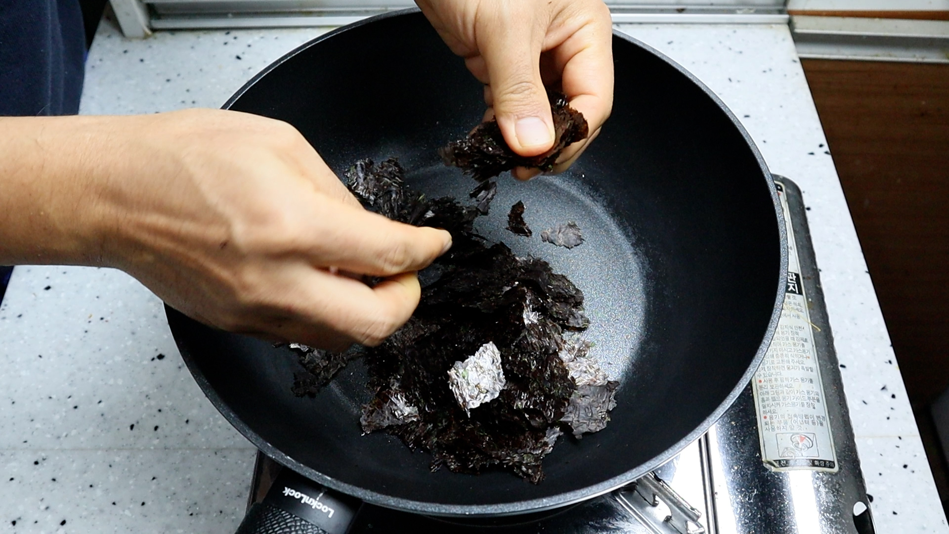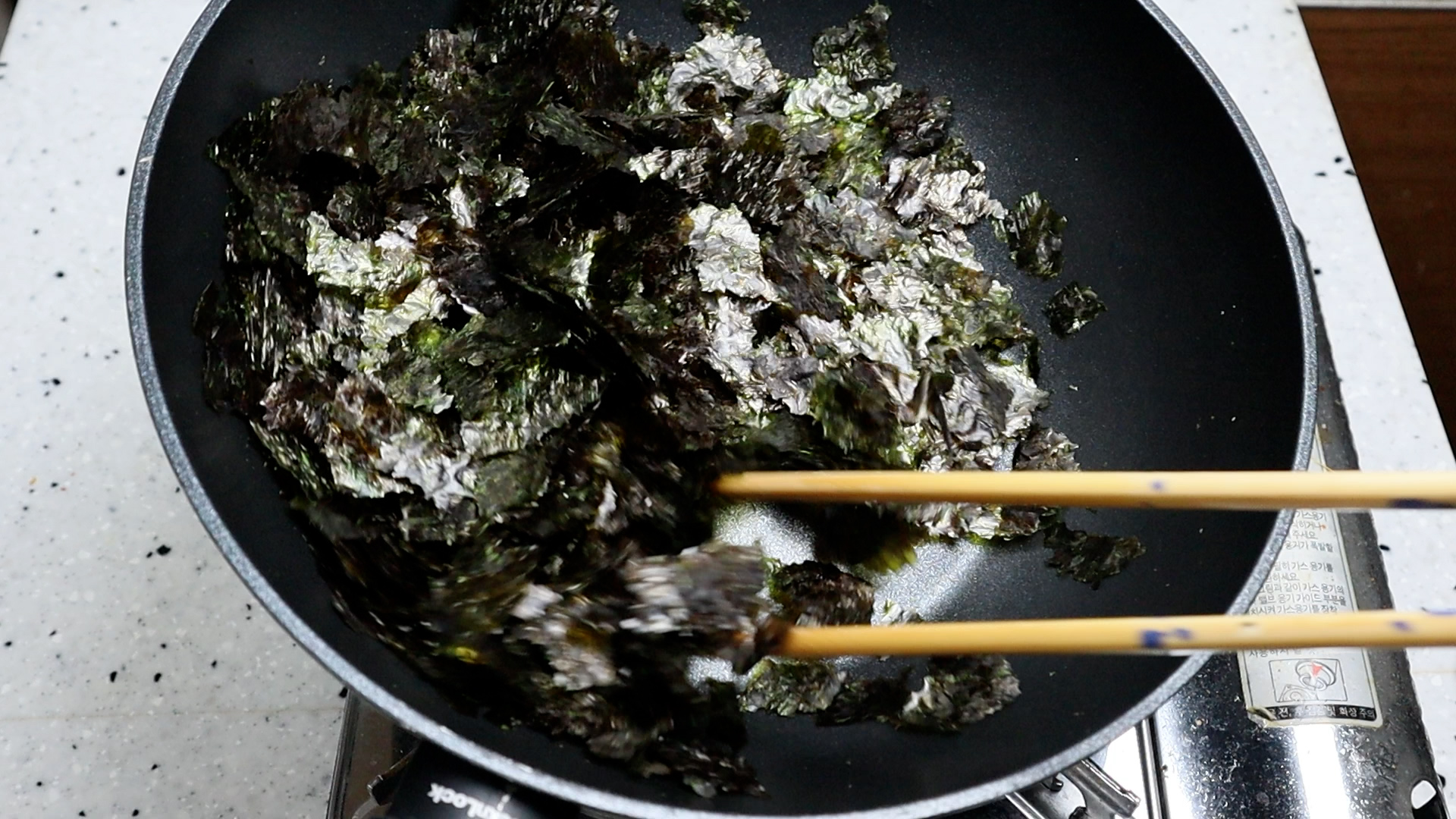 10. 약불에 골고루 섞어가면서 들러붙은 김을 낱장낱장 떨어지게 볶아주세요. 김은 순식간에 탈수 있으니 가능하면 자주 뒤섞어주셔야 합니다.