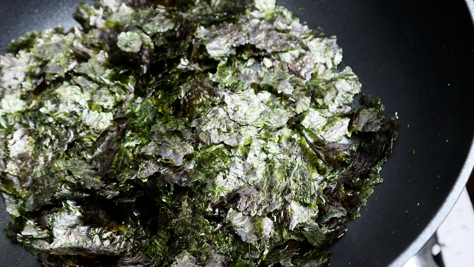 11. 약불로 예열된 다음 대략 4~5분 볶아주시면 김중 절반 이상이 초록빛을 띠기 시작할거에요. 김을 전부다 이렇게 볶아주려면 먼저 초록으로 굽힌 김이 탈수 있으니 절반이상 초록빛으로 구워지면 볶기를 멈추시면 됩니다.
