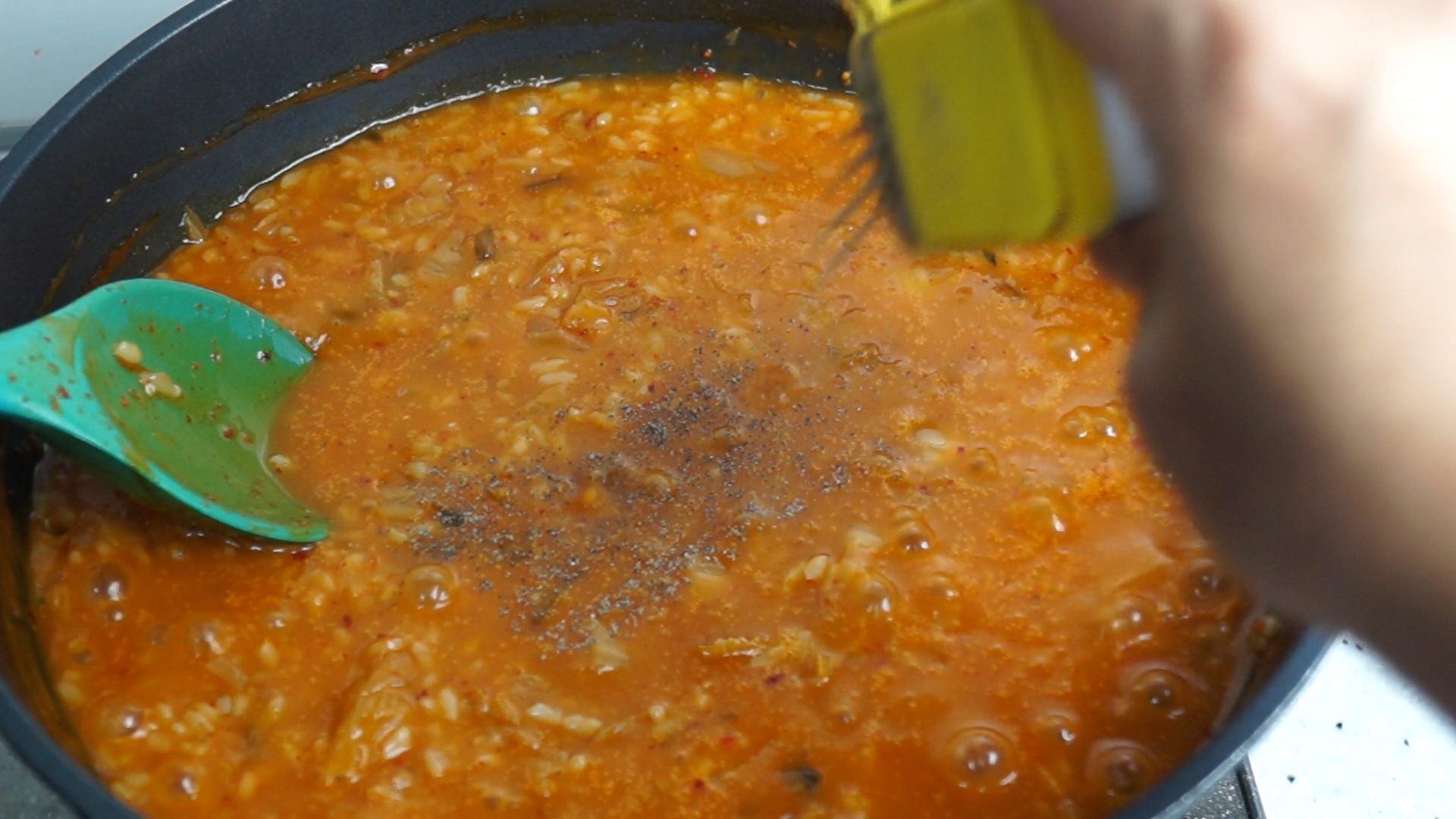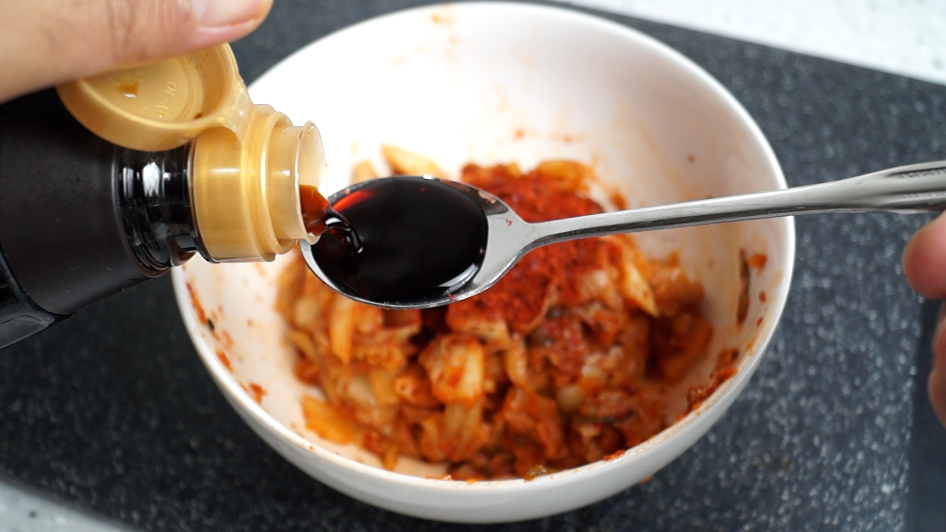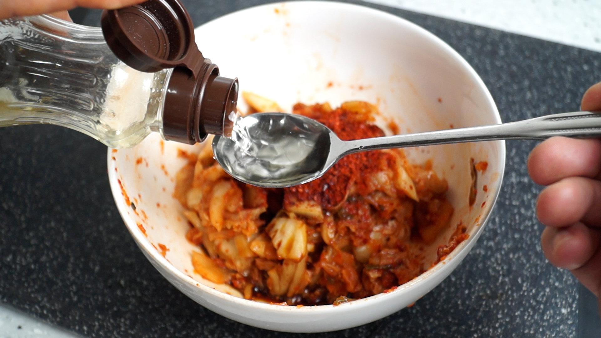 12. 김치국물 6스푼 대략 50g 을 부어주세요. 이건 김치 양념할때 넣고 같이 볶아줘야 하는건데 제가 깜박 했네요 ㅜ..ㅜ..(어쩐지 평소와 다르게 조금 빨리 늘어붙더라고요..) 여러분은 김치 양념할때 부어주세요.