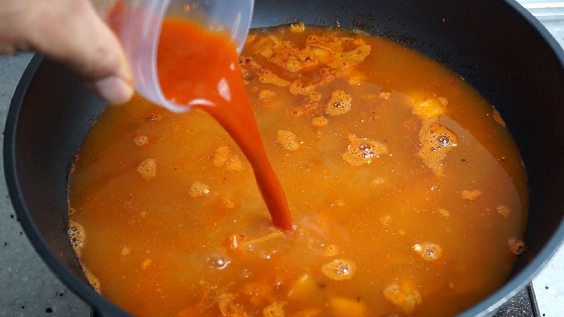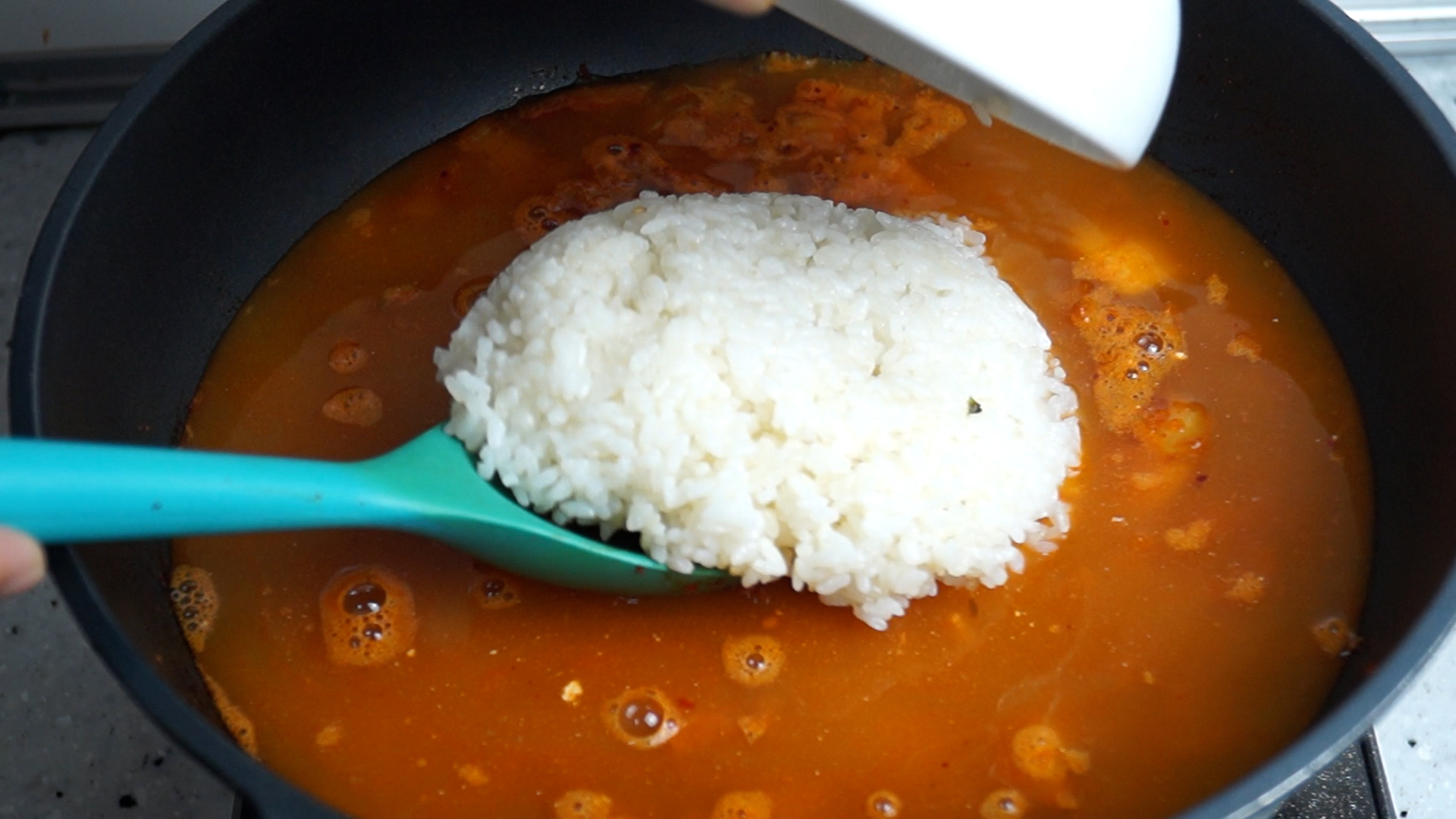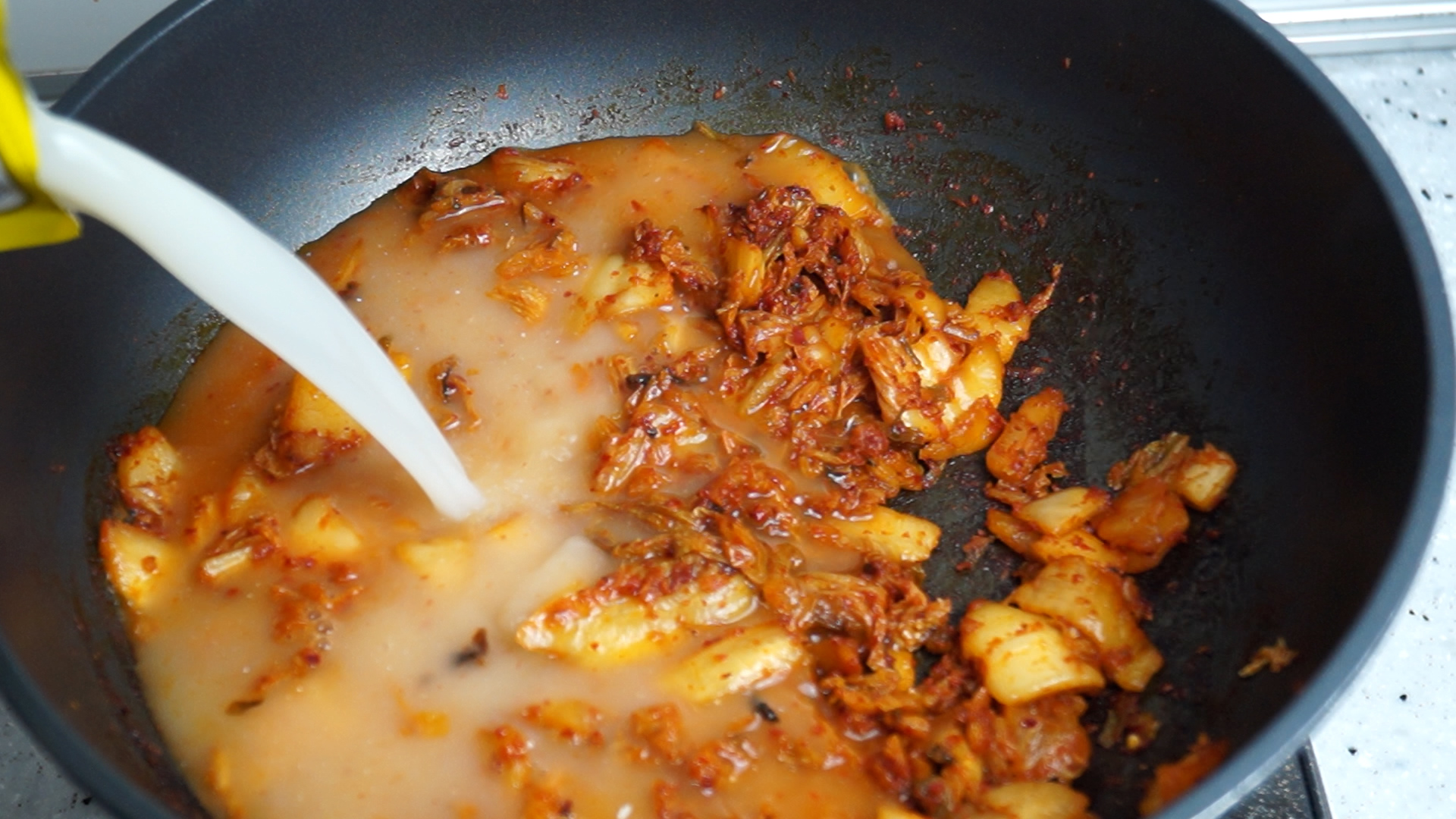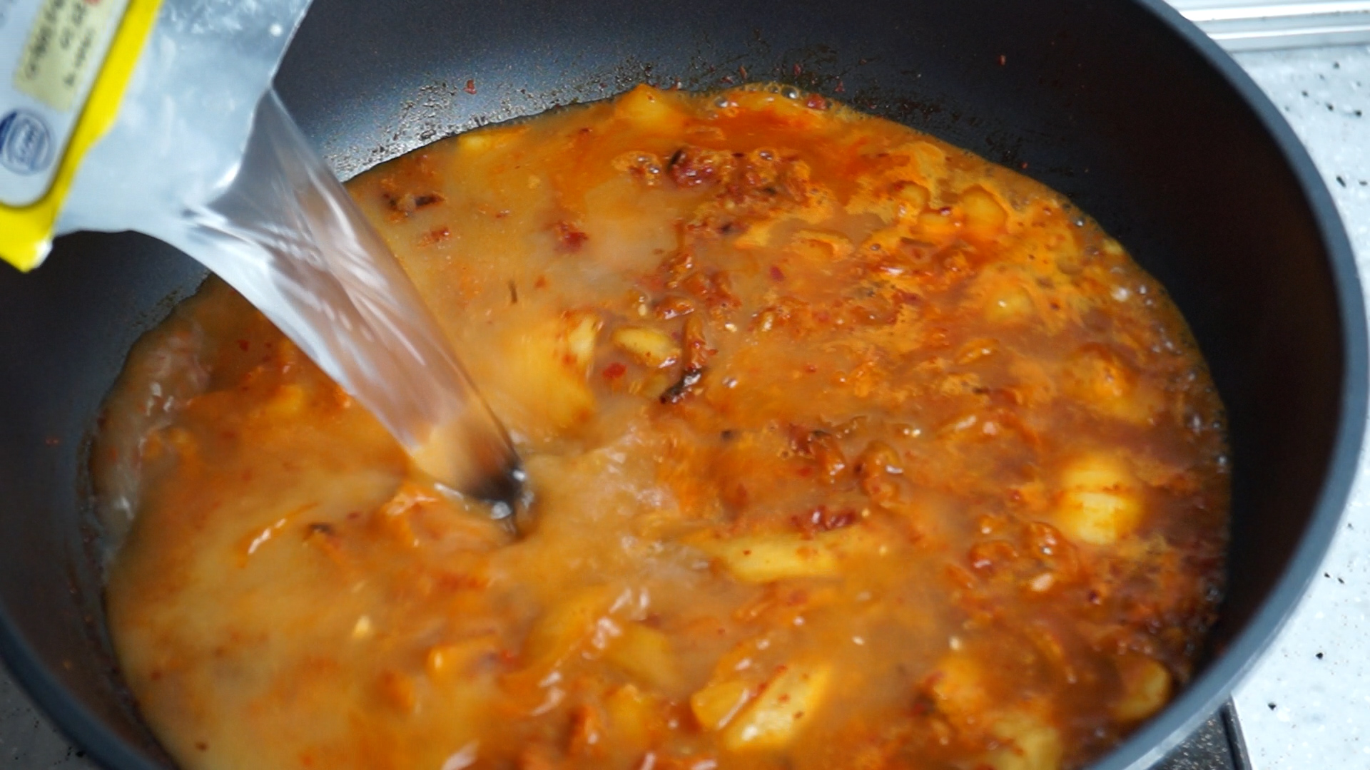 10. 볶음 김치에 시판 사골곰탕 1팩 350g 을 부어주세요.