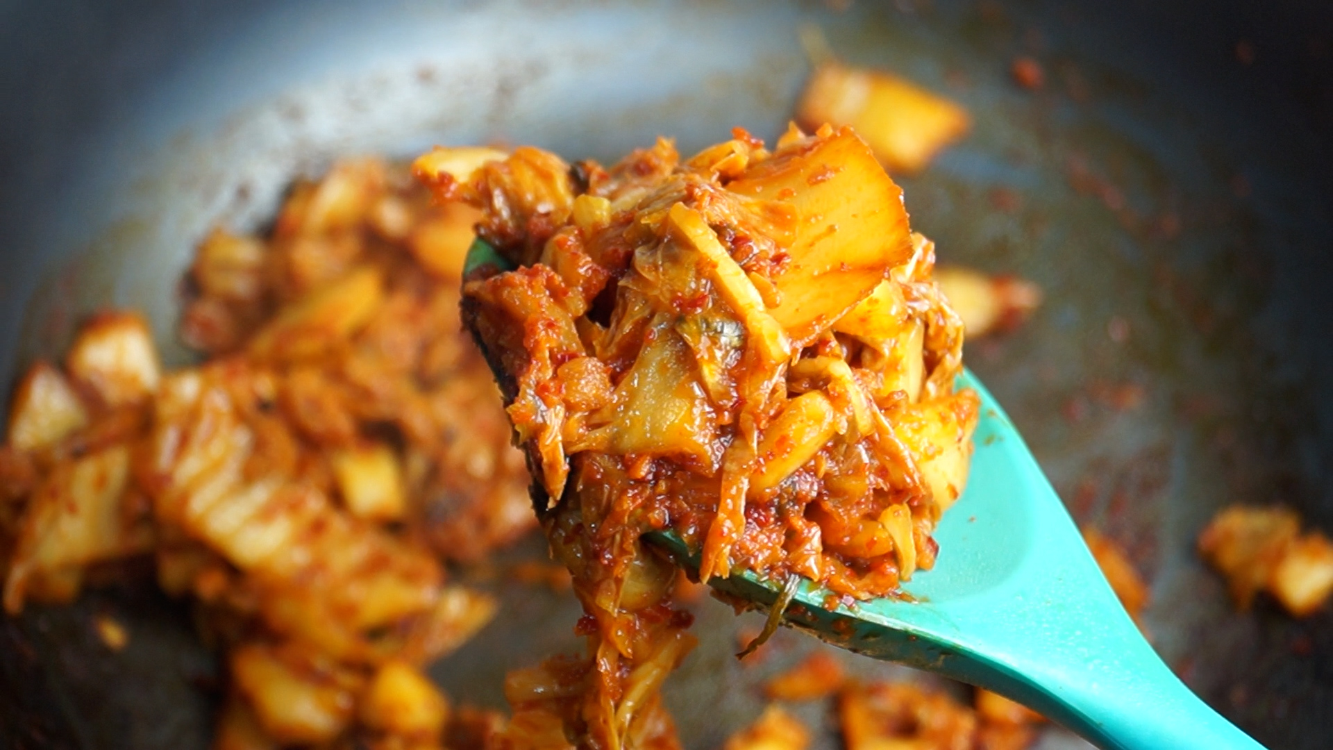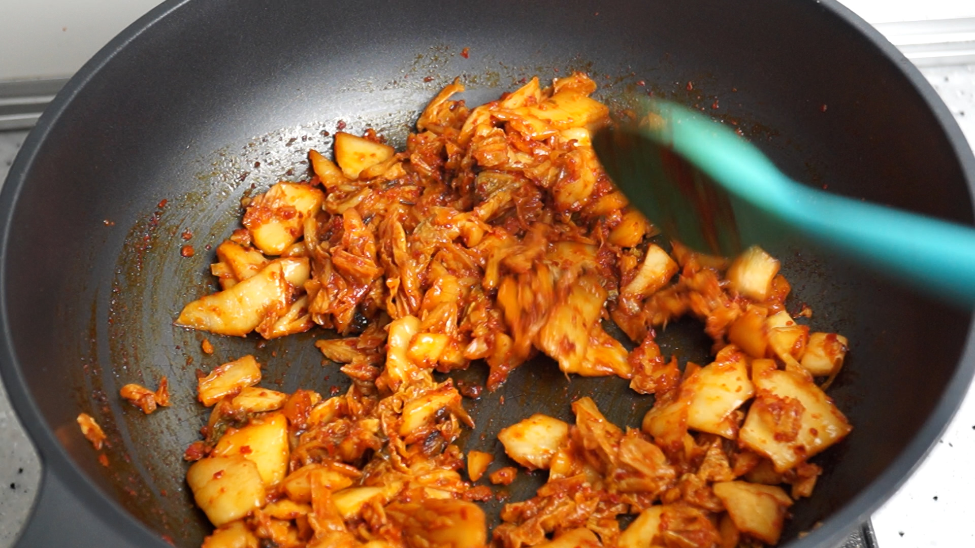 8. 중불로 달군 팬에 양념한 김치를 넣고 4~5분을 볶아주세요. 4~5분 계속 뒤적 거릴 필요 없이 10~20초에 한번씩 섞어주시면 됩니다.