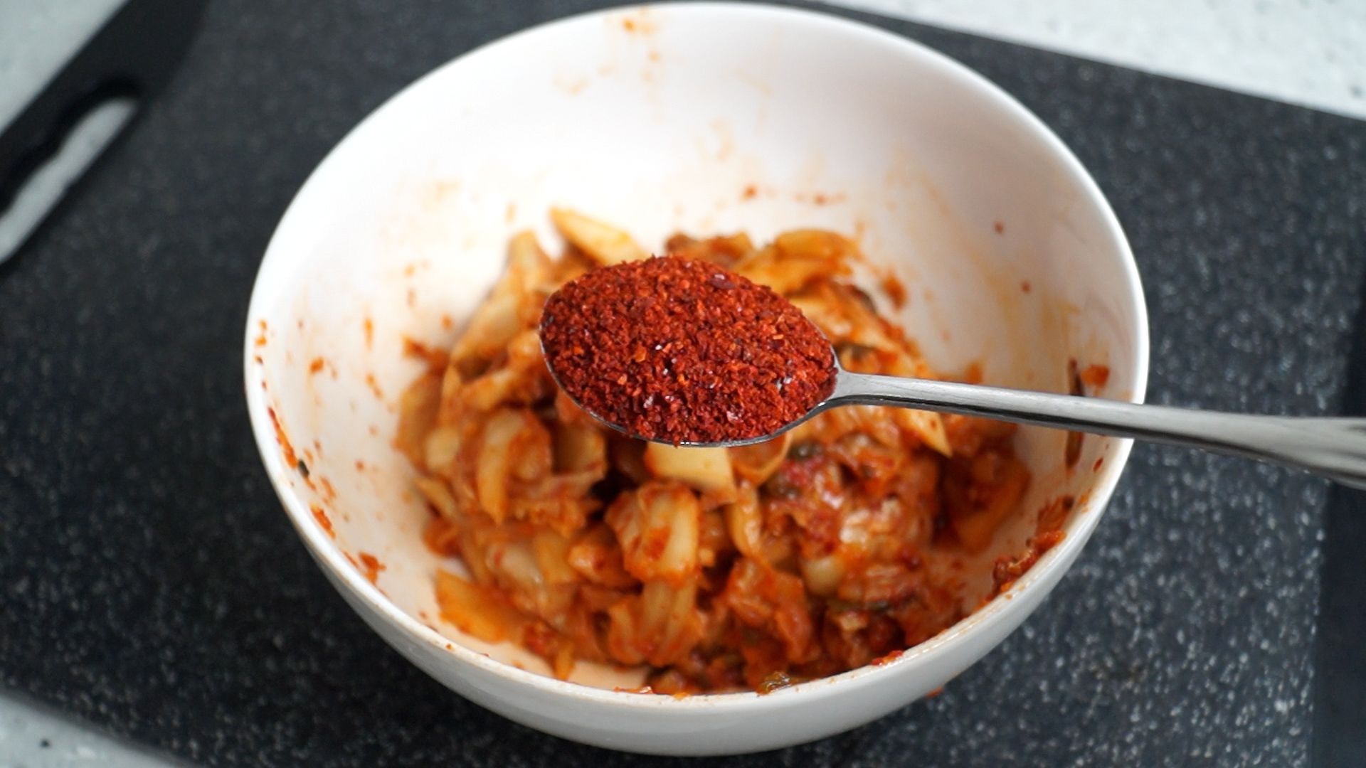 2. 김치에 양념재료를 전부 넣어주세교. 고춧가루는 중간입자 고춧가루를 사용해주세요.