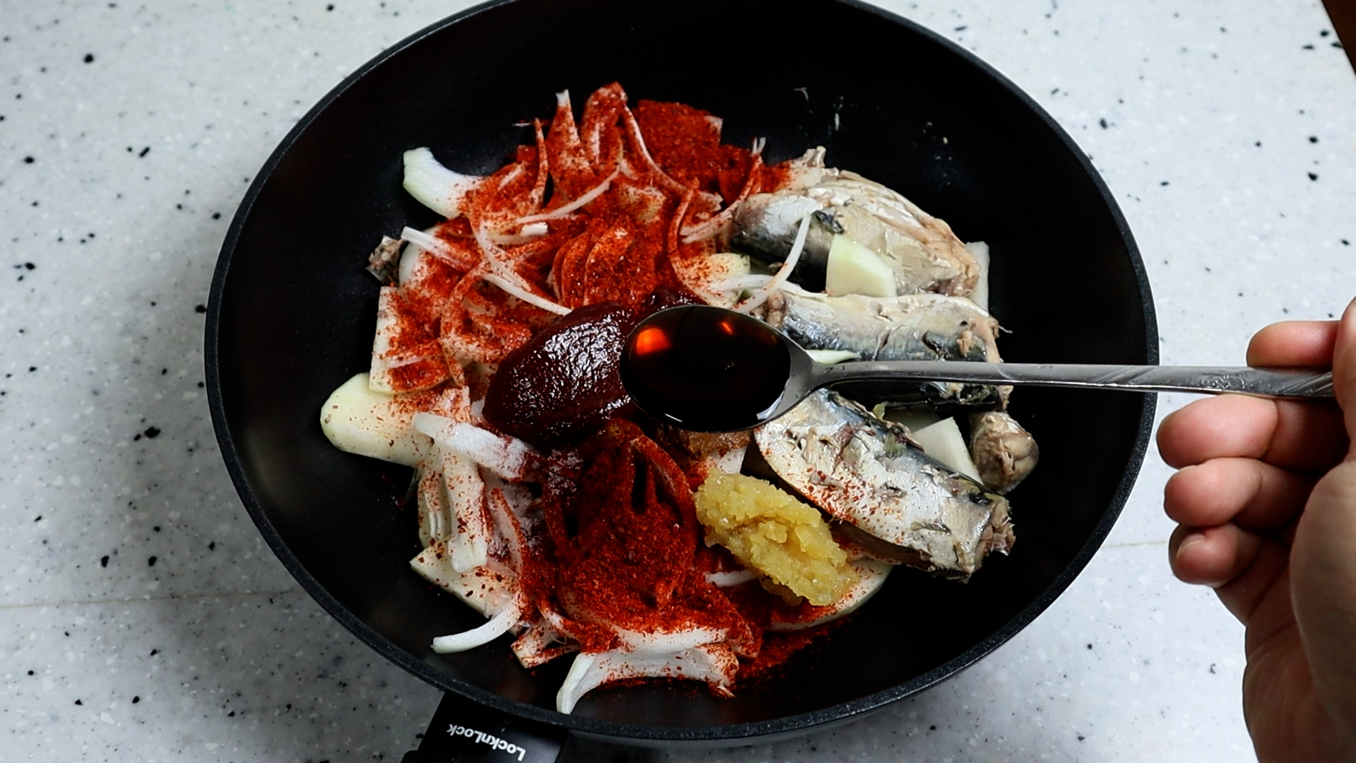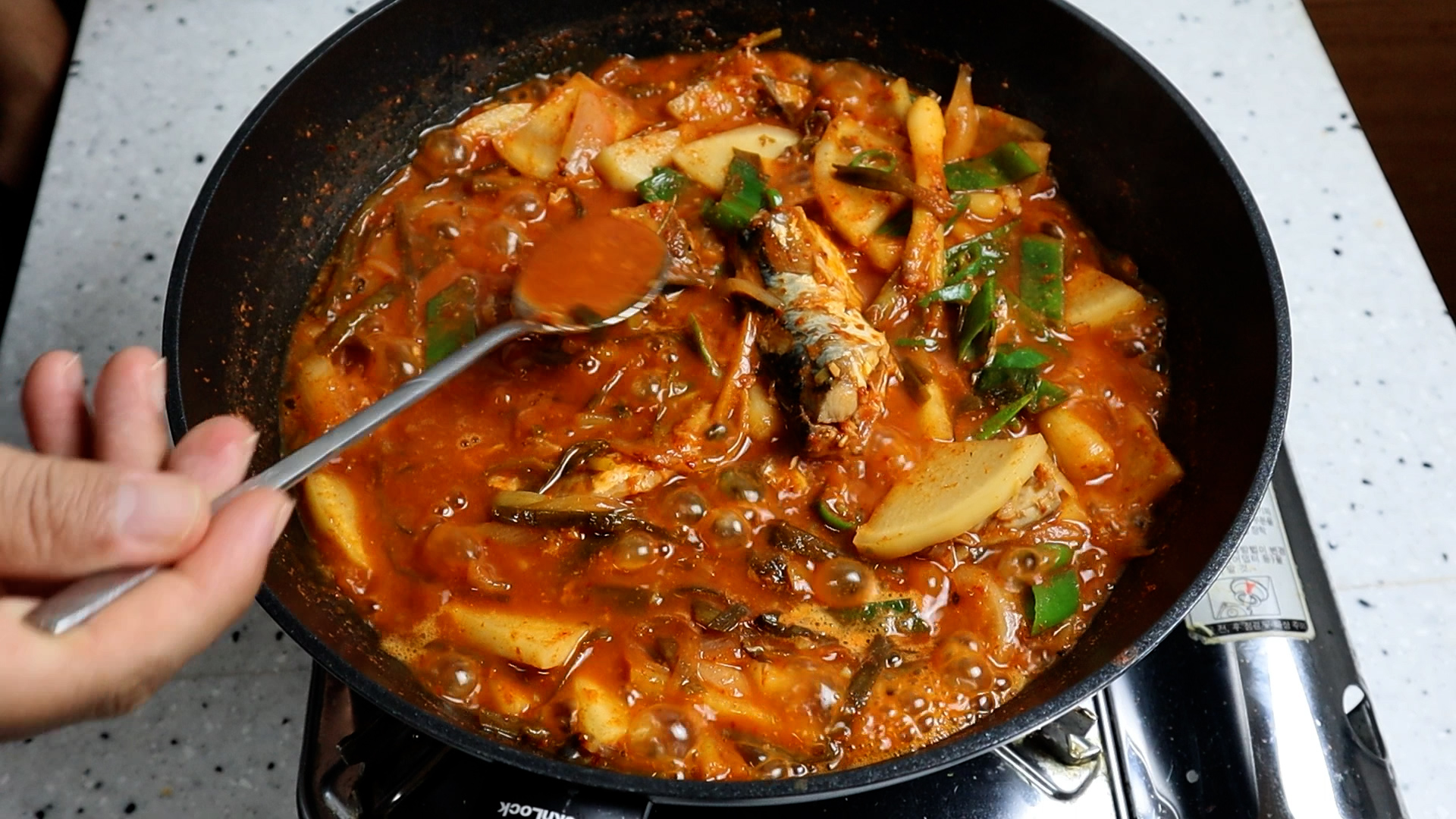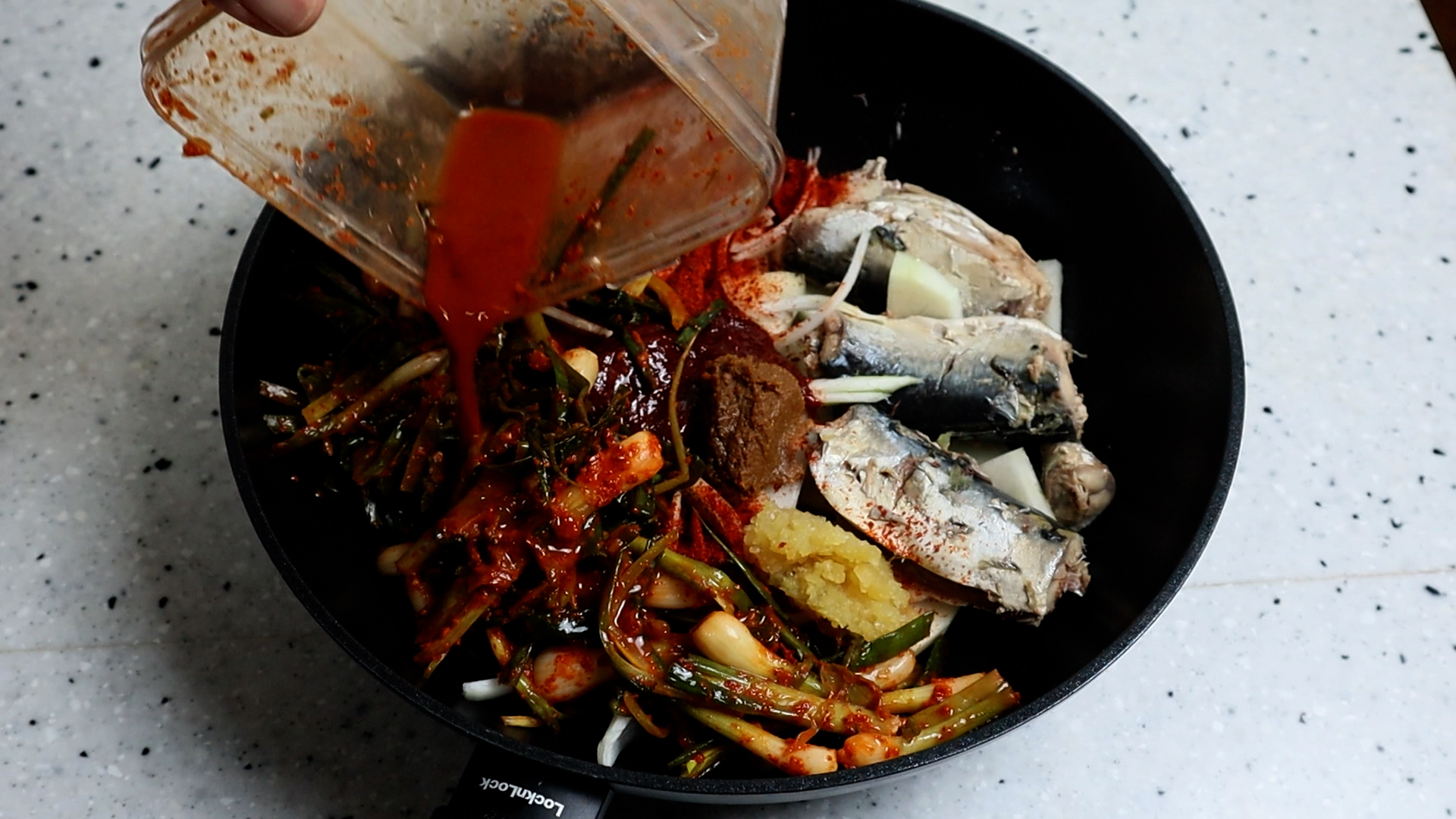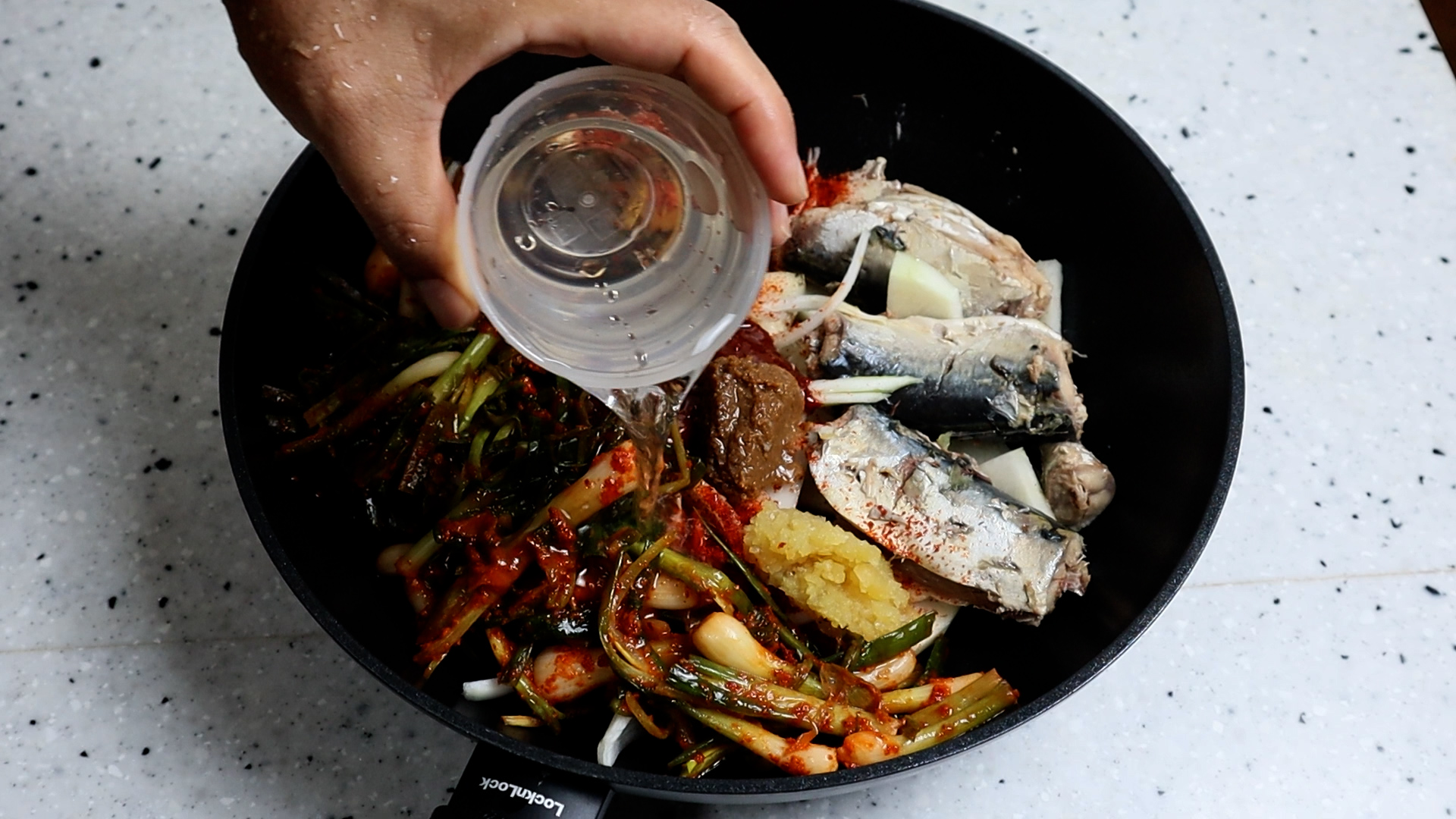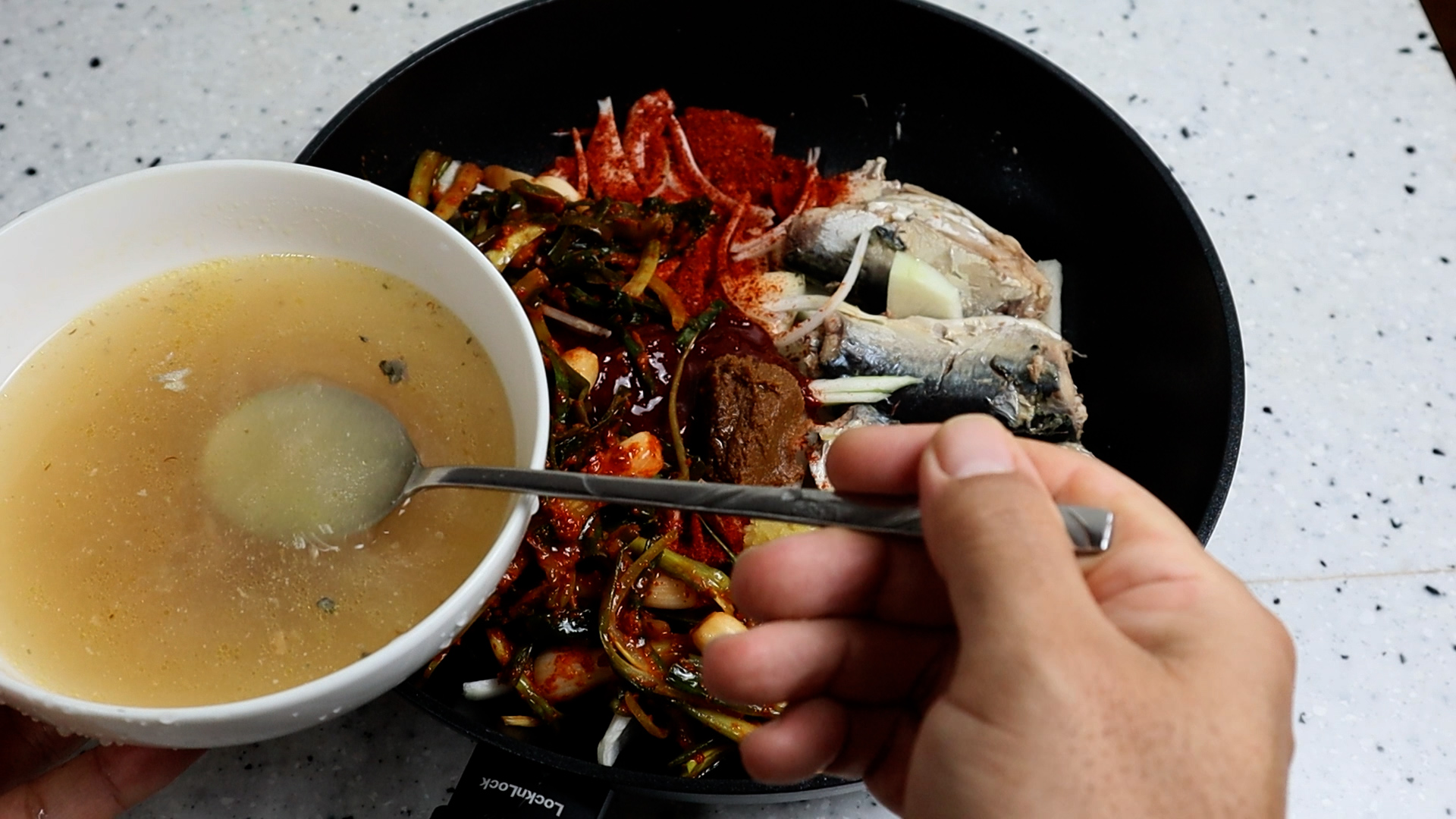 16. 캔 고등어 국물 5스푼을 넣어주세요. 고등어향이 국물에 많이 빠져나와 있어 살려주려 넣는거에요. 생고등어는 그냥 쓰시면 됩니다.