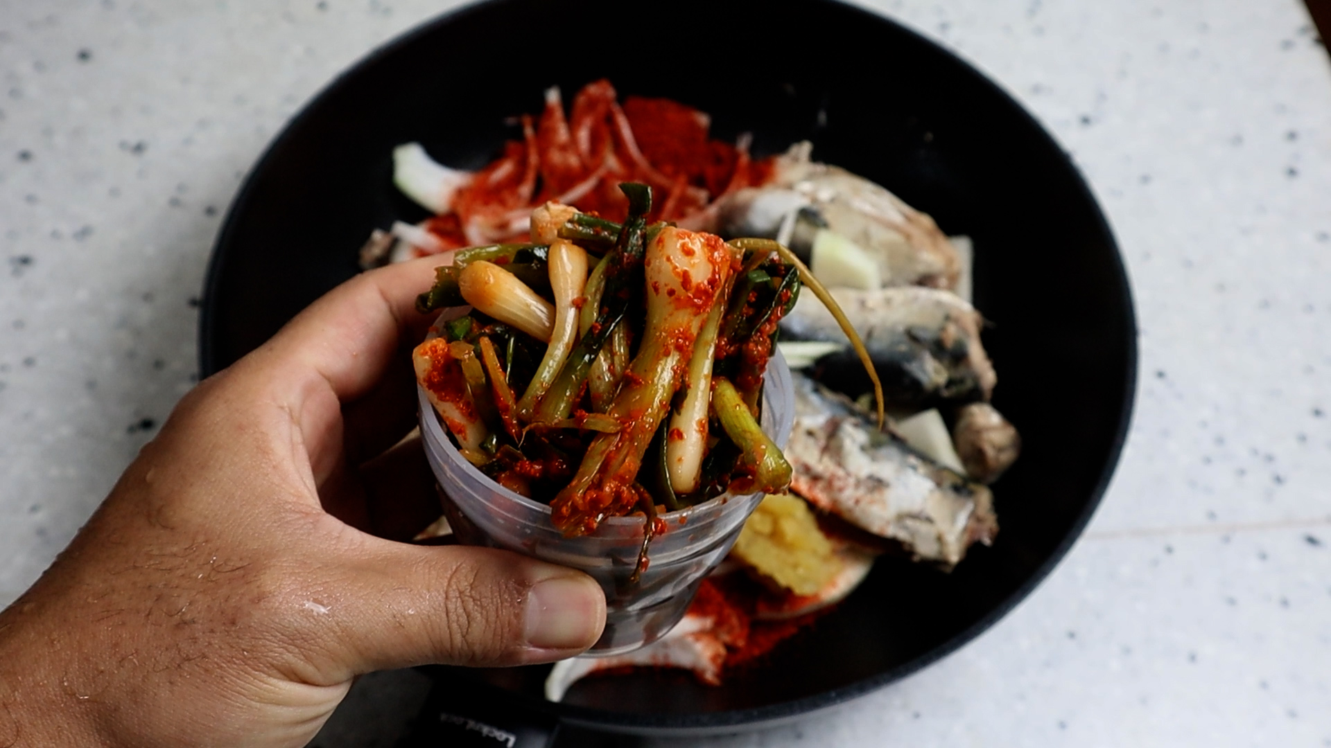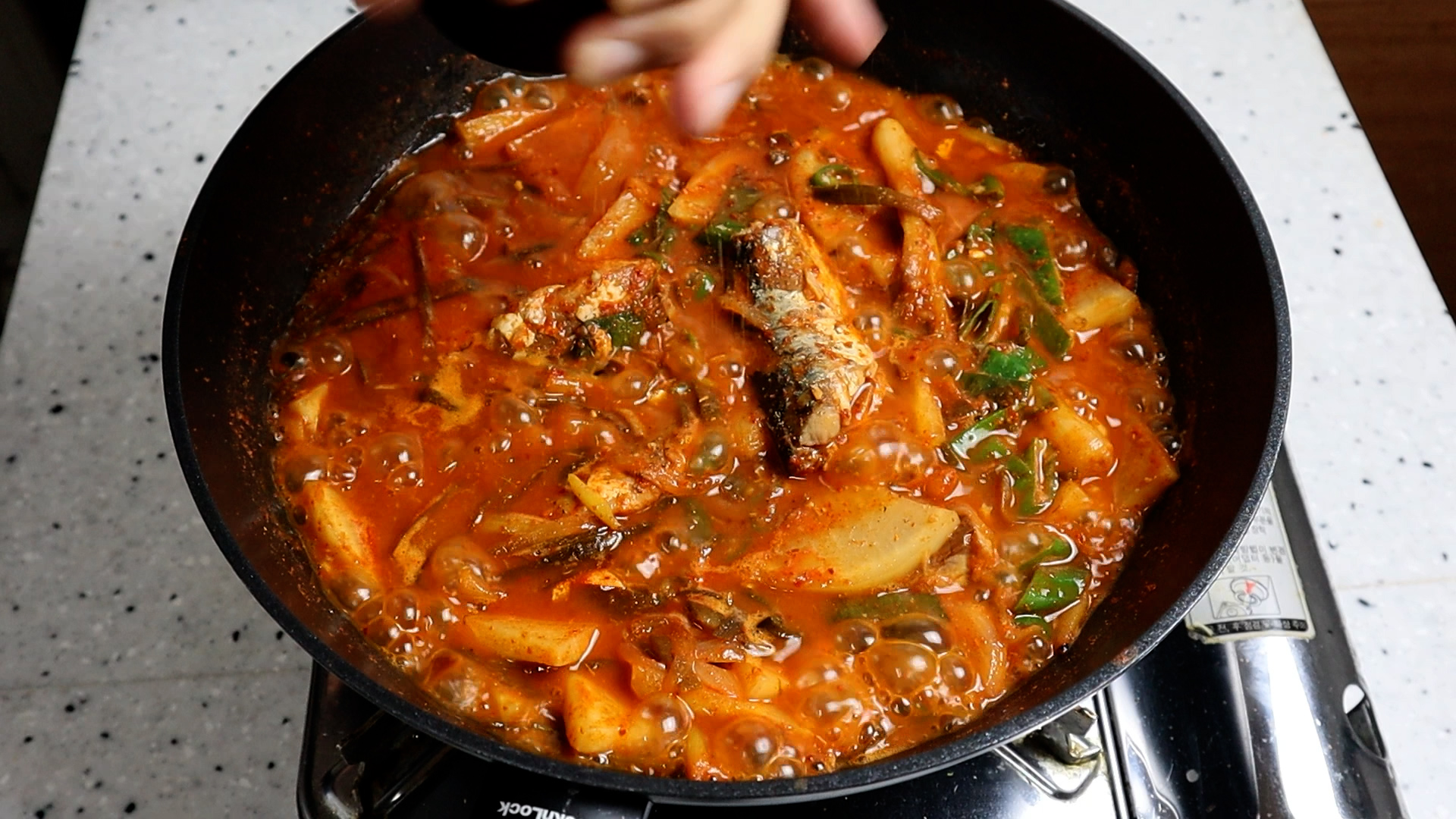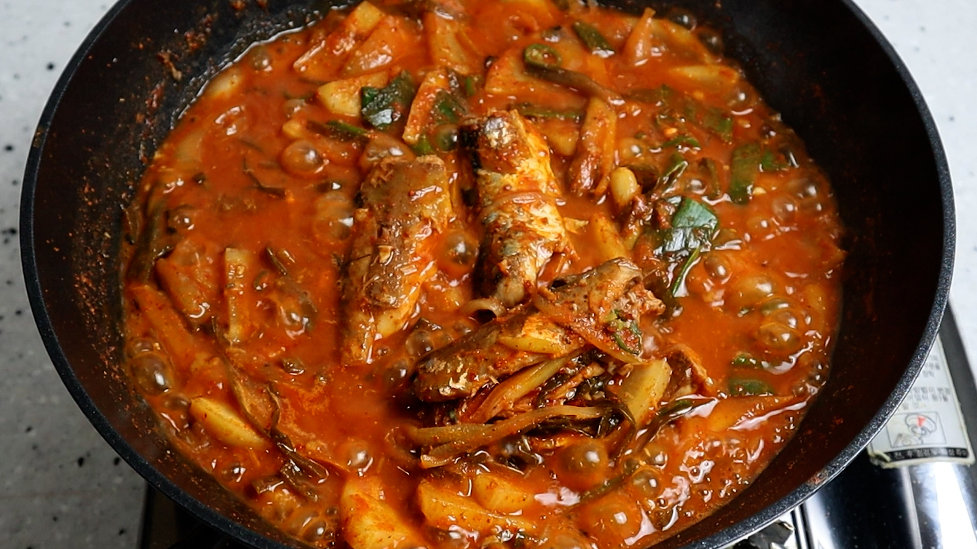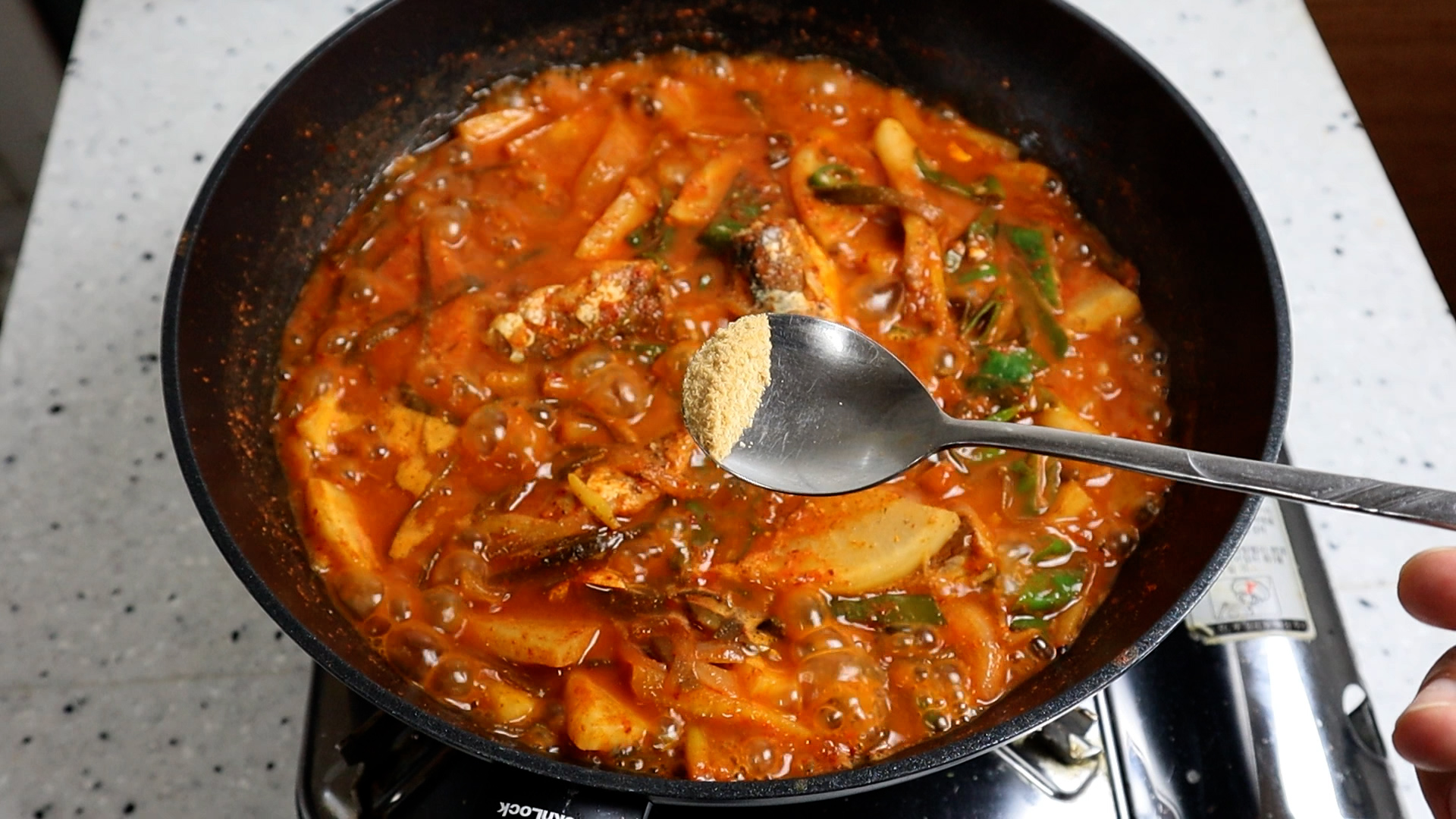 16. 캔 고등어 국물 5스푼을 넣어주세요. 고등어향이 국물에 많이 빠져나와 있어 살려주려 넣는거에요. 생고등어는 그냥 쓰시면 됩니다.