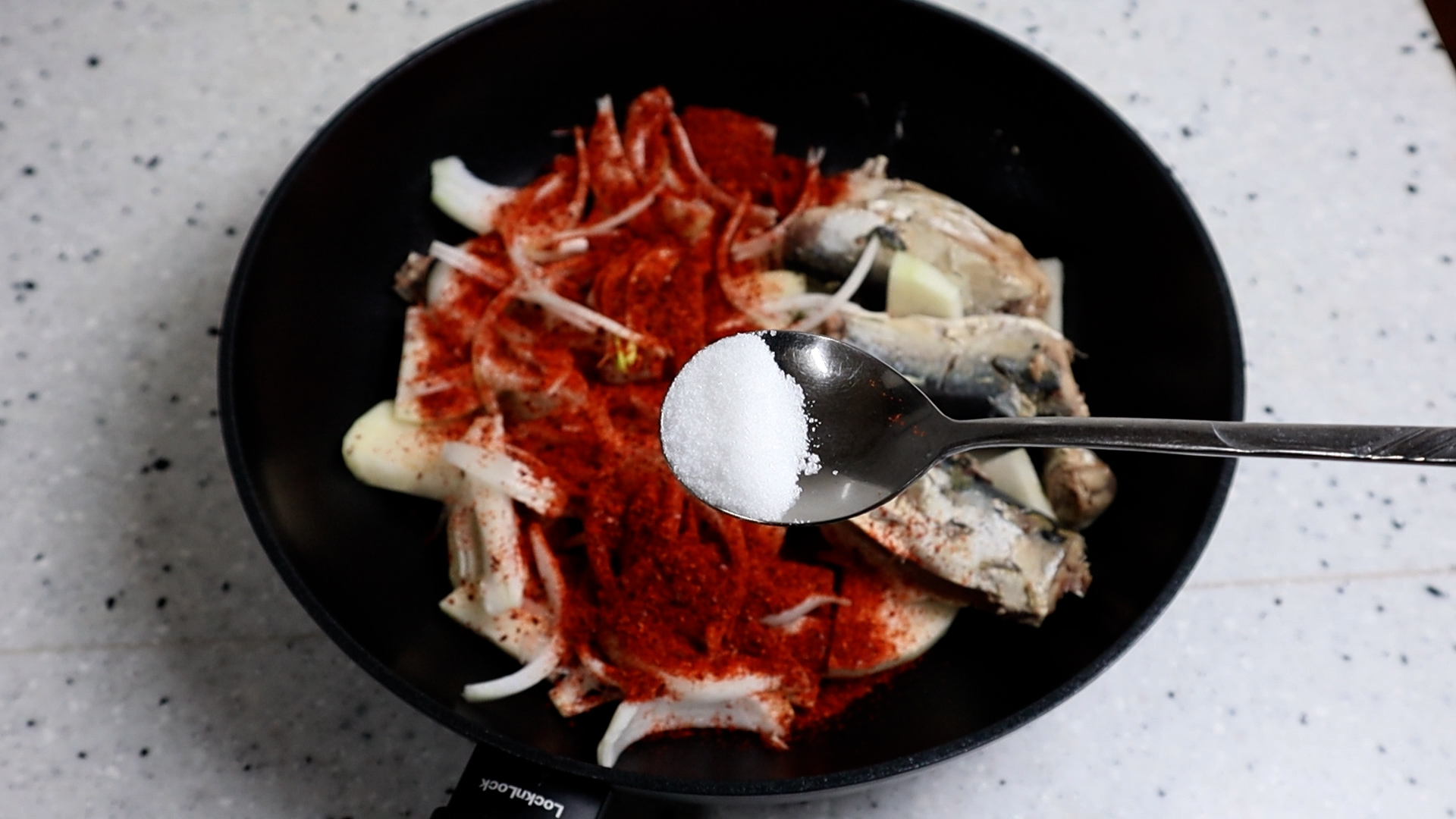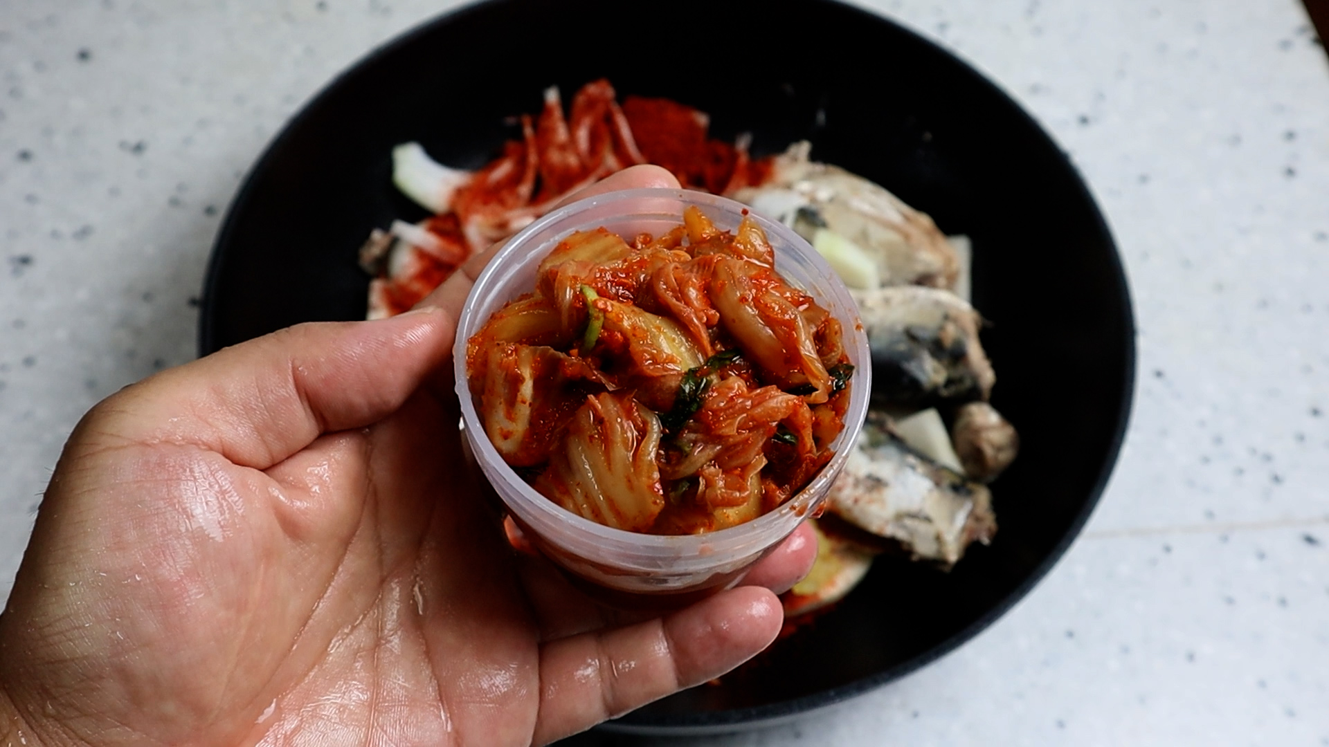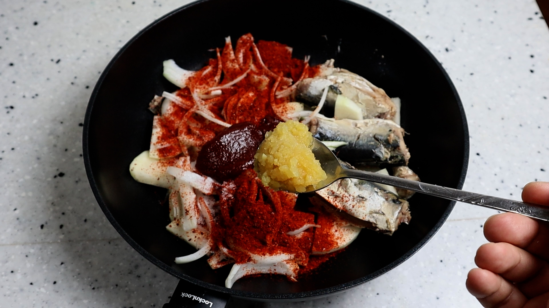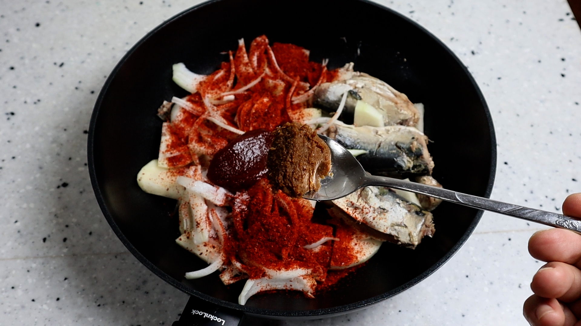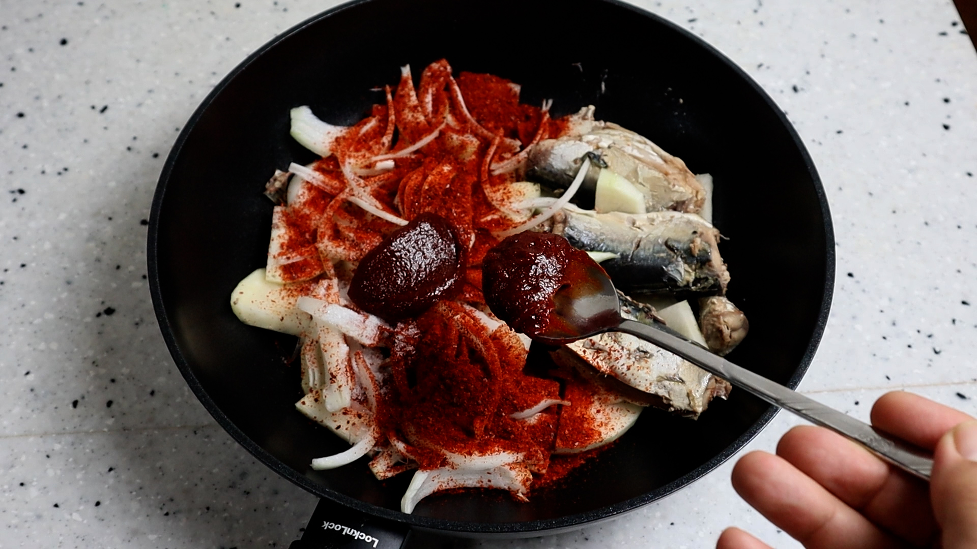 16. 캔 고등어 국물 5스푼을 넣어주세요. 고등어향이 국물에 많이 빠져나와 있어 살려주려 넣는거에요. 생고등어는 그냥 쓰시면 됩니다.