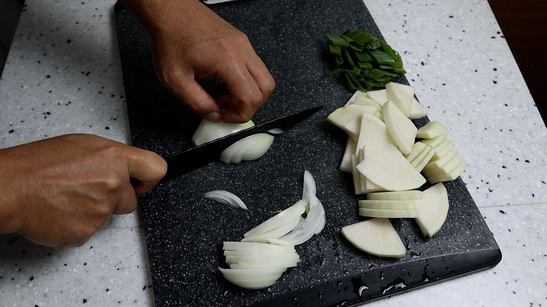 3. 양파는 중간거 반개 또는 작은거 1개를 채를 썰어주세요. 양파 단맛이 더해져야 국물이 매콤 달근한게~ 끝내준답니다.