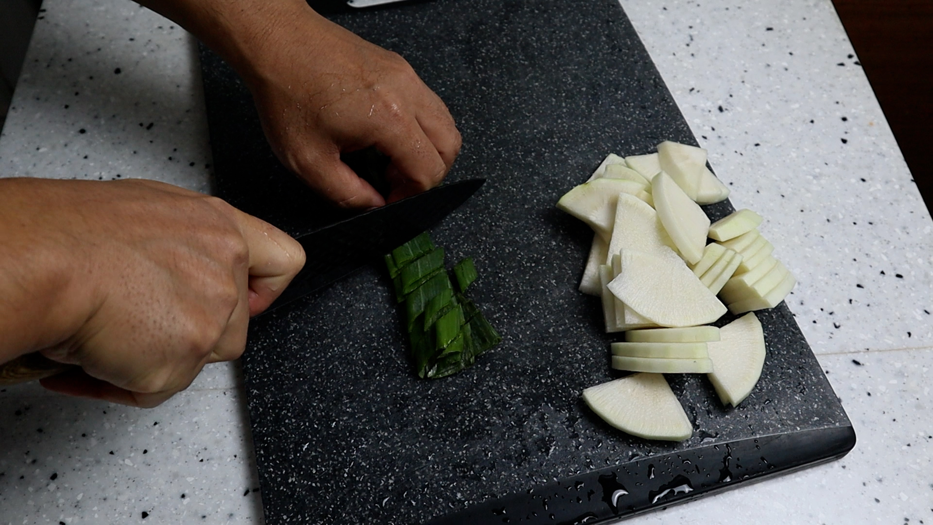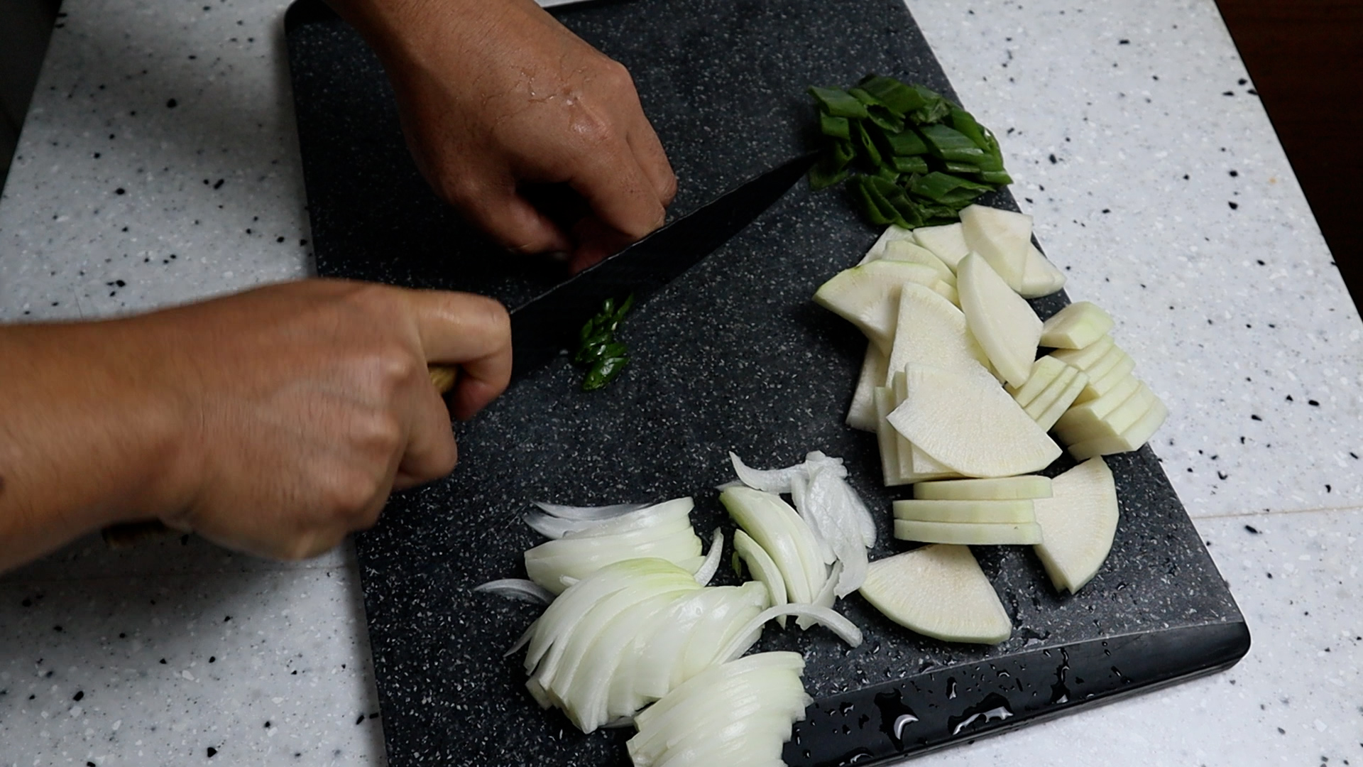 1. 무우를 0.5cm 두께로 얇게 썰어서 크기는 기호에 맞게 썰어주세요. 오늘 레시피는 오래 폭~ 졸이는 방법이 아니라 무우를 좀 얇게 썰었습니다.