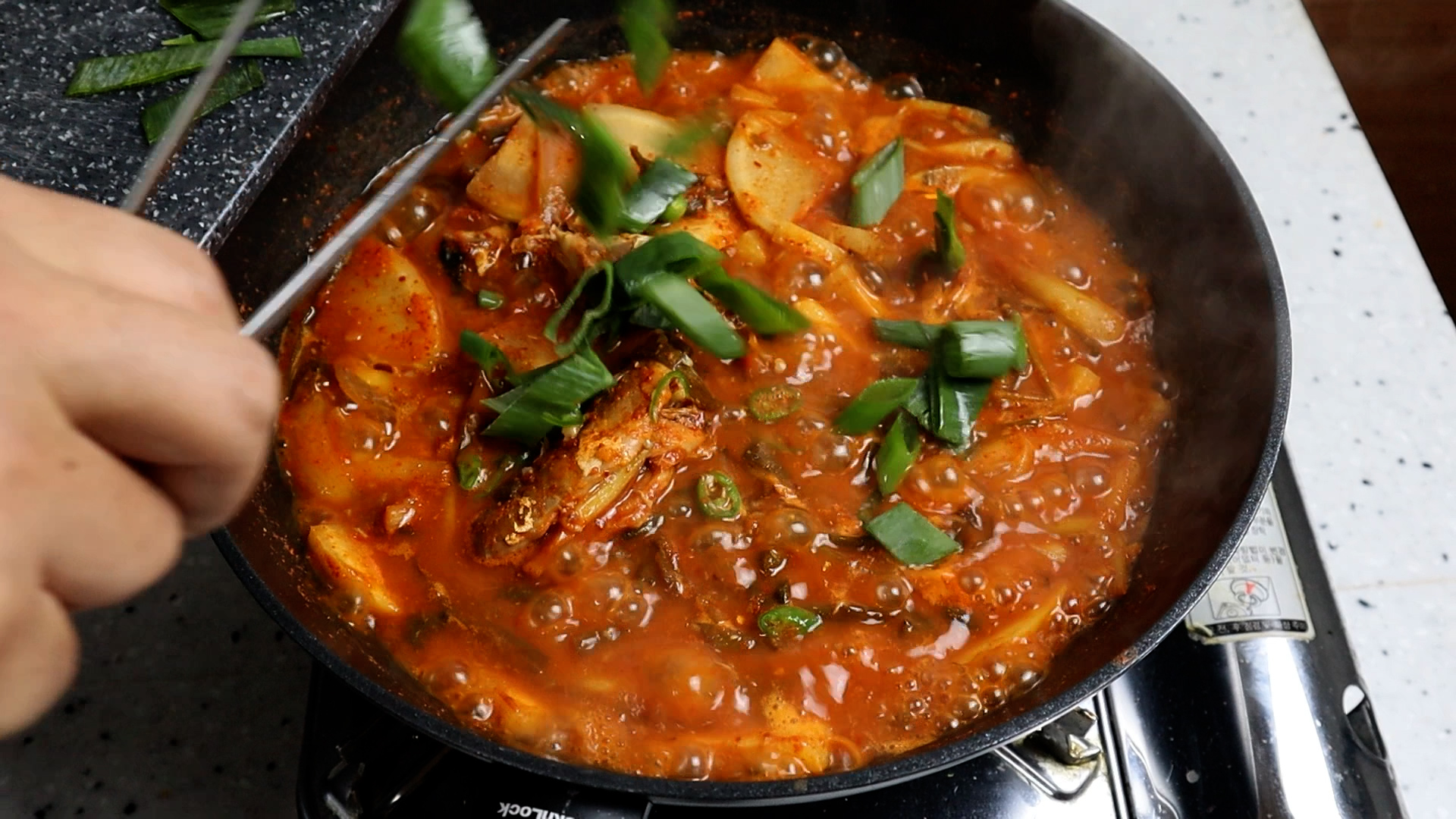 20. 국물이 절반 정도로 줄었을때 땡초와 대파를 던져 넣어주세요.