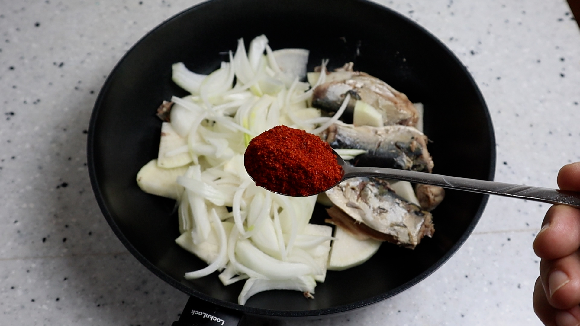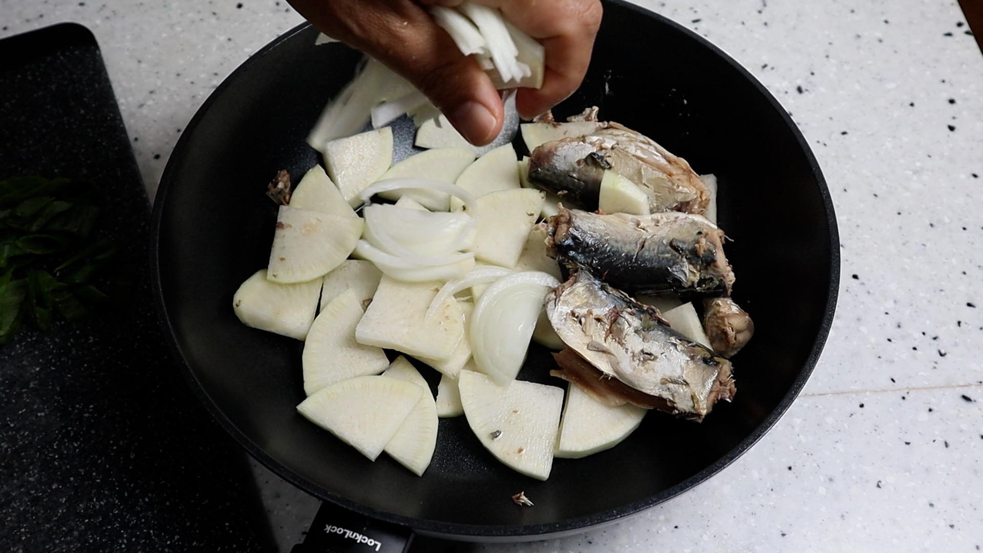 6. 무우를 바닥에 깔아주고 고등어 내용물을 올리고 양파를 올려주세요.