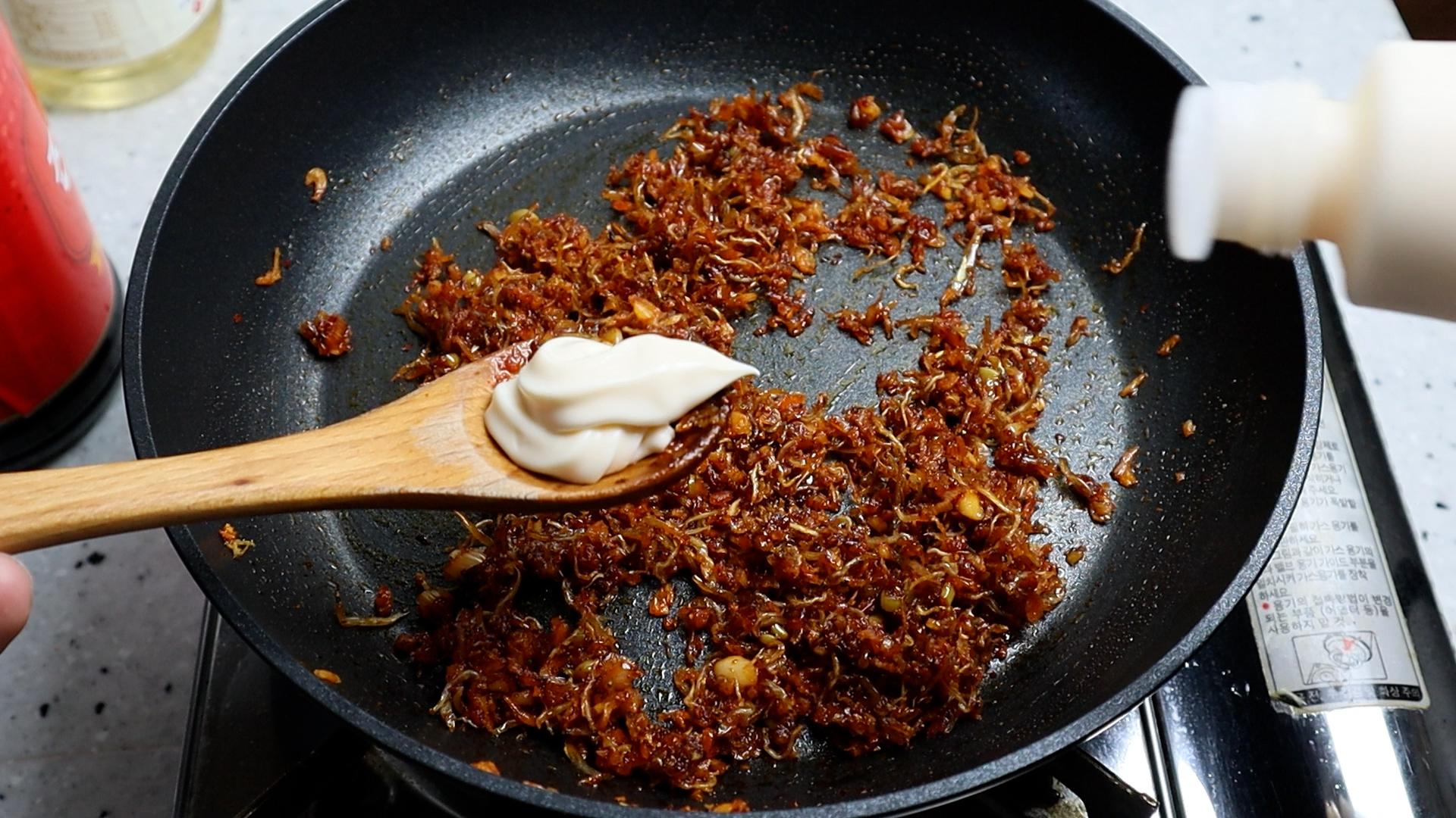 12. 마요네즈도 잔열에 골고루 버무려주세요. 혹시 팬이 너무 식어 마요네즈가 잘 안풀리면 불을 약불로 잠시만 켜주시는것도 좋습니다.