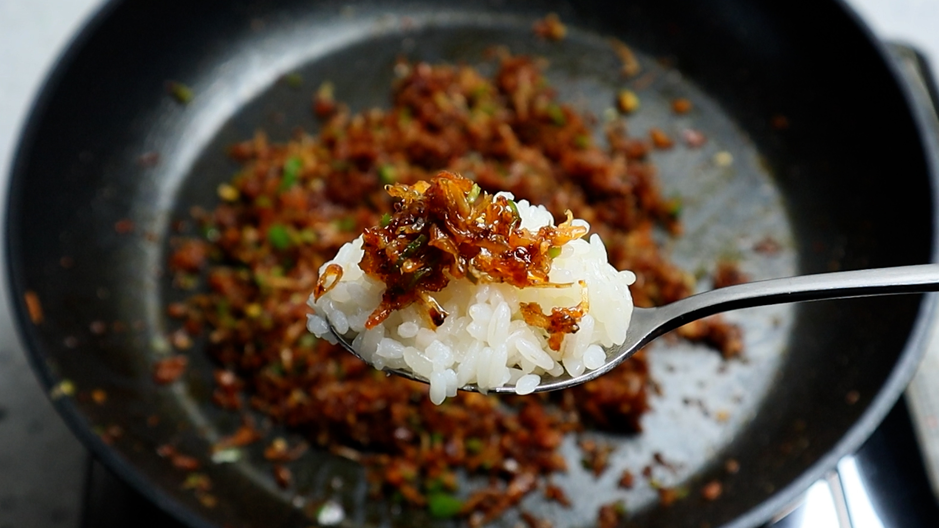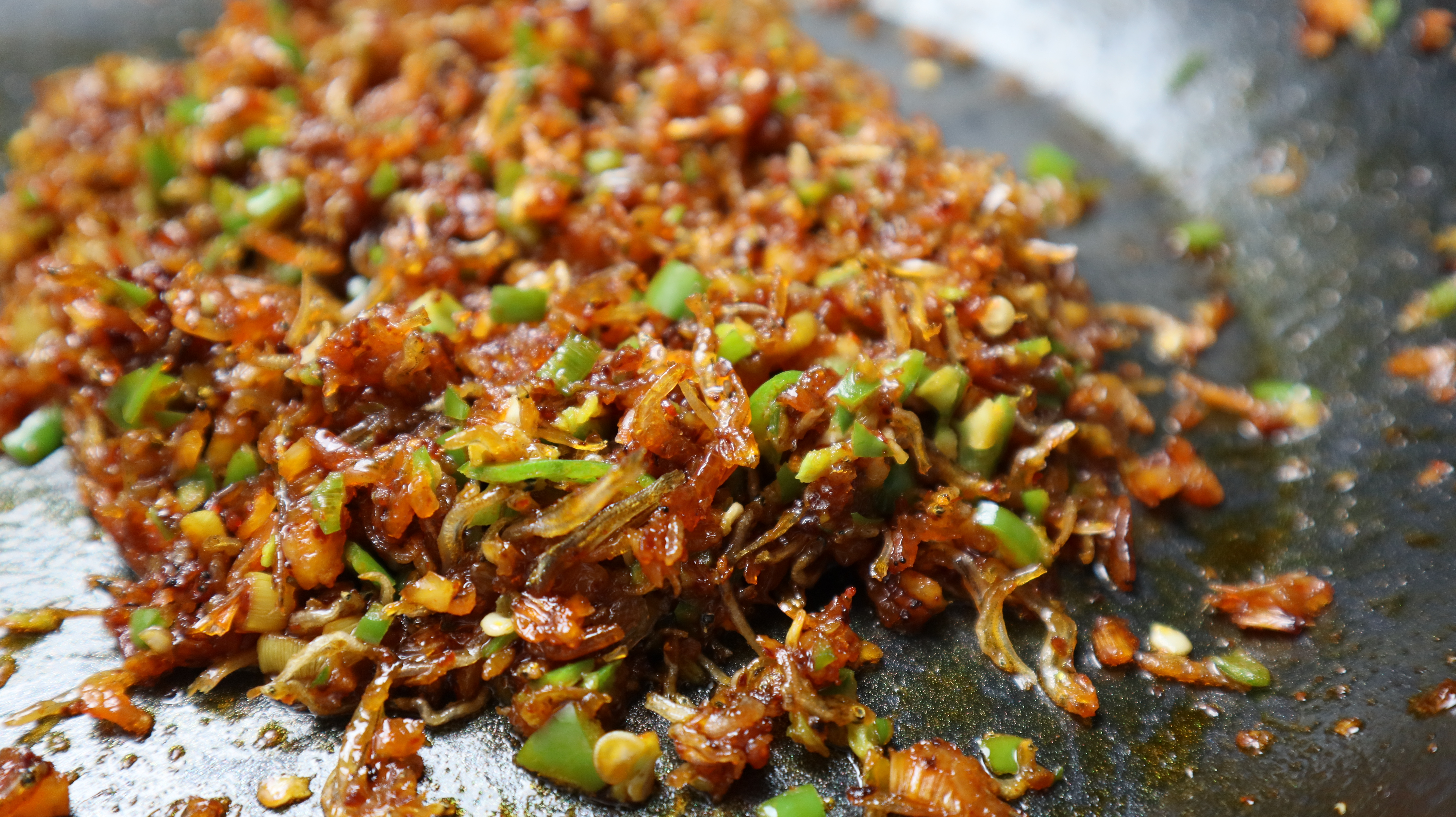 10. 불을 완전히 끄고 물엿 1스푼을 넣고 잔열에 물엿을 녹여가면서 멸치에 골고루 무쳐주세요.