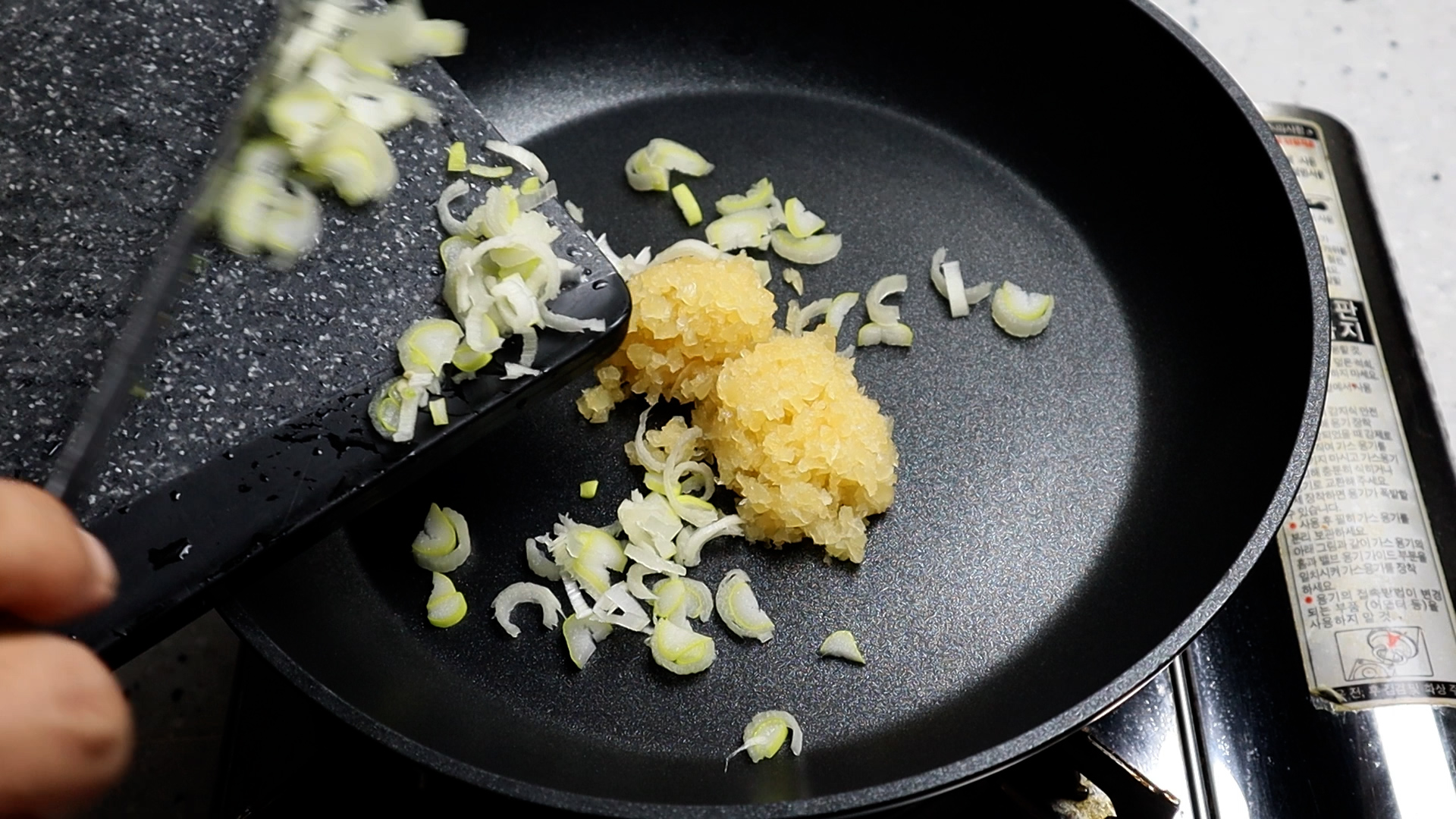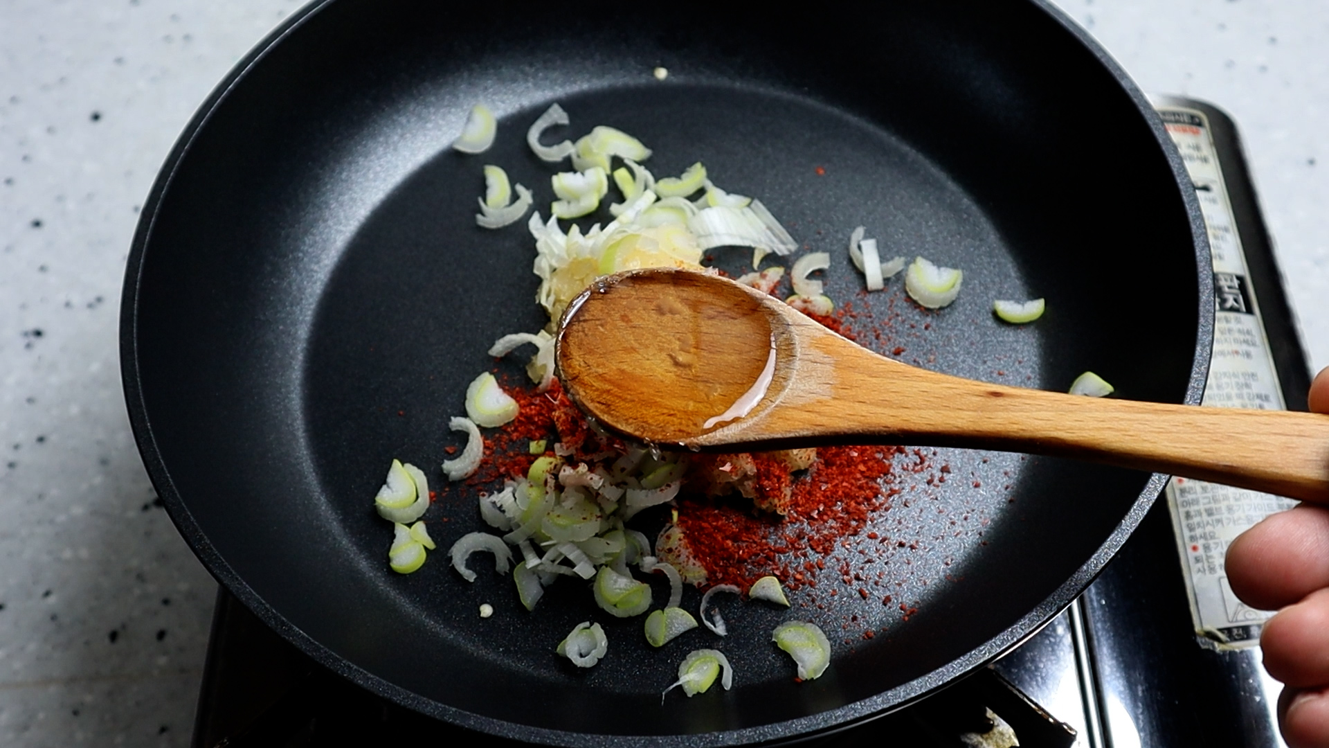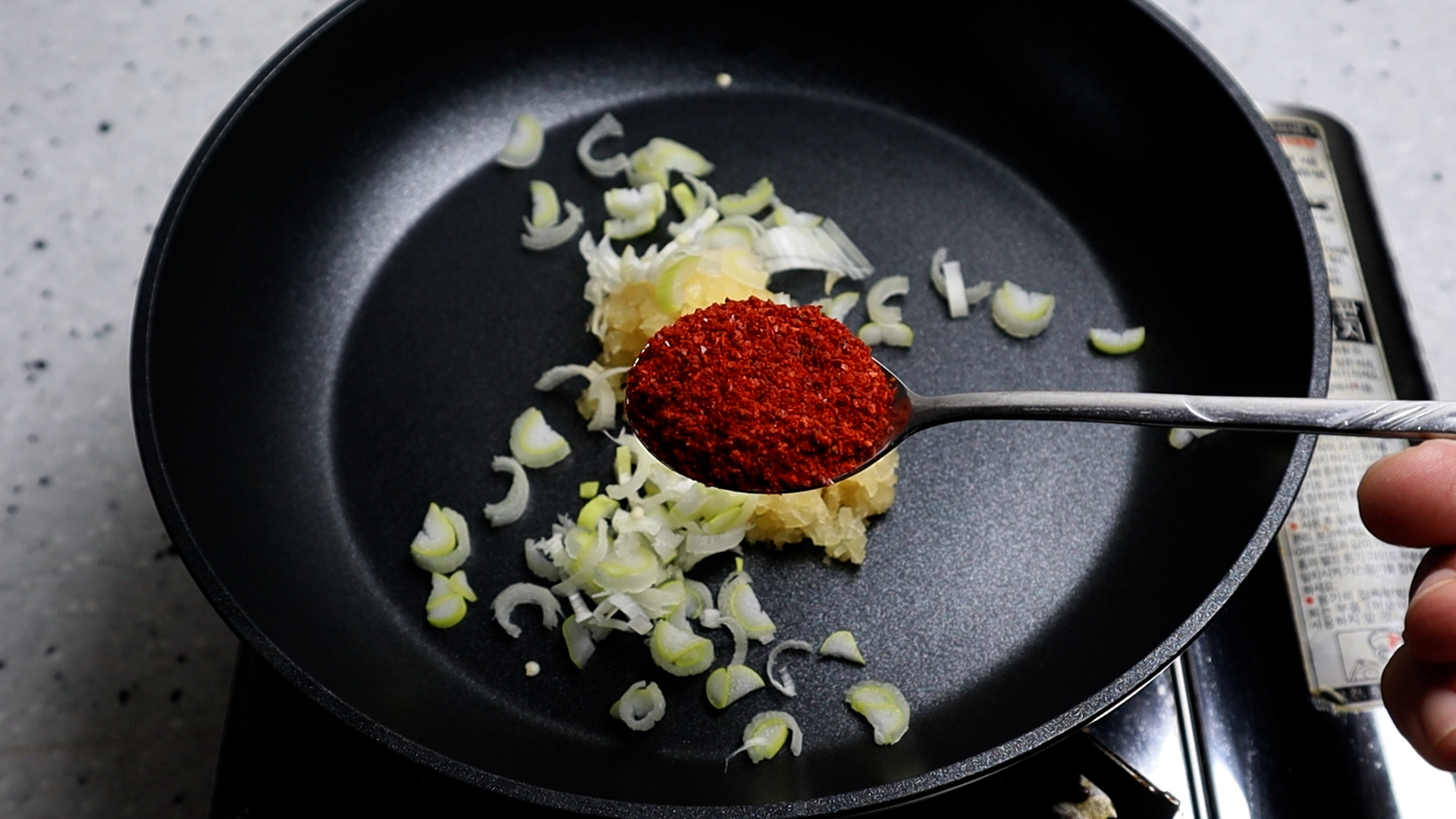 3. 팬에 간마늘과 다져놓은 대파를 넣고 고춧가루 그리고 식용유를 부어주세요. 고춧가루는 중간입자 고춧가루를 사용해주시는게 좋습니다.