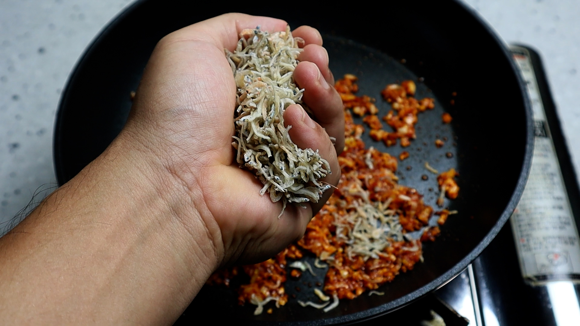 5. 잔멸치를 넣어주세요. 주먹으로 이렇게 그득그득 넘치게 잡으면 25g 정도가 되더라고요.