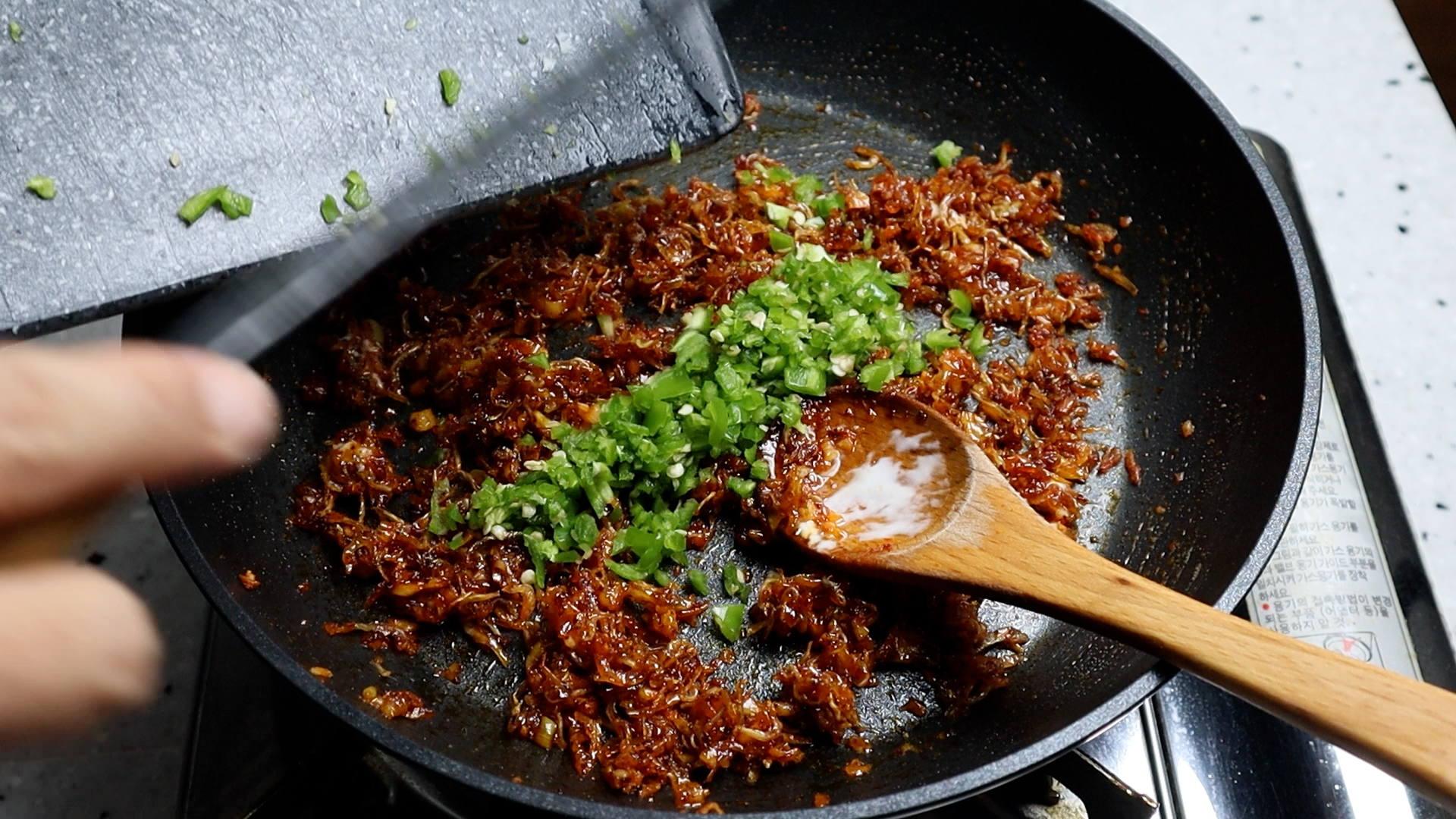 9. 땡초를 넣은 다음 강불로 불을 올리고 10~20초만 가볍게 볶아주세요.