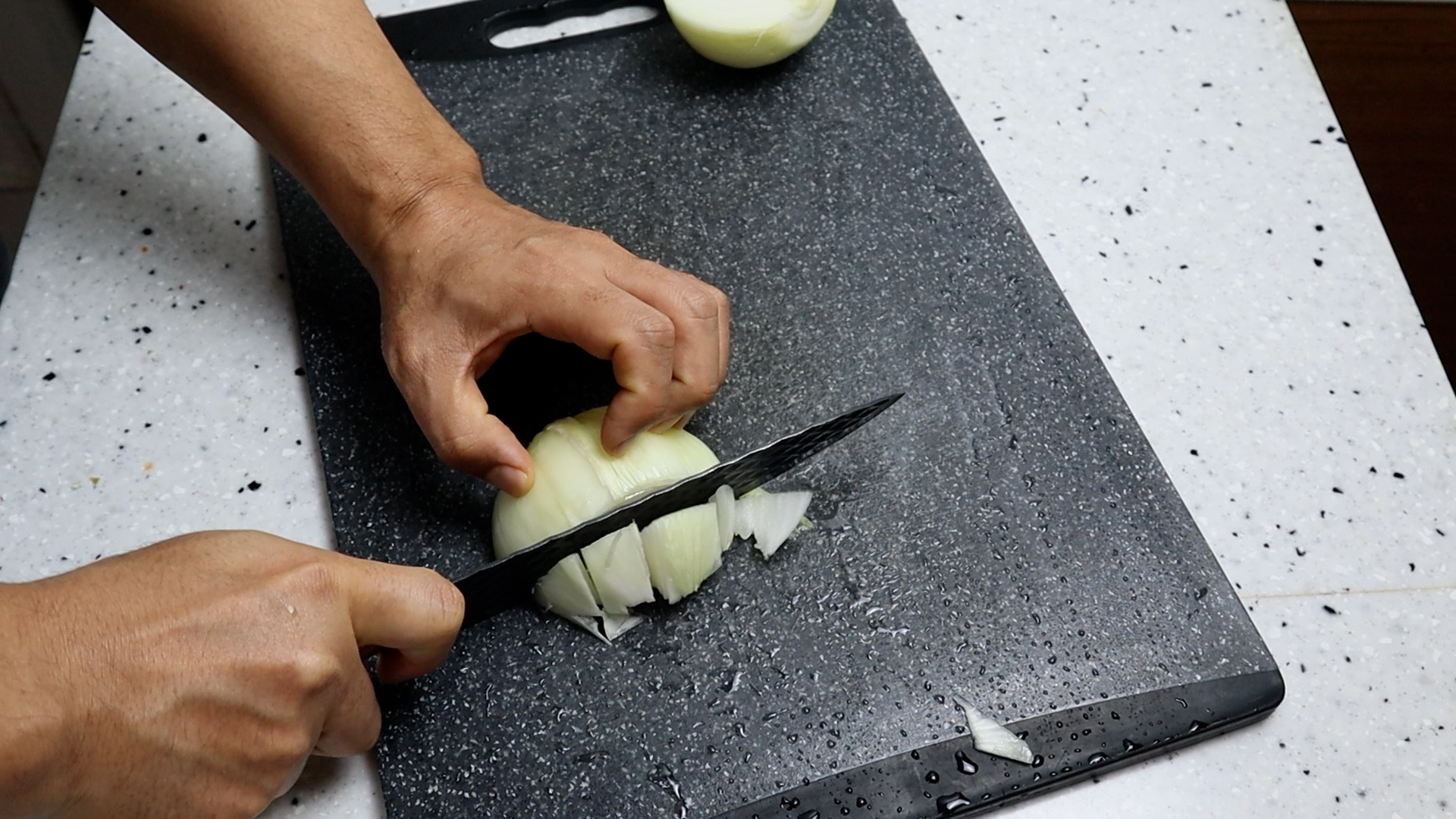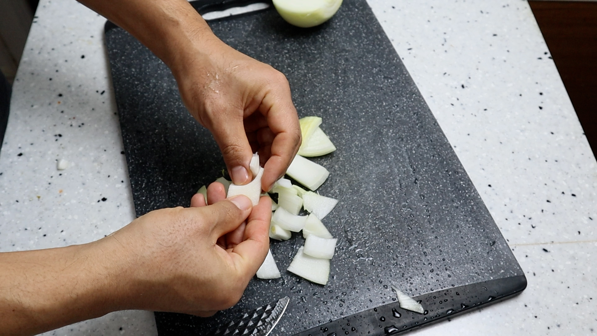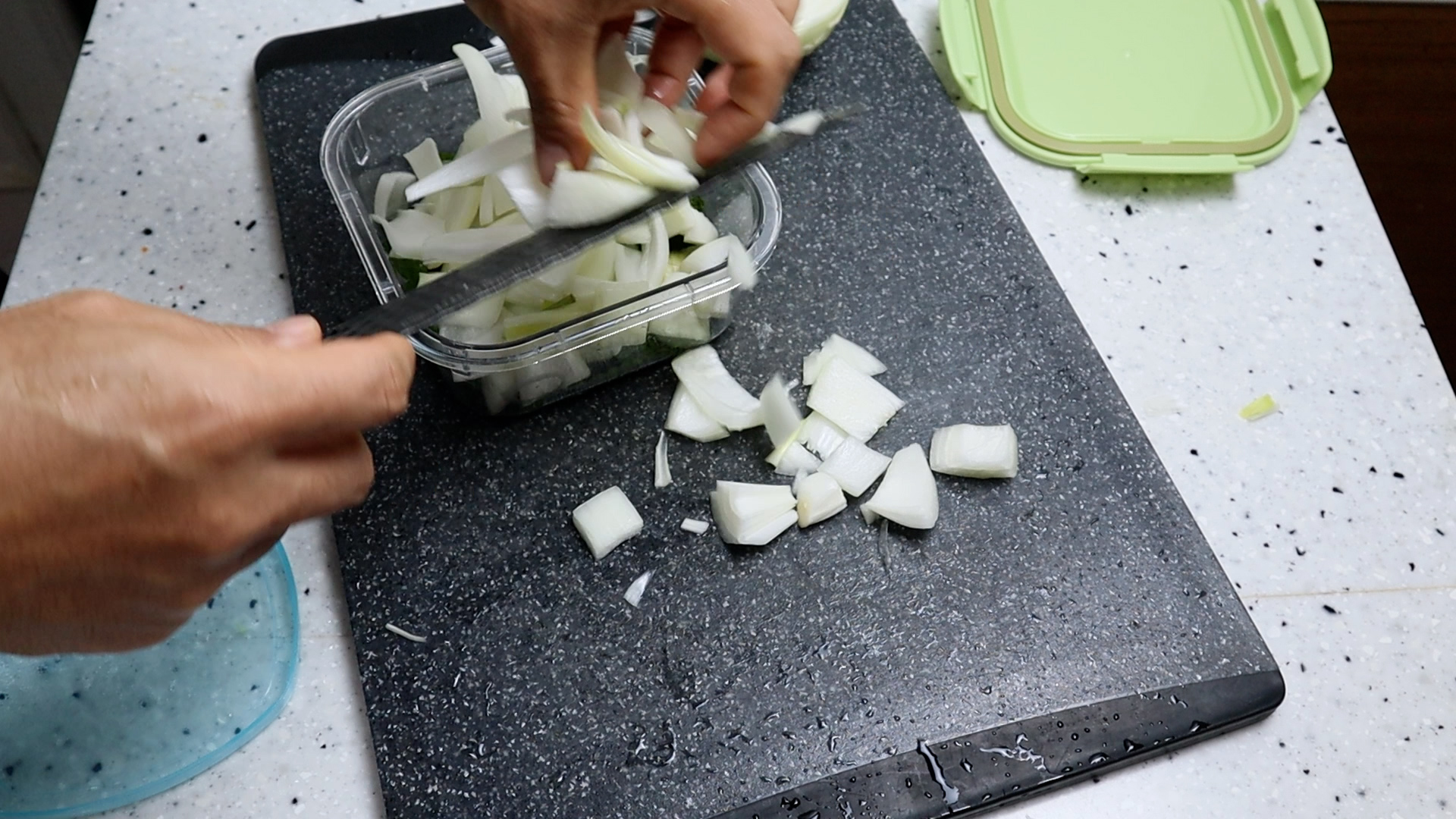 1. 이 레시피는 양파양을 원하는 만큼 준비하면 되는 방법입니다. 저는 양파는 1개 썰었는데 여러분은 더 많이 준비하셔도 됩니다. 양파는 가로세로 대략 3~4cm 정도 나오게 썰어주세요.