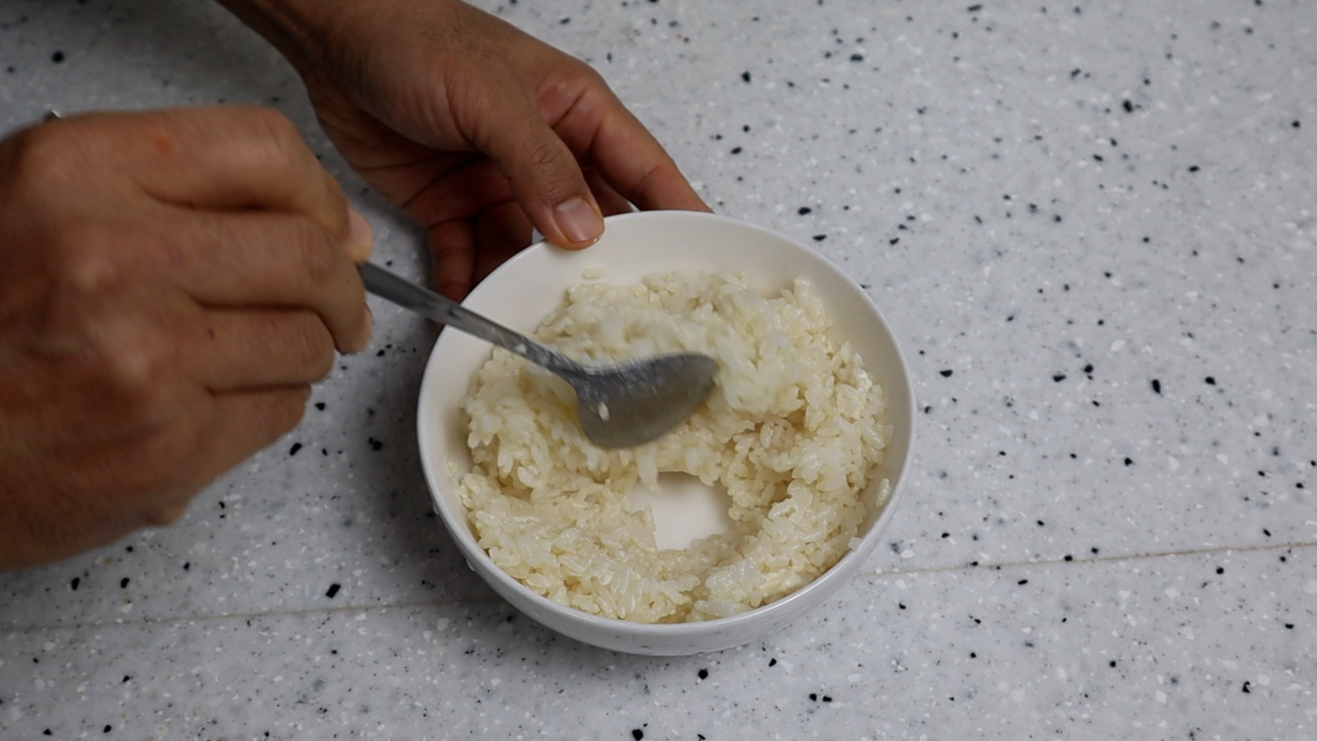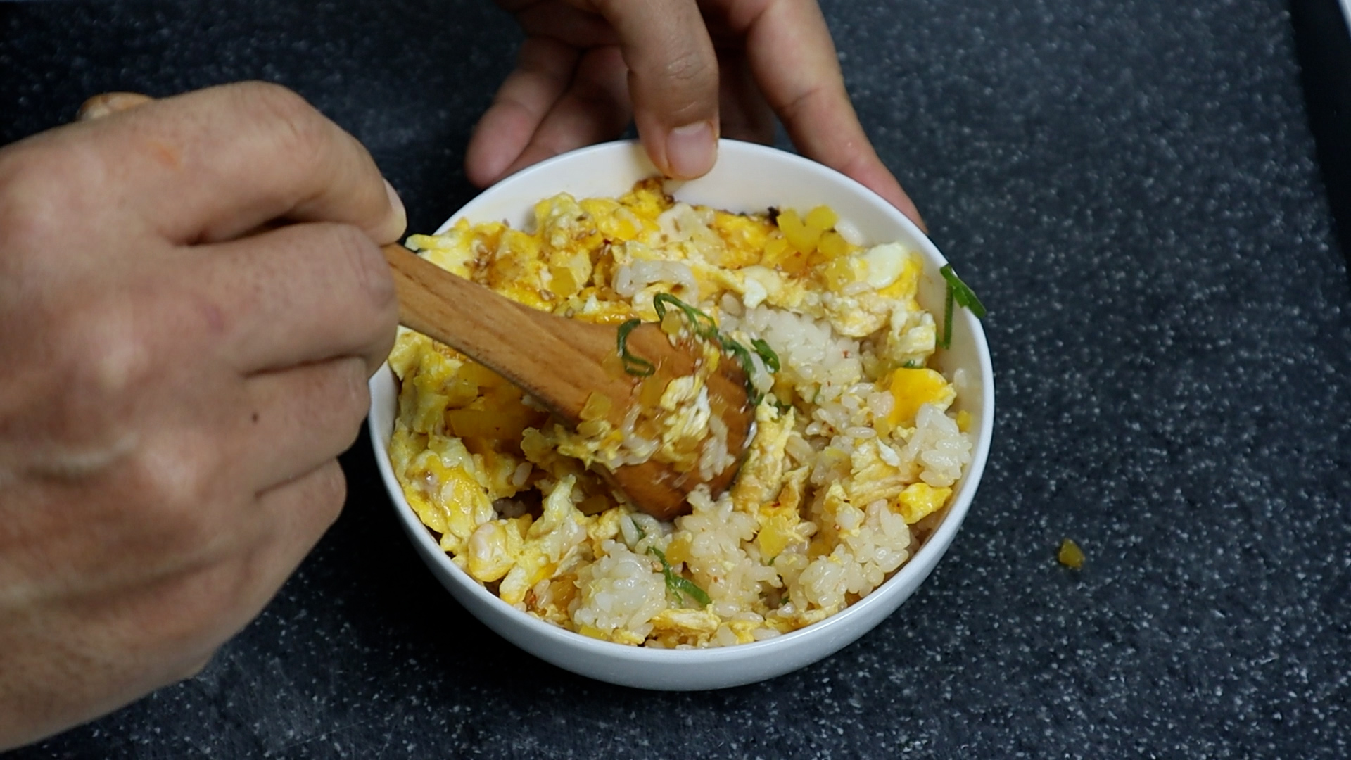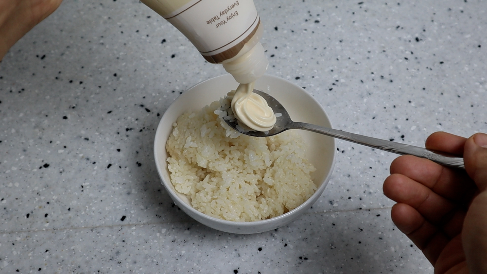 11. 밥 1공기 분량에 마요네즈 1스푼을 뿌려주시고 골고루 섞어주세요. 밥알에 고소한 마요네즈가 미리 한번 코팅 되어 주면 밥알을 씹을때 고소한맛이 훨씬 좋답니다.
