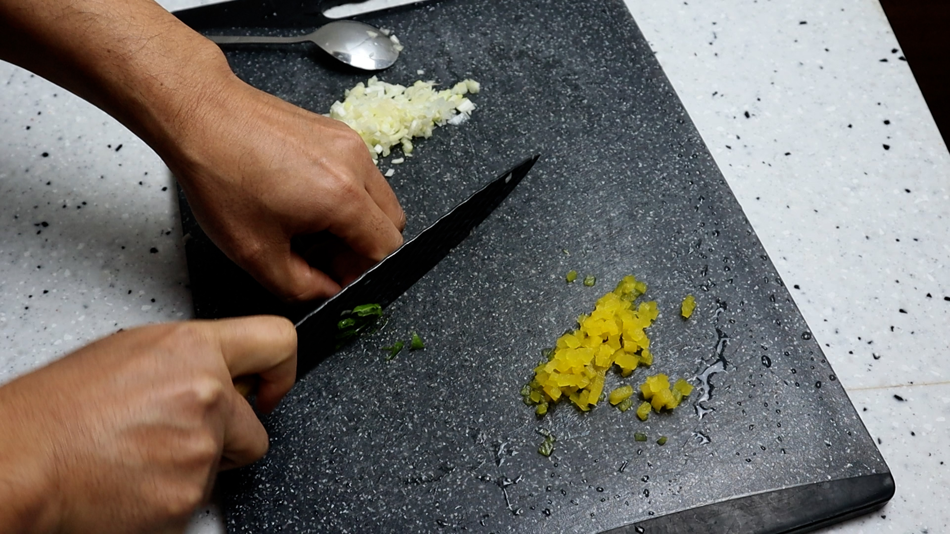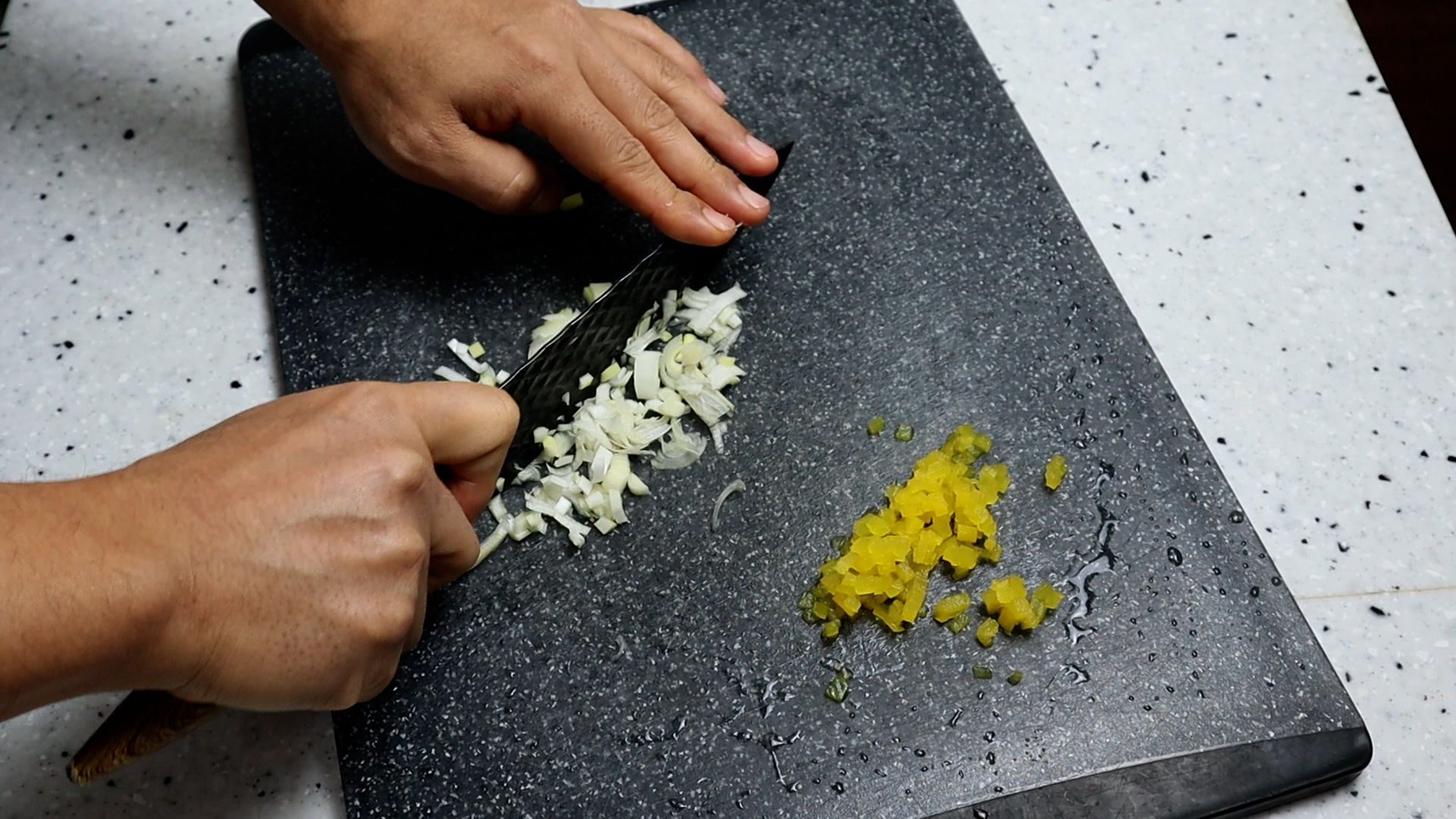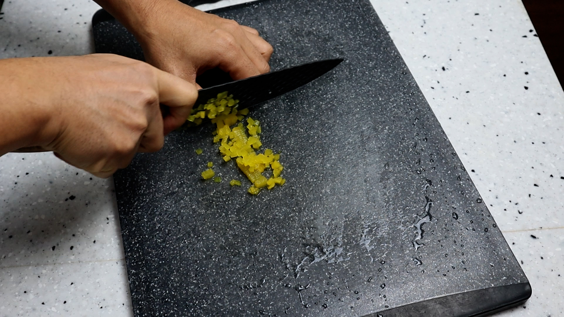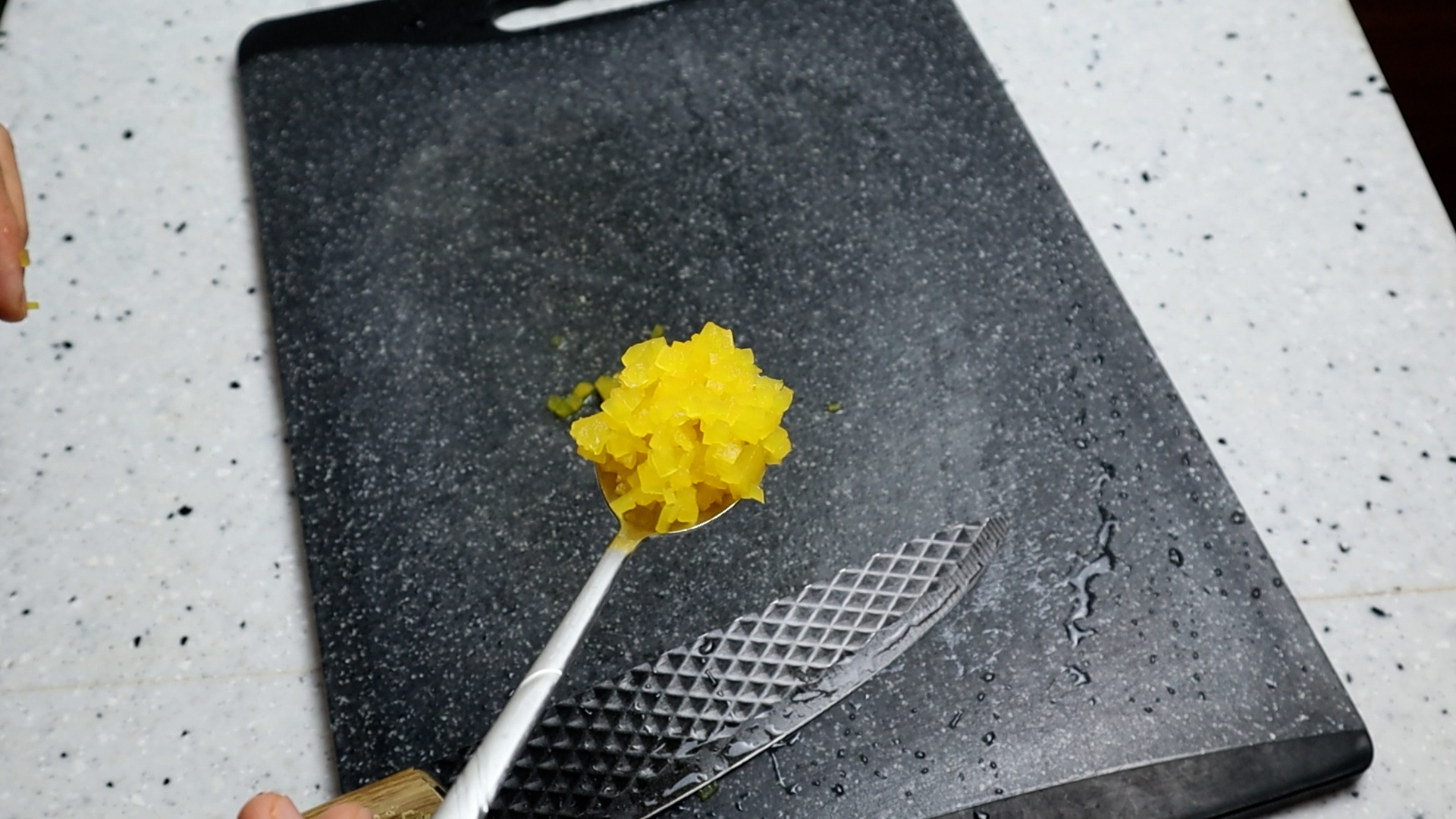 1. 김밥용 단무지 1줄 무게로 대략 20g 을 잘게잘게 다져주세요. 단무지가 없으시면 피자에 딸려오는 피클도 괜찮고 짜장면 시킬때 단무지 많이주세요! 를 외쳐서 활용해보시는것도 좋습니다! 잘게 다져서 크게 1큰술 정도랍니다.