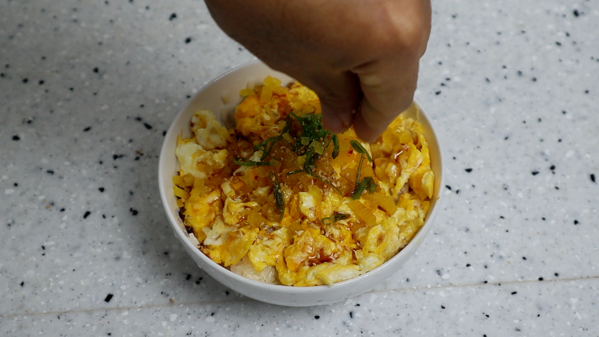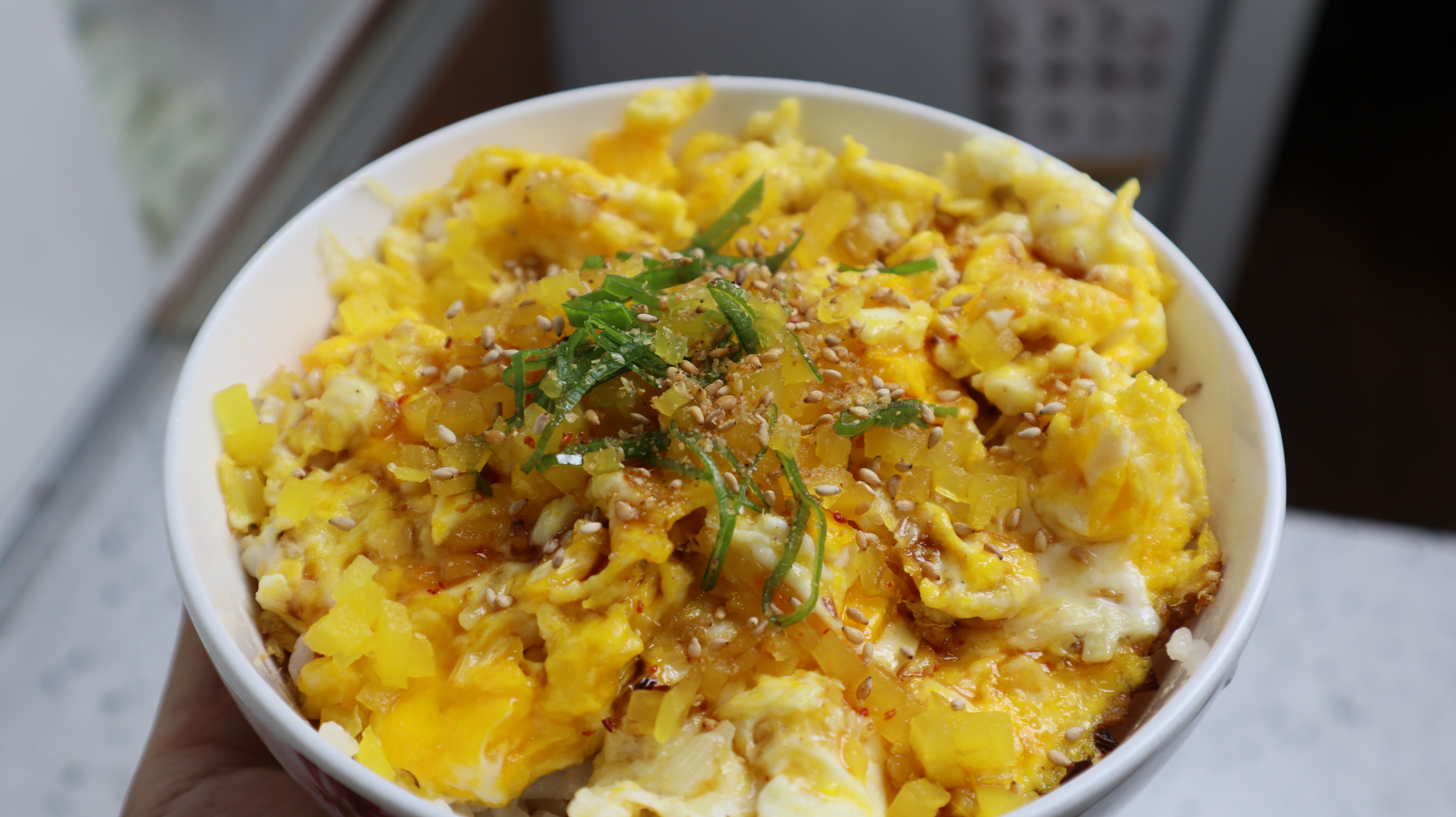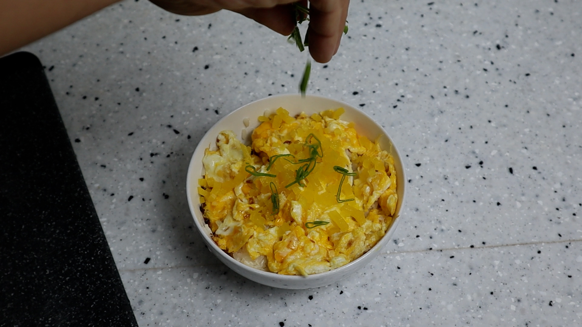 12. 밥위로 계란을 덮어주시고 썰어놓은 단무지 그리고 대파 초록대를 1줌 정도 올려주세요.
