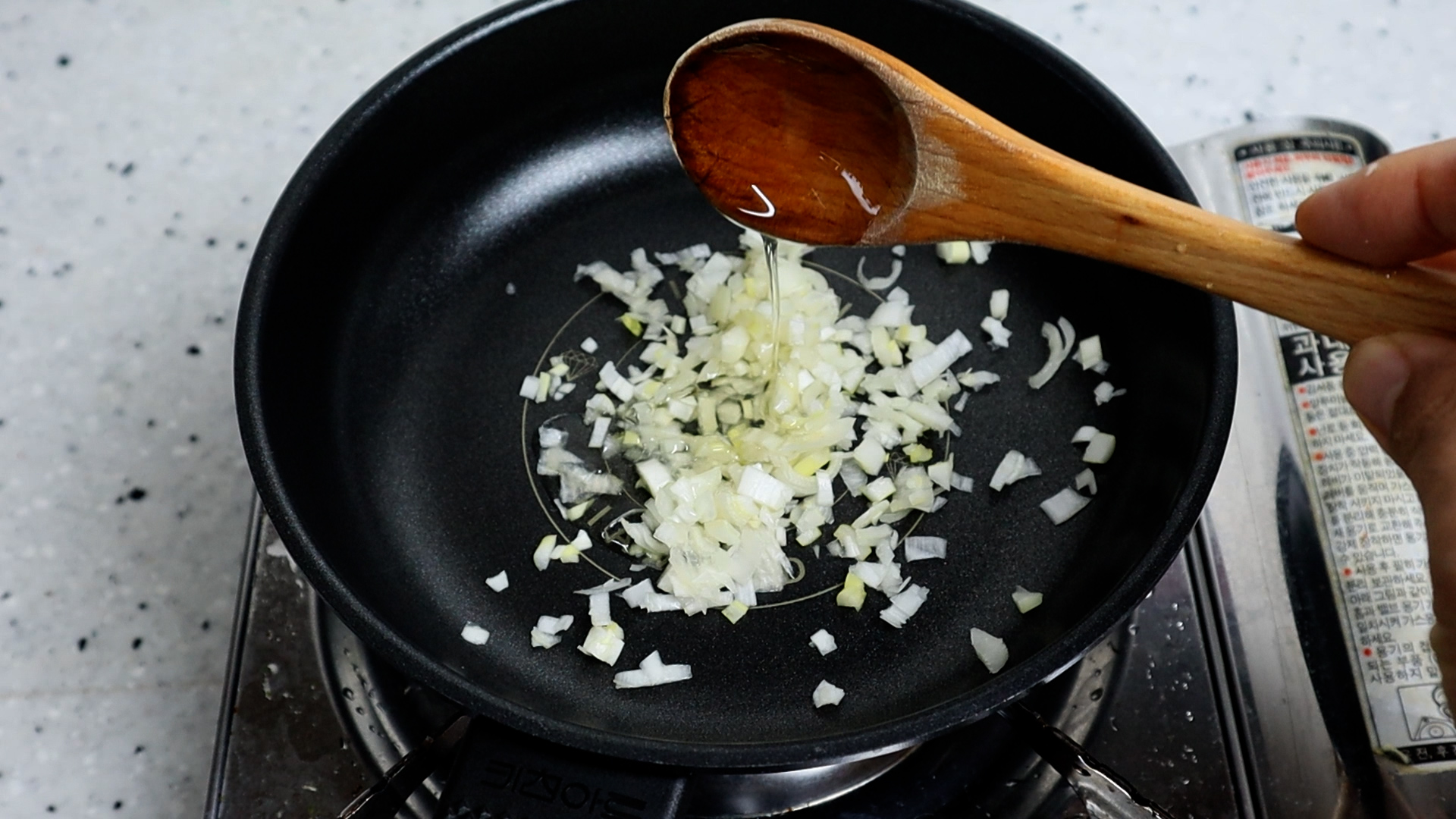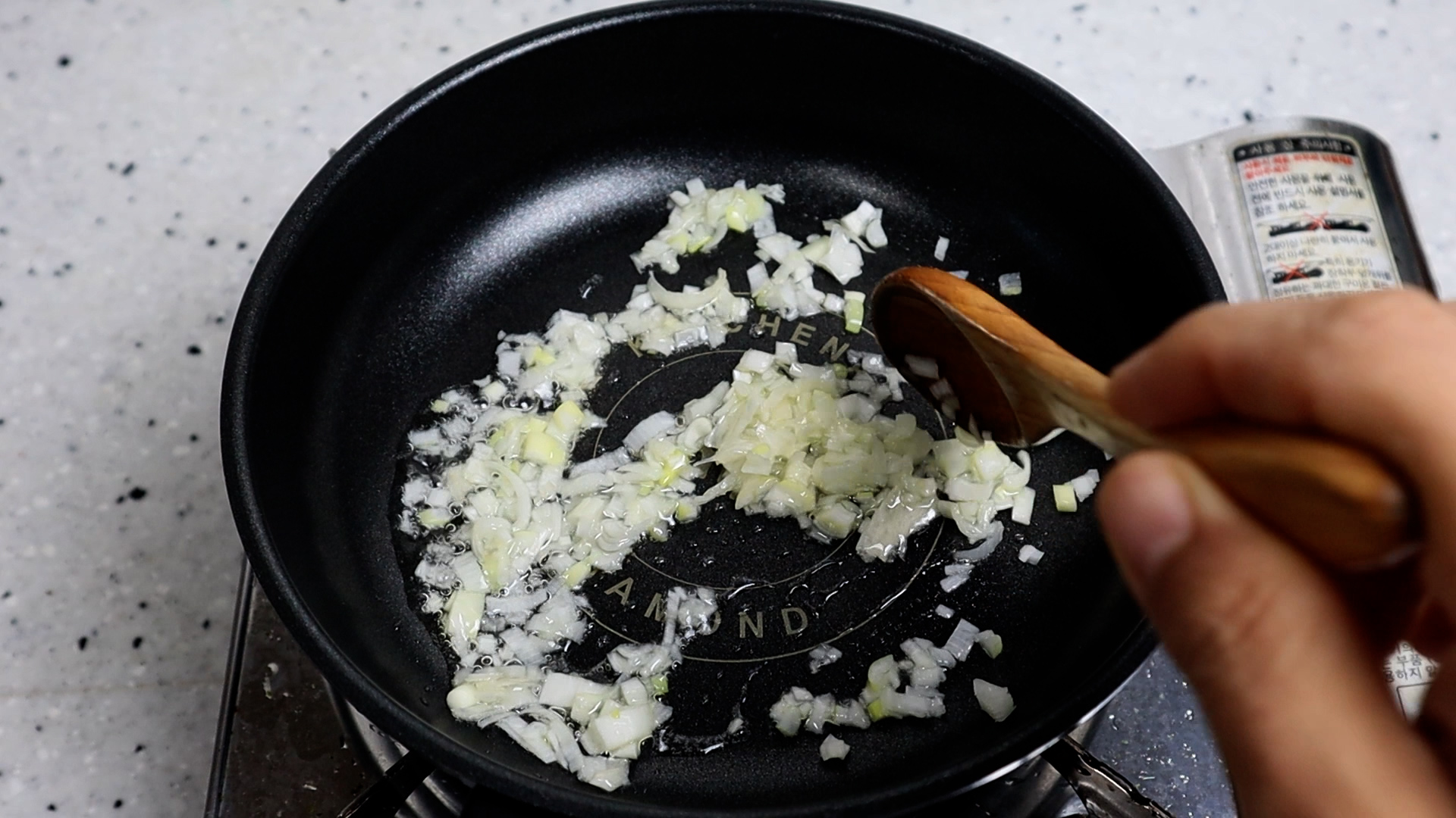 3. 작은팬에 대파와 식용유를 넣고 약불에 자글자글 소리가 나기 시작하면 1분 30초 정도를 볶아주세요.