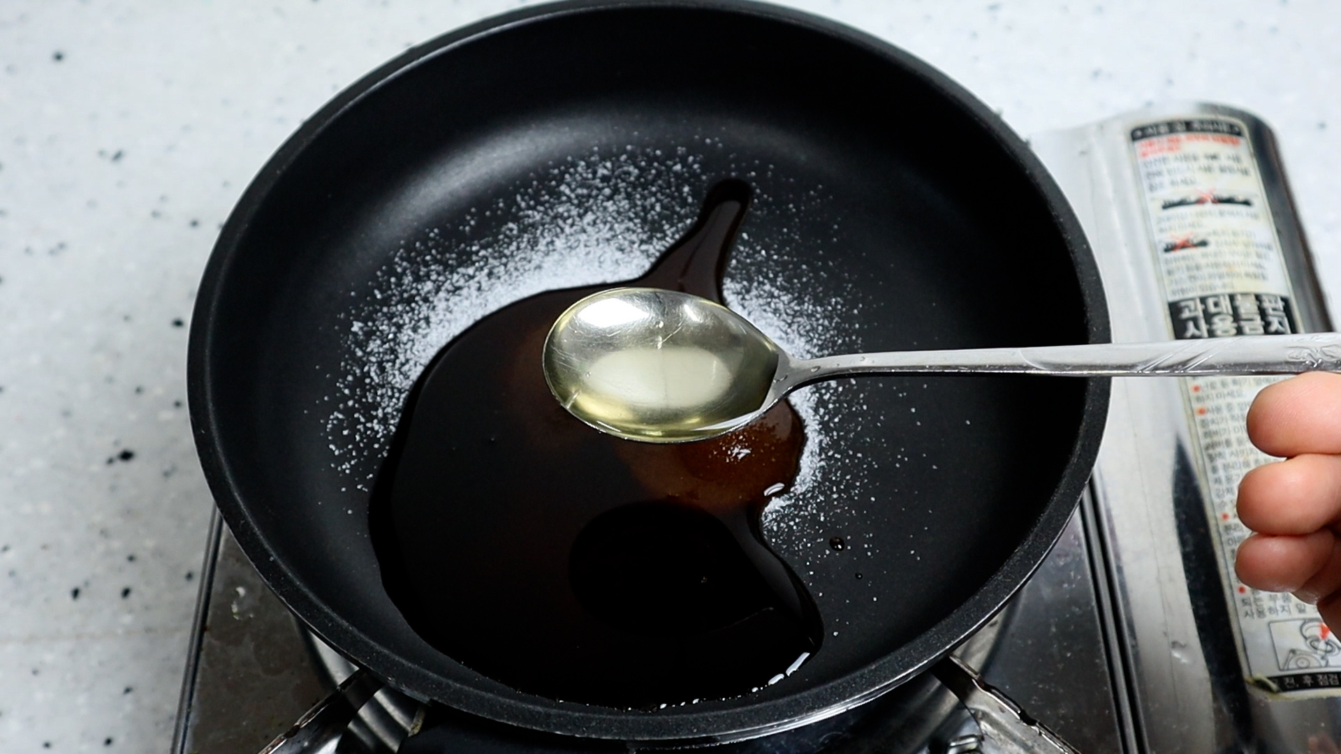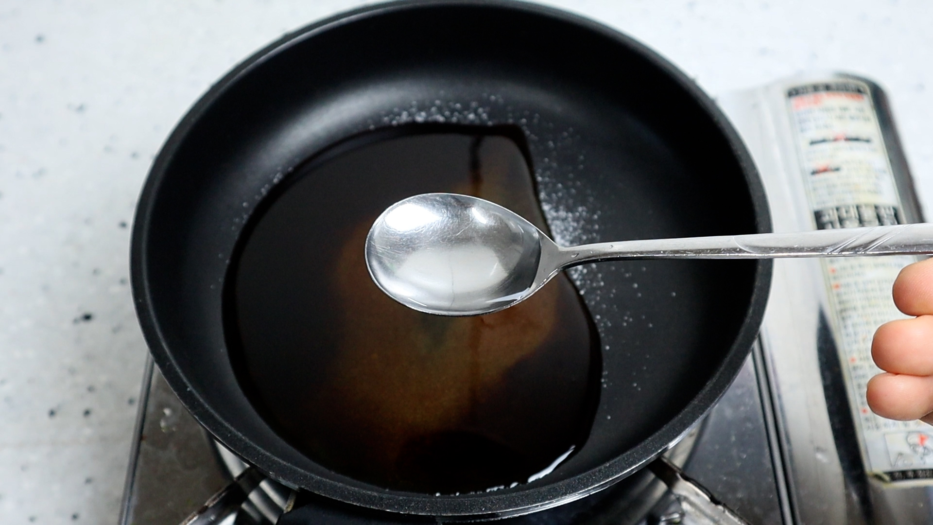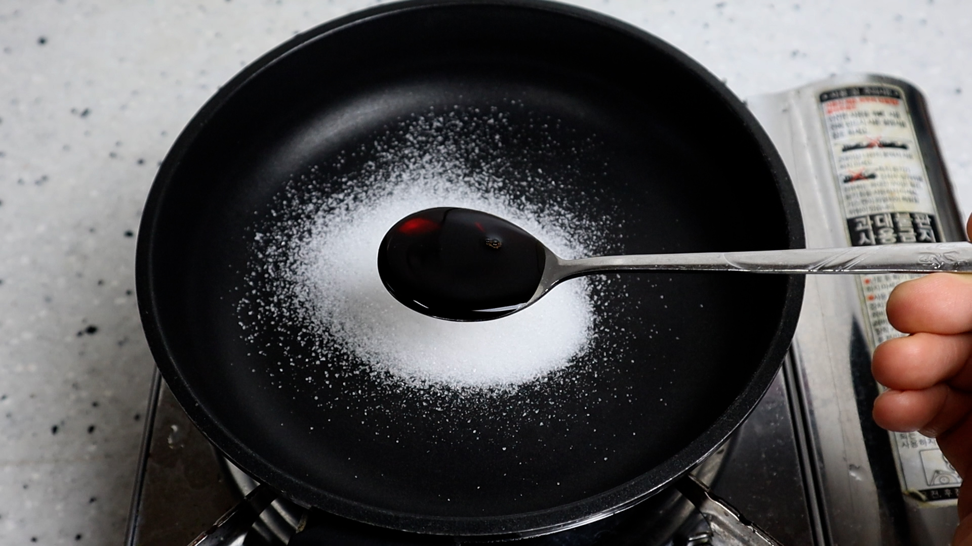 6. 팬에 양념에 적힌 재료들을 분량껏 전부 넣어주세요. 설탕은 깍아서 넣어주세요.