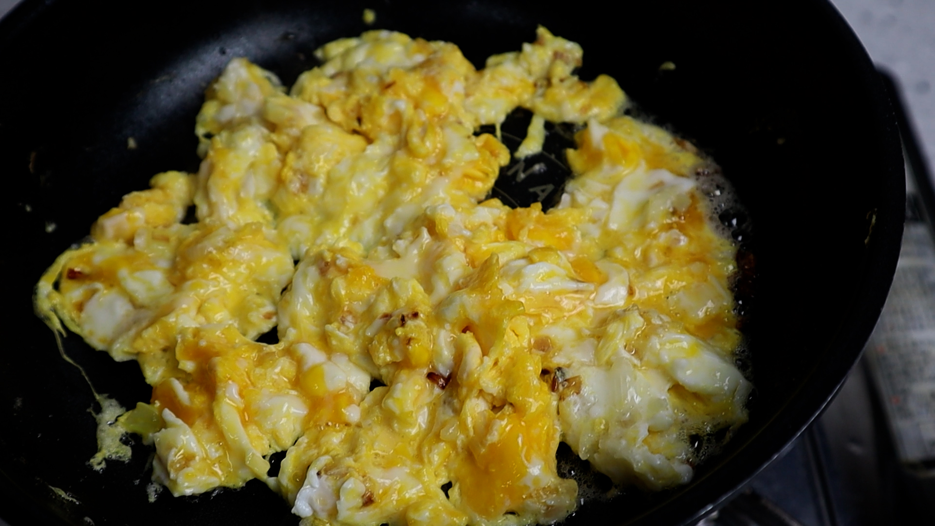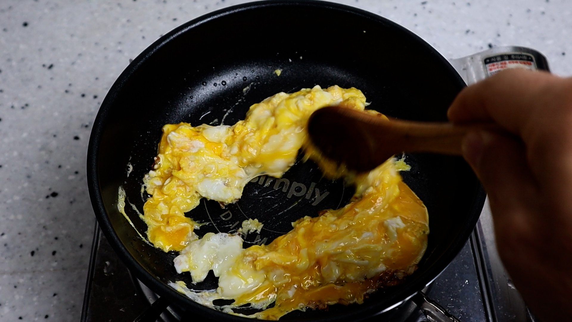 5. 계란을 골고루 섞으며 스크램블로 구워주세요. 기호에 따라 80% 정도만 익혀도 되고 빠싹! 익히셔도 됩니다. 저는 80% 정도만 익혔어요.