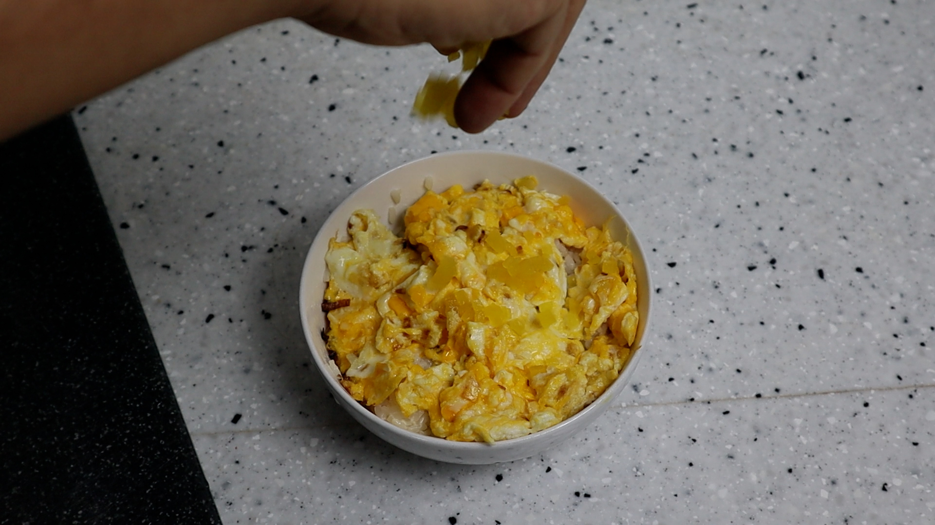 4. 맛소금 1꼬집을 뿌린 다음에 계란 2알을 까주세요. 맛소금을 먼저 집어서 기름에 뿌린 이유는 요즘 계란 잡고 손 안씻으면 좀 그렇잖아요~ 그런데 계란까넣고 맛소금을 잡으려면 손에 물기 때문에 소금이 나중에 뭉치거나 변질 될수 있어서 먼저 뿌린 다음 계란을 까넣은거에요~