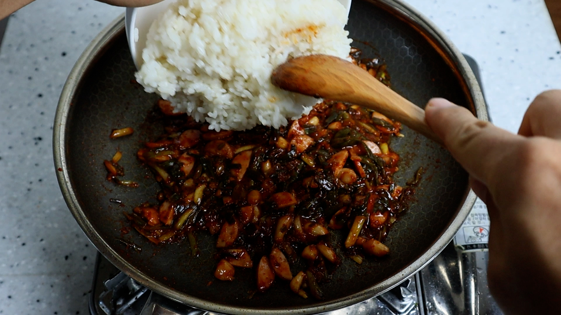 14. 중불 유지하고 골고루 섞으면서 1분 정도를 볶아서 밥알에서 흰부분이 안보이게 골고루 볶아주세요.