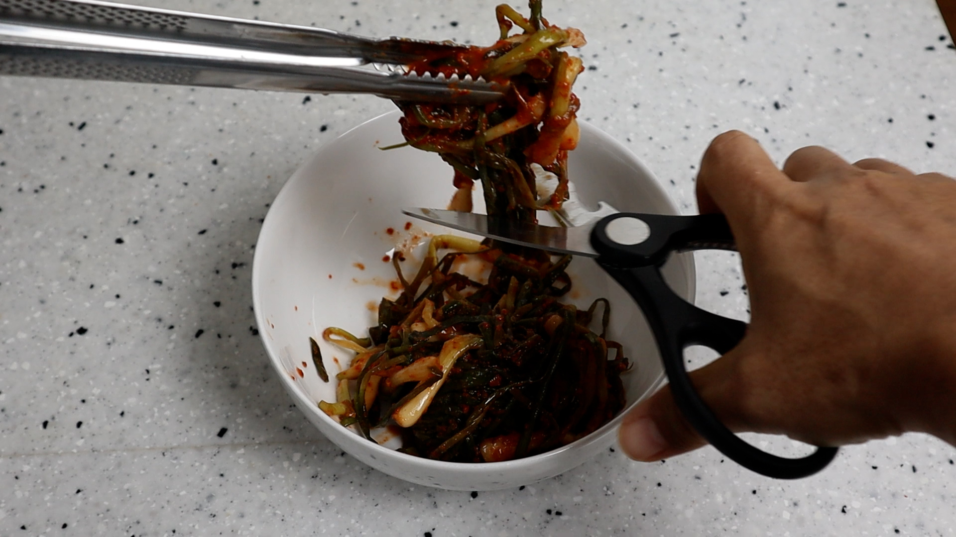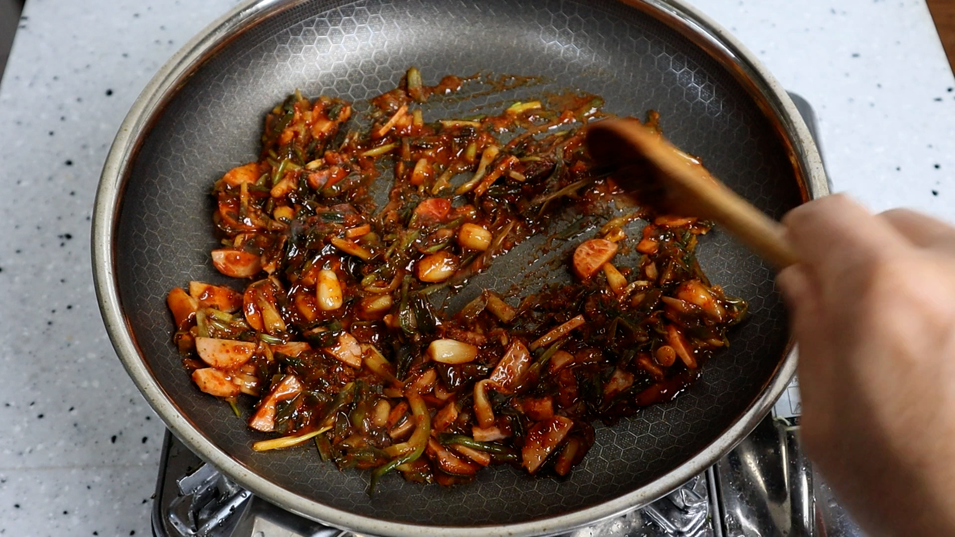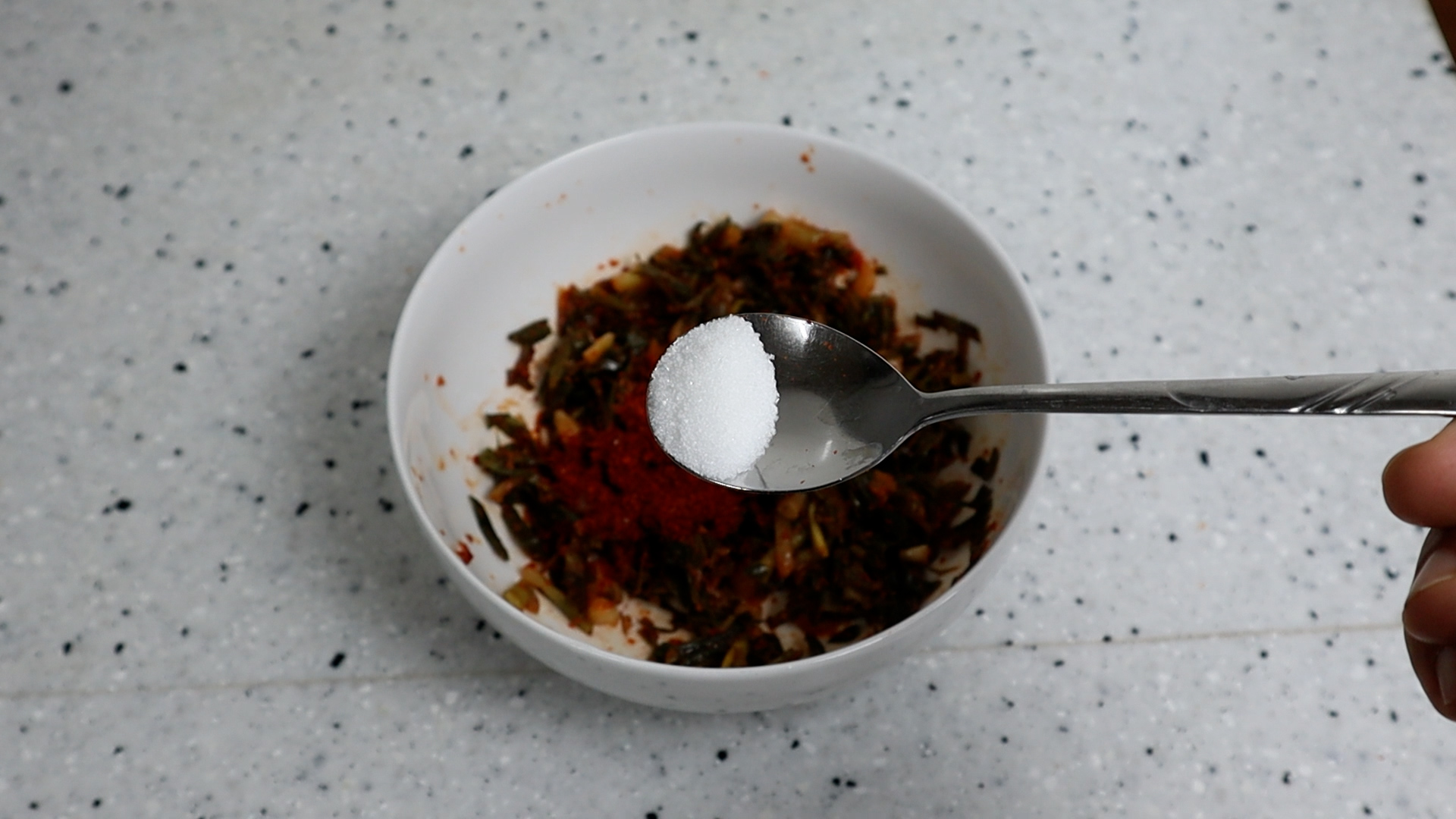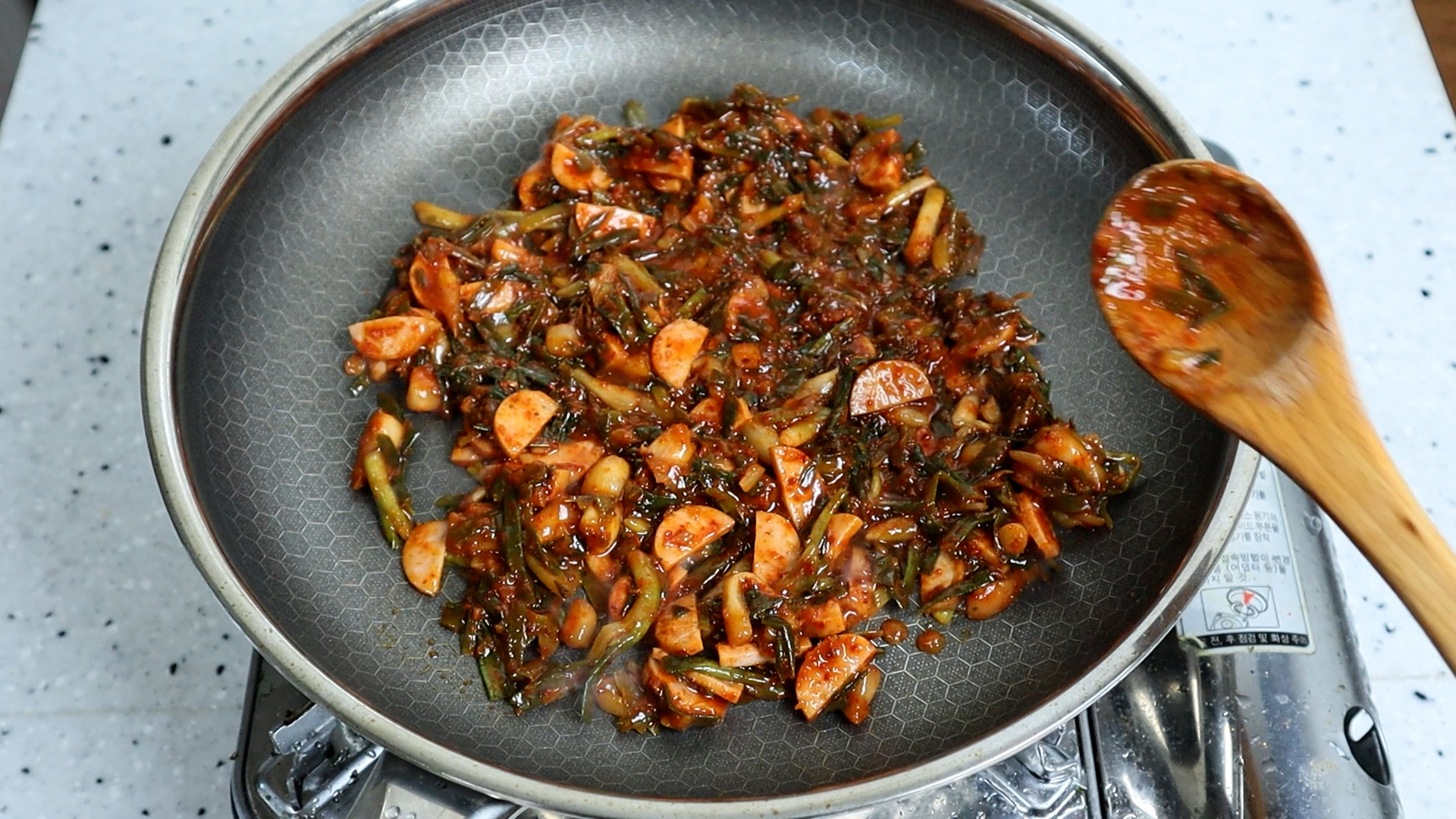 4. 파김치 특유의 향을 살짝 누르고 다른재료와 전체적 색감이 맛있게 복이려면 설탕을 살짝만 넣어주시는게 좋습니다.