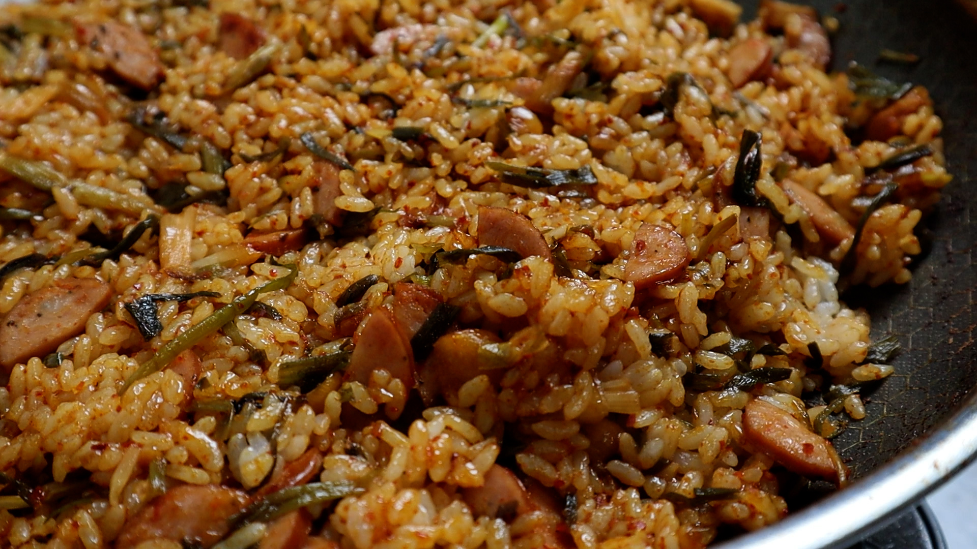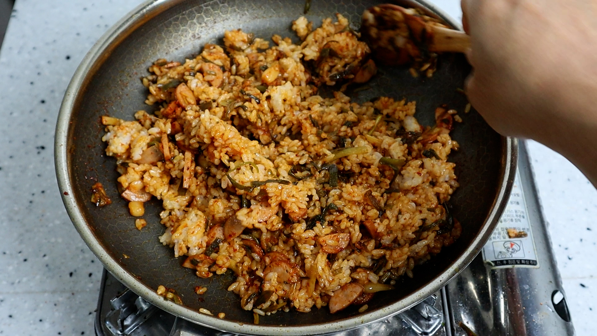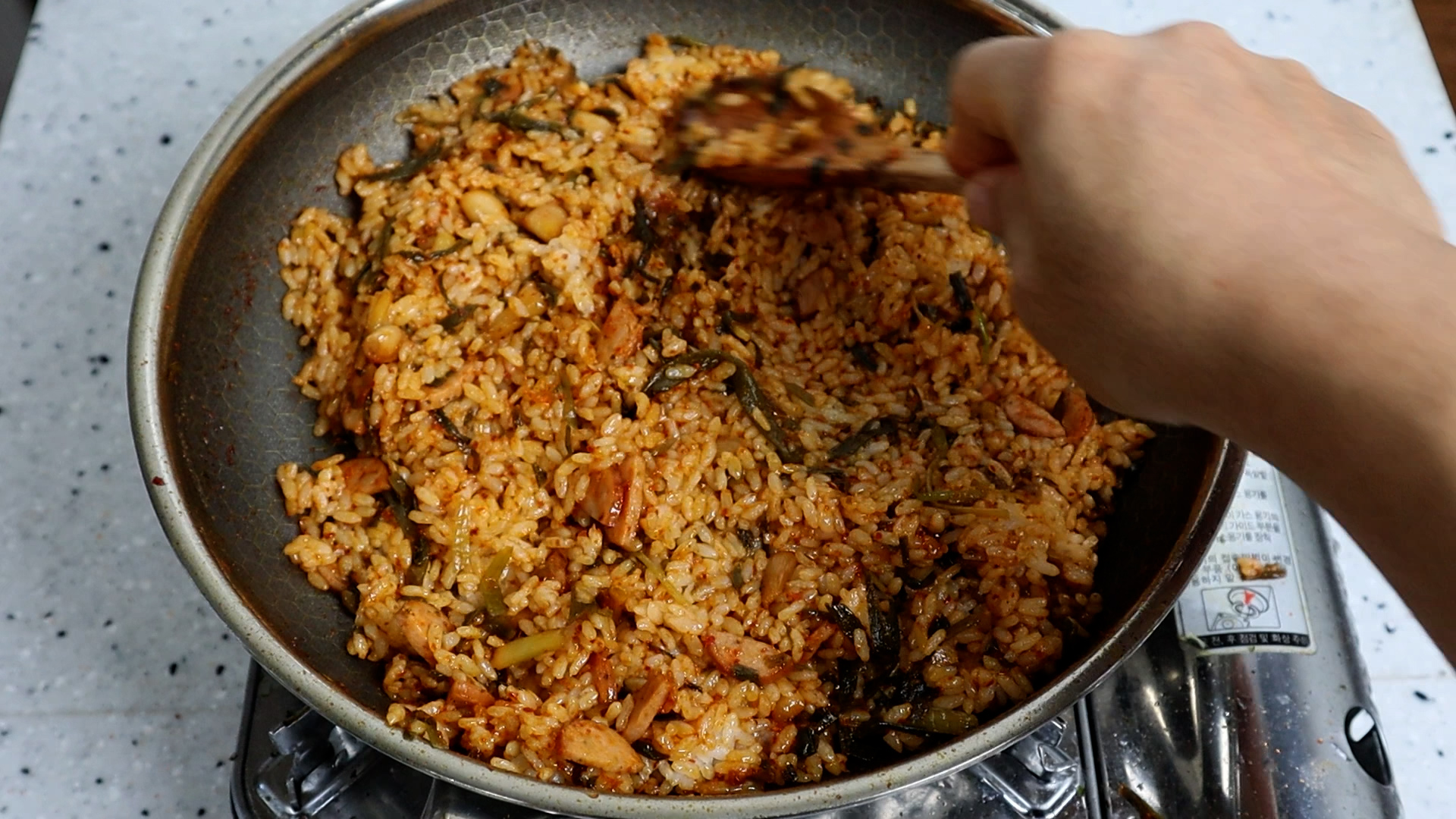 15. 골고루 펼쳐서 20~30초 눌리는 시간을 주세요. 볶음밥은 밥과 양념이 팬에 눌리는 시간을 주면 훨씬 맛있답니다~ 이걸 최소 1차례!! 또는 태우지 않는 한도내에서 2~3차례 반복해보세요.