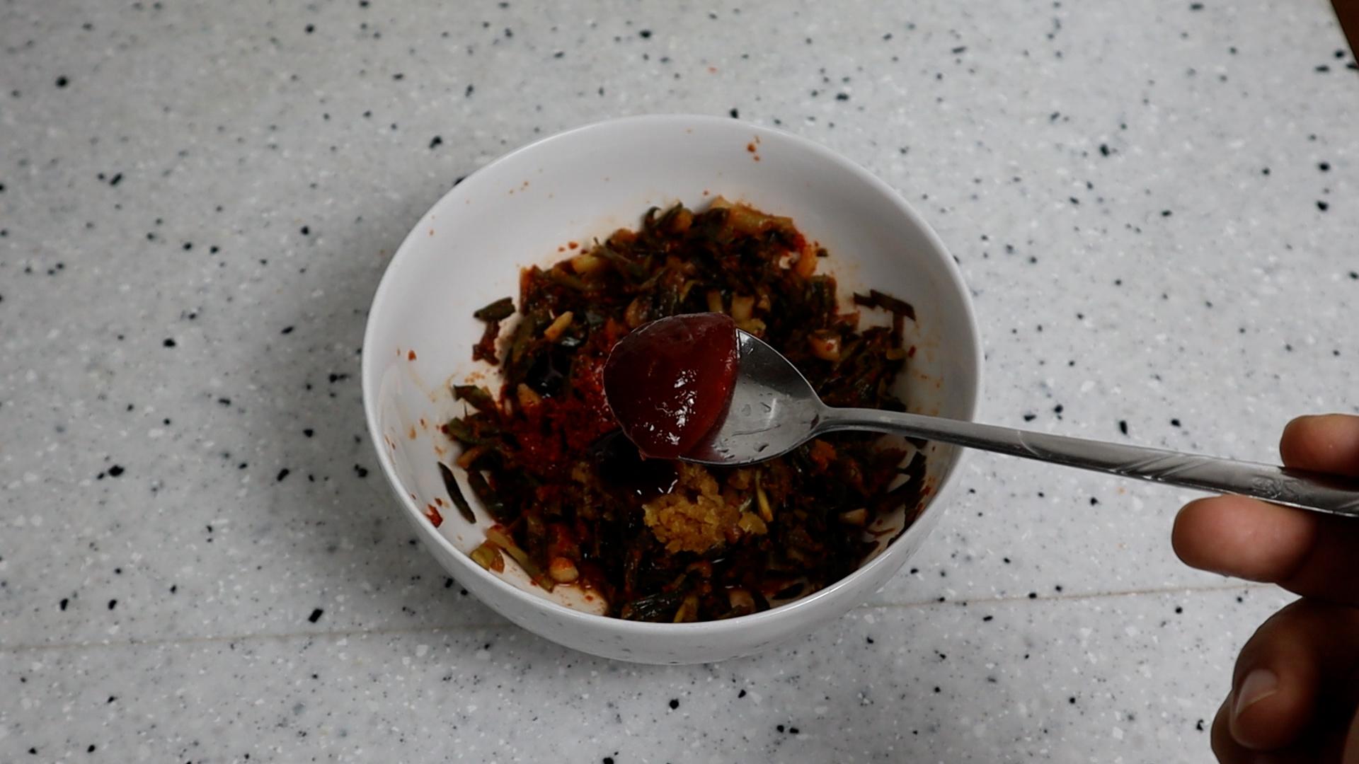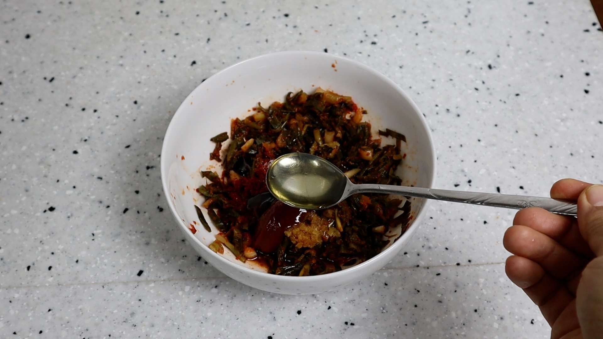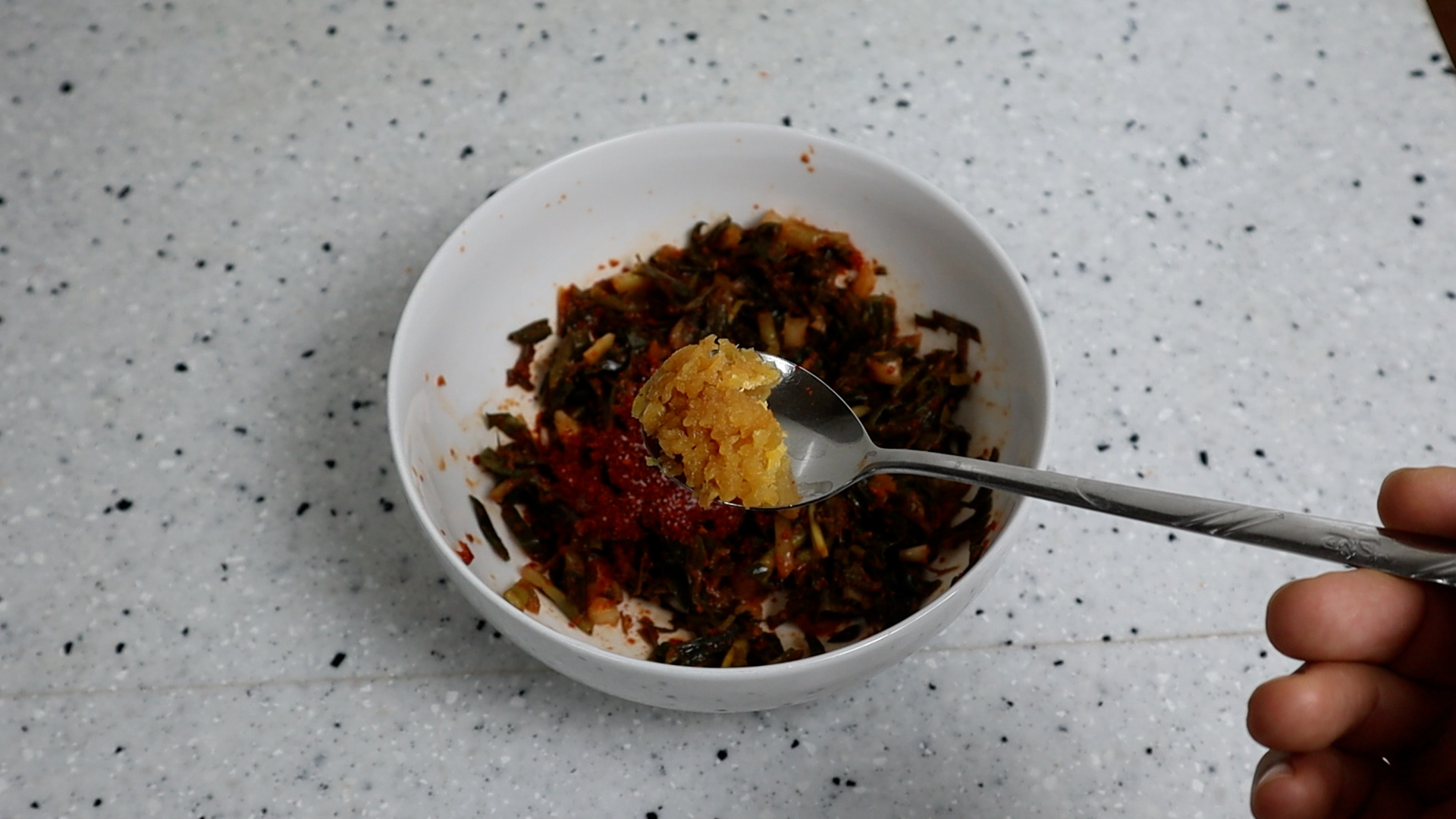 3. 잘게 자른 김치에 양념란에 적힌 재료들을 분량껏 전부 넣어주세요. 고춧가루는 중간입자 고춧가루를 사용해주세요.