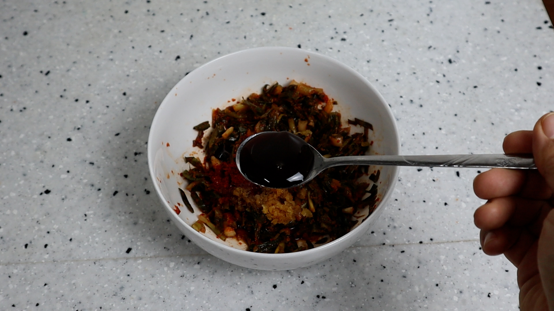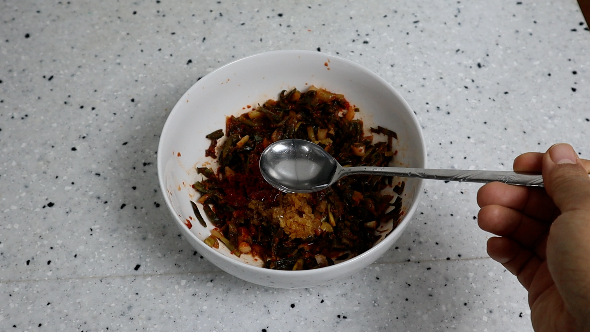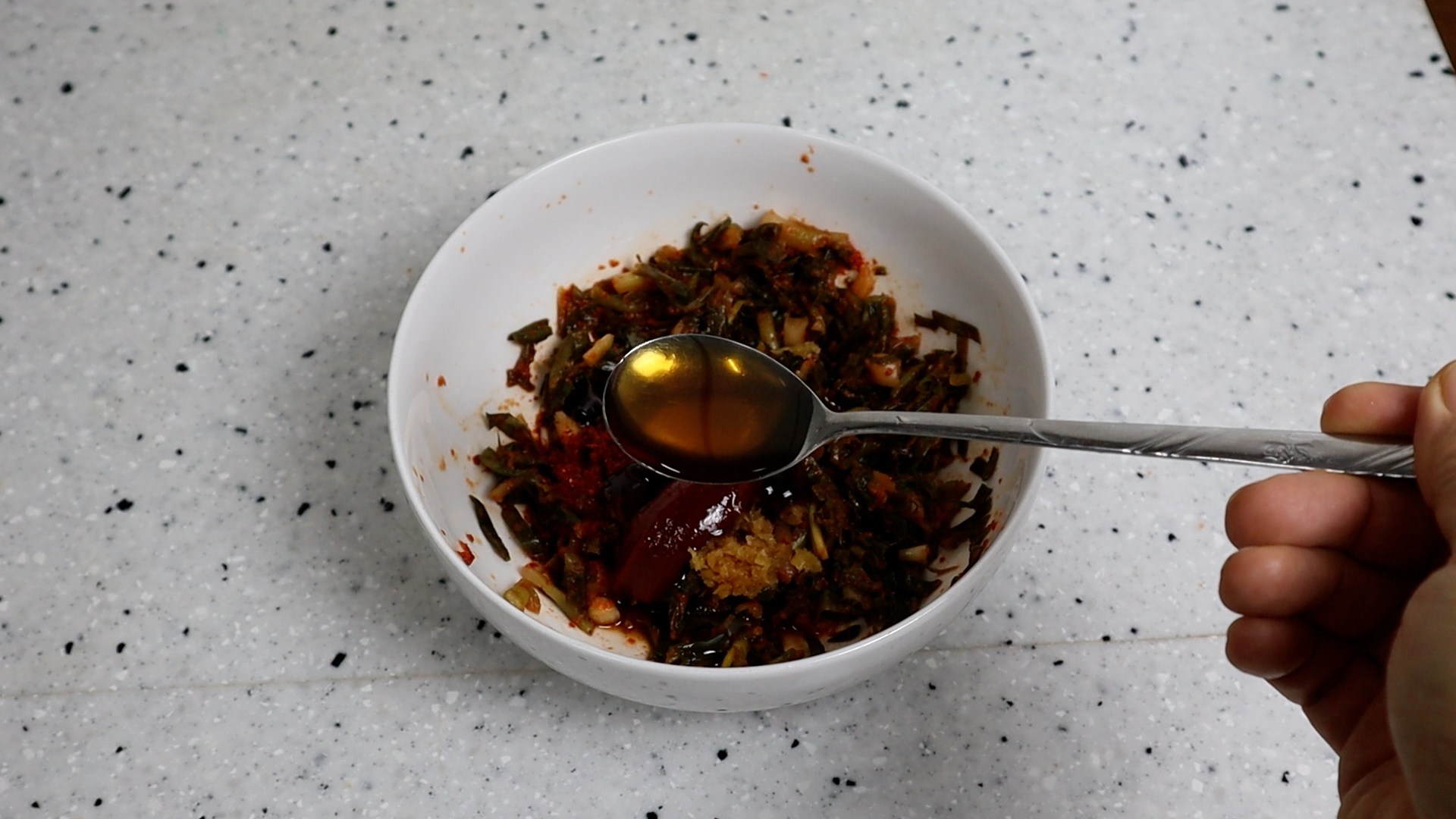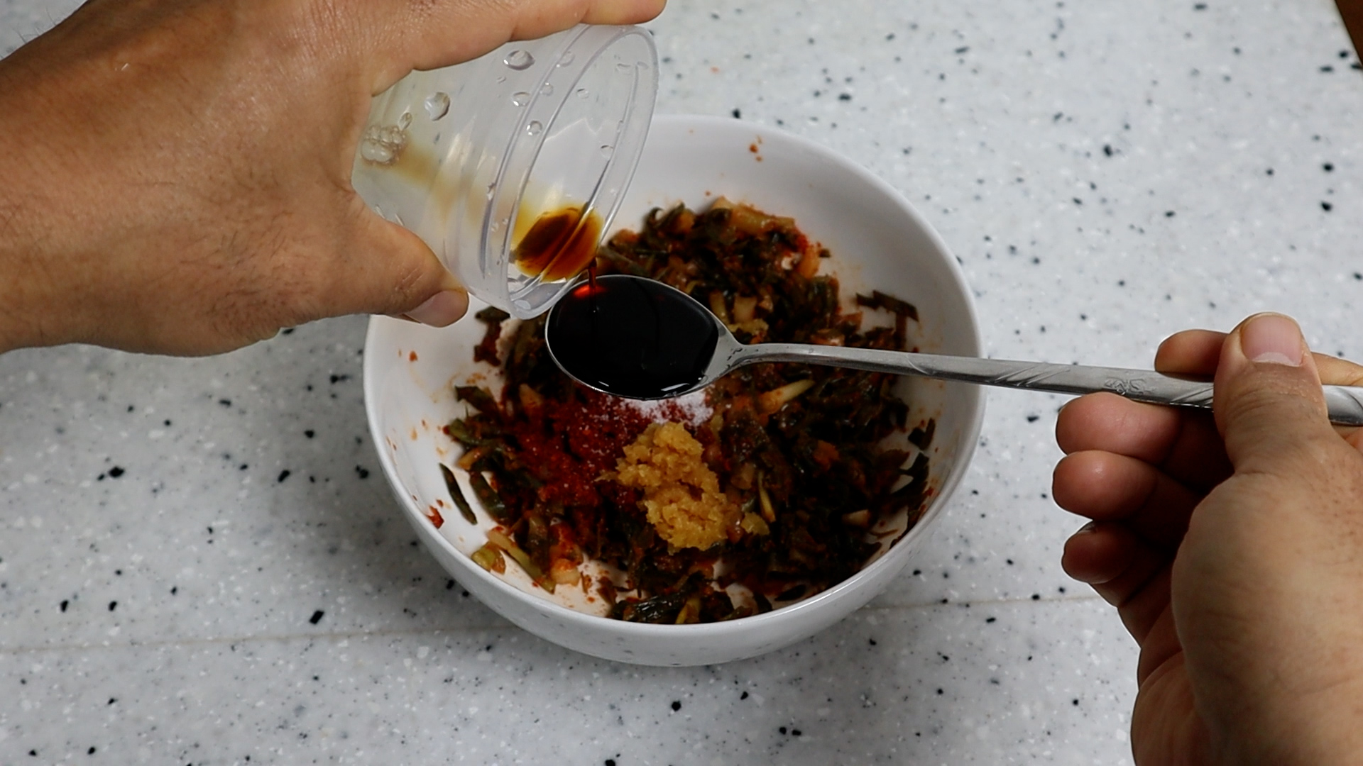7. 굴소스를 넣어 감칠맛 나는 짠맛을 보태주고 배추김치 보다 양념이 살짝 약하기 때문에 고추장을 넣어 맛을 살려줄거에요.