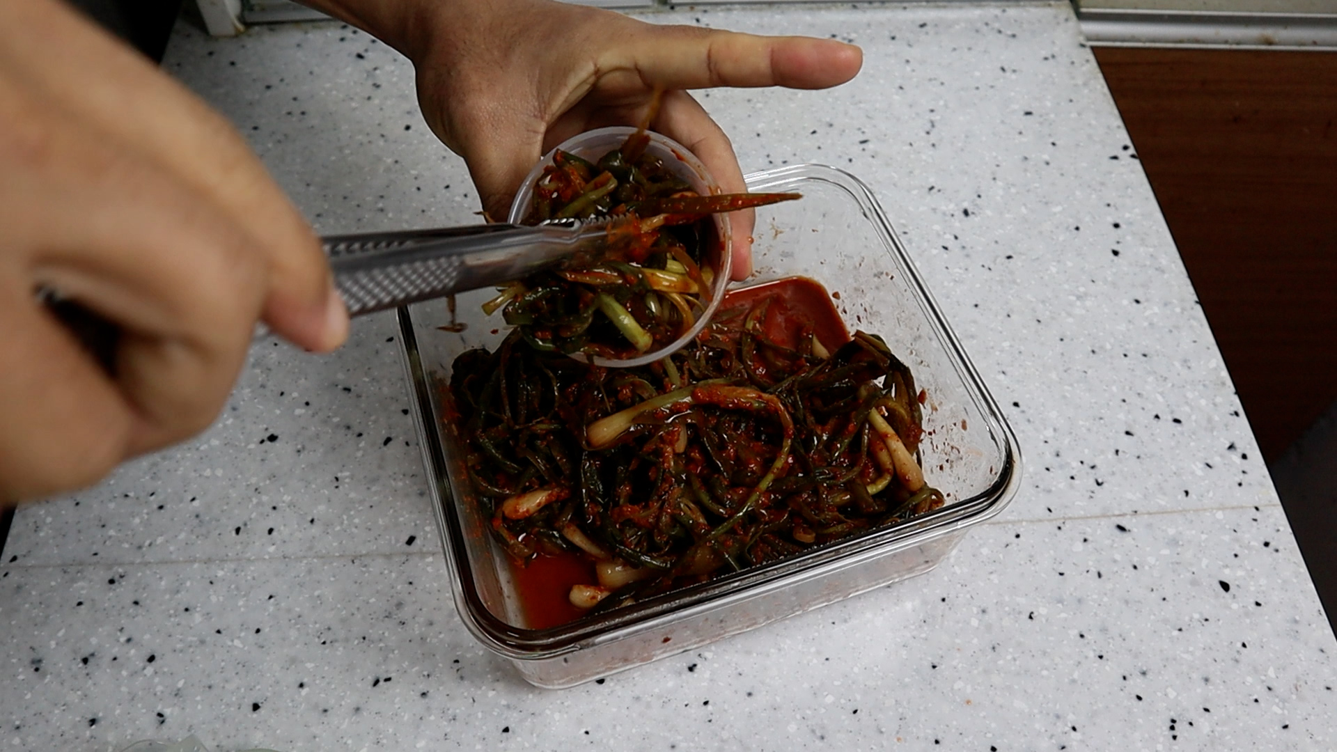 1. 가능하면 폭~~익은 파김치를 준비해주세요. 파김치를 꾹꾹 눌러 담아서 200cc 컵에 1컵 담으면 대략 150g 정도가 나온답니다~