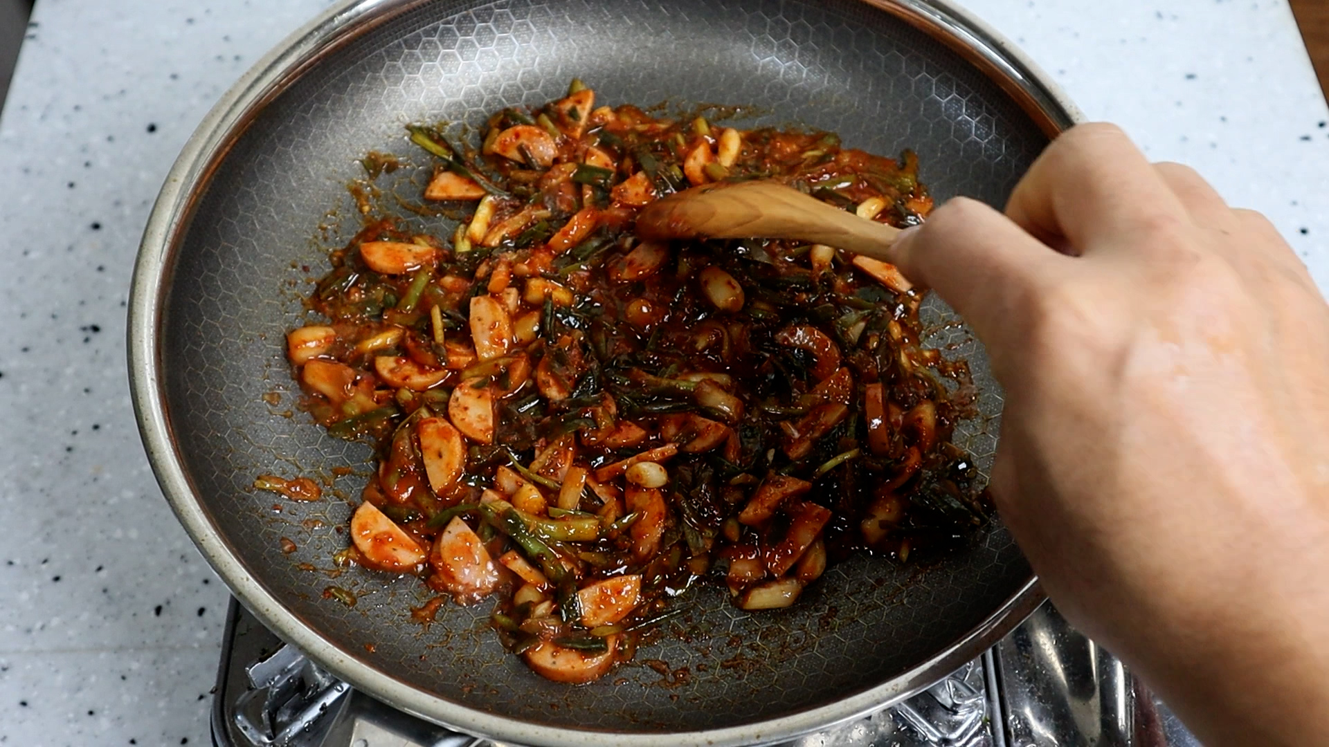 12. 중불 유지하고 골고루 섞은 다음 또 펼쳐서 30초 정도를 가만히 두시고 이걸 3~4차례 반복해서 대략 3분 정도를 볶아주세요. 이렇게 밥과 따로 한번 볶아야 폭~ 꼬부라진 파향을 살짝 누르면서 전체적인 양념이 맛있게 복여진답니다.