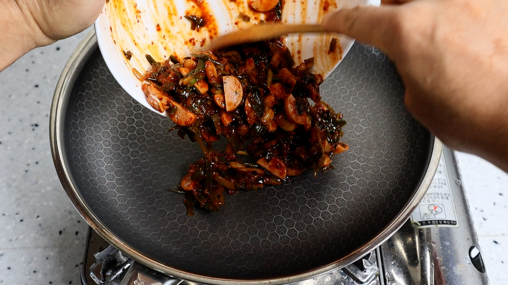 11. 중불로 달군 팬에 섞은 재료를 넣고 골고루 펼쳐서 40초 정도를 가만히 두세요.