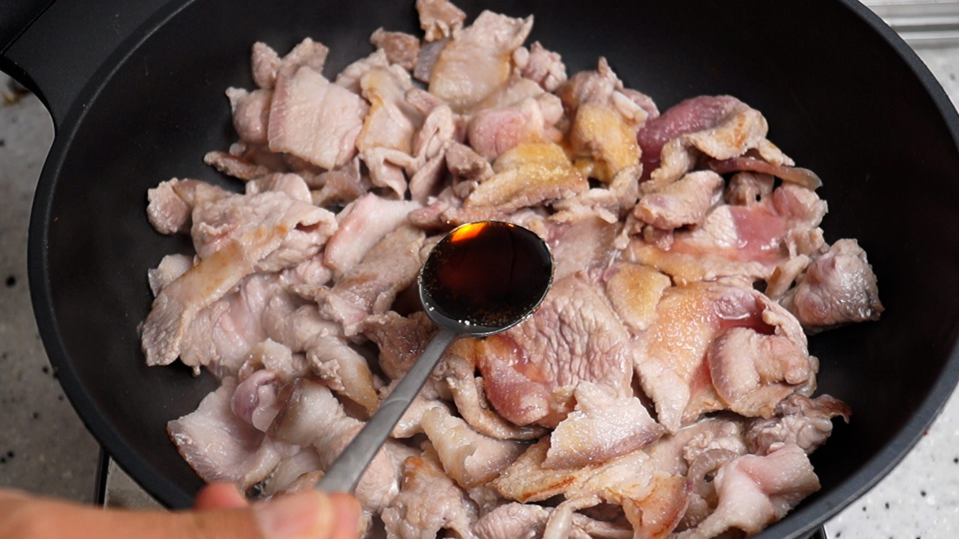 9. 제육용으로 썰려나온 앞다리살을 강불로 달군 팬에서 구워주세요.