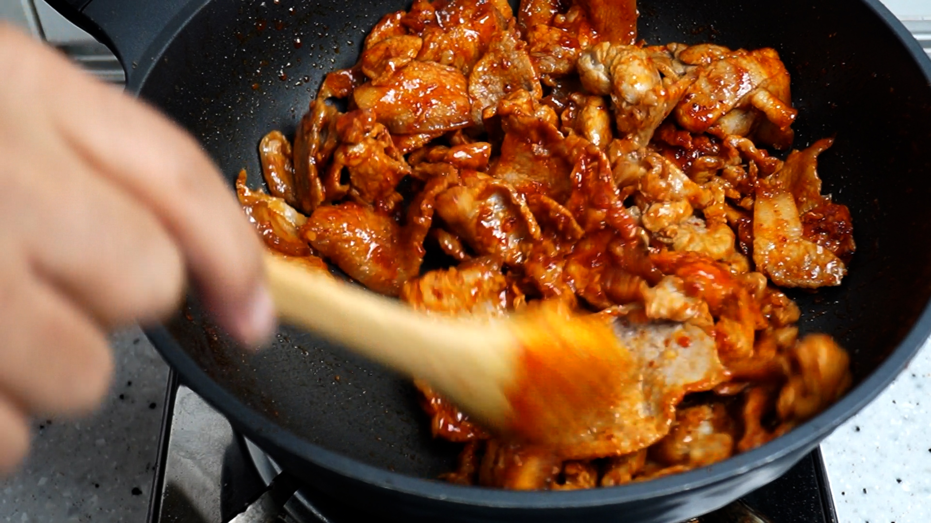 11. 강불에 1분 정도 더 볶아서 고기가 완전히 익고 고기지방이 녹아 기름이 자글자글 거리기 시작하면 양념장을 넣어주세요. 불을 강불로 해야 수분이 그때그때 날아가서 고기를 더욱 맛있게 볶을수 있습니다.