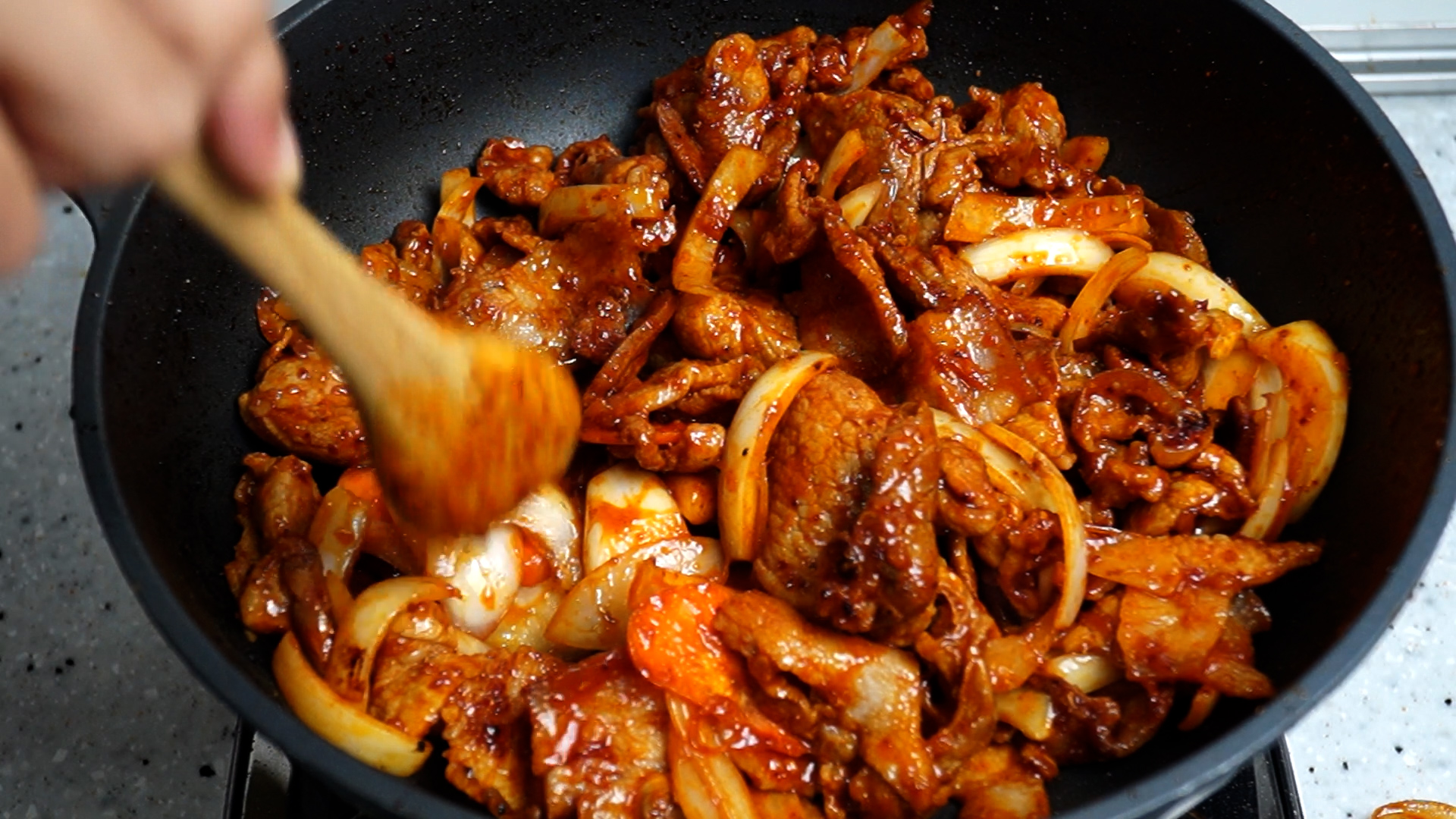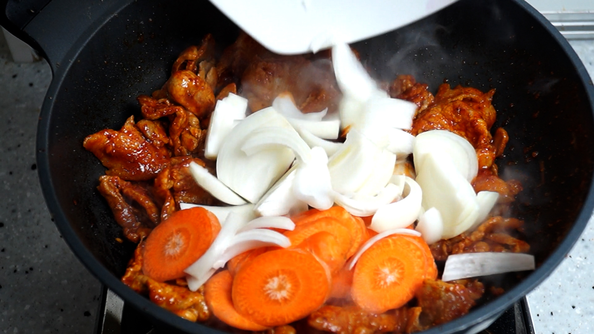 13. 양념을 부은 다음에 강불에 잽싸게 30초를 볶은 다음에 양파,당근을 넣고 강불 유지하고 1~2분을 더 볶아주세요.