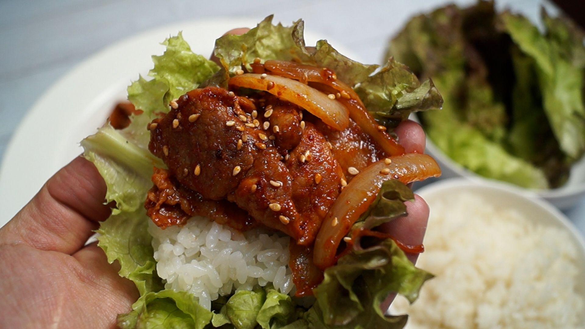 15. 맛있게 볶아진 제육을 쌈싸서 된장~마늘~땡초 올려서 맛있게 드셔보세요! 정말 맛있답니다~