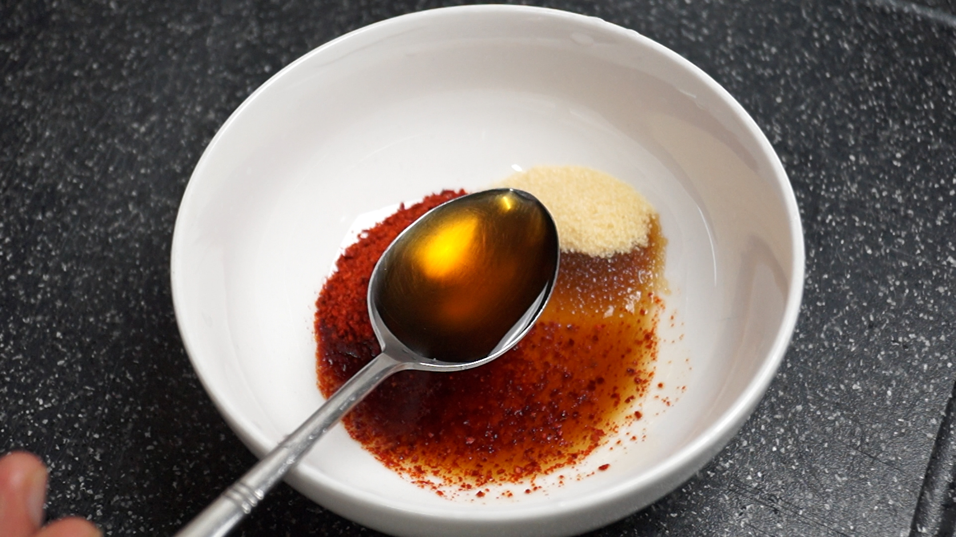 4. 양념장에 표기된 재료를 분량껏 전부 볼에 넣어주세요. 고춧가루는 중간입자 고춧가루를 사용하시고 설탕은 깍아서 1스푼 넣어주세요.