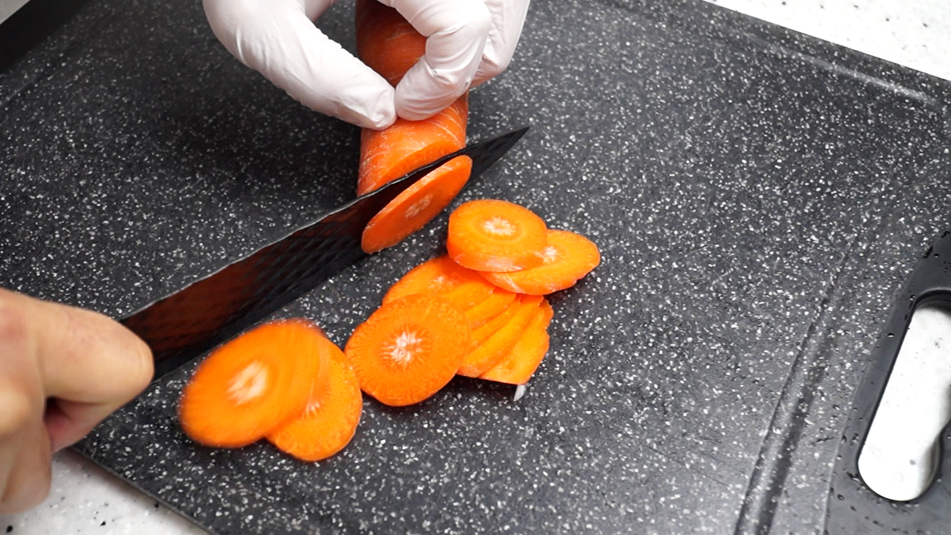 2. 의외로 감칠맛이 많은 당근은 2~3mm 로 얇게 썰고 크기는 기호에 따라 썰어주세요.