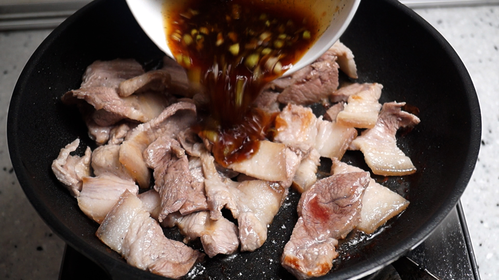 8. 먹기 좋게 자른 고기에 양념을 부을건데 붓기전에 바닥을 잘보시고 기름이 식용유 2스푼 정도 부은 양처럼 제법 흥건히 녹아나와야 합니다. 고기에 지방이 적어 기름기가 적다면 식용유를 1스푼 정도 추가해주세요.