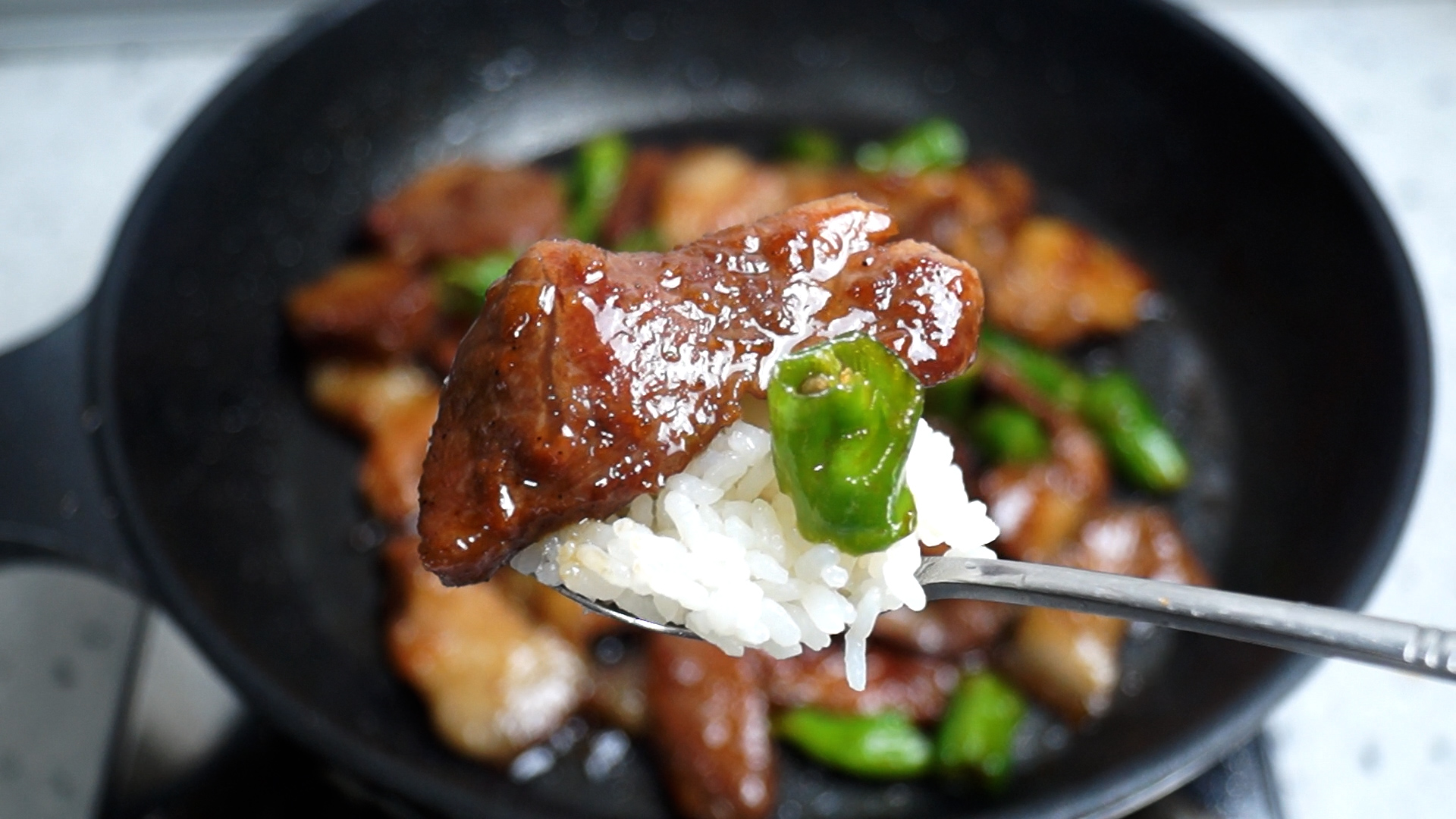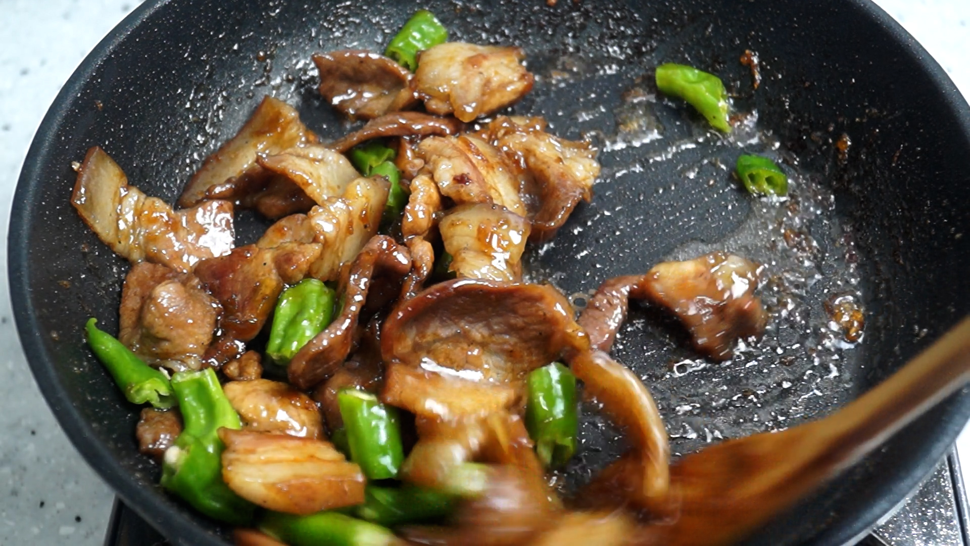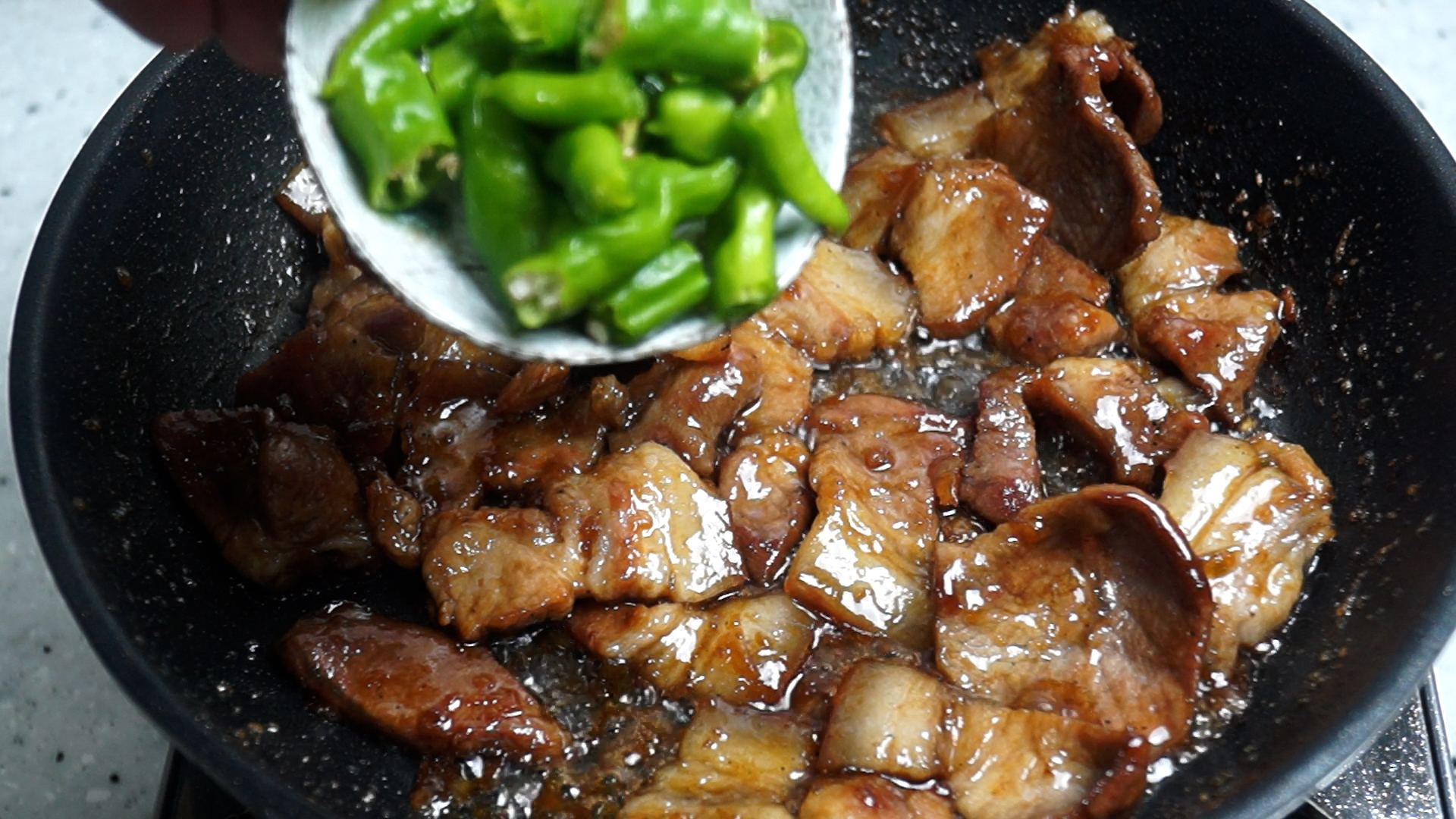 12. 꽈리고추를 넣고 10~20초만 재빠르게 볶아주세요 꽈리고추는 너무 오래 볶으면 질겨지고 물러진답니다.