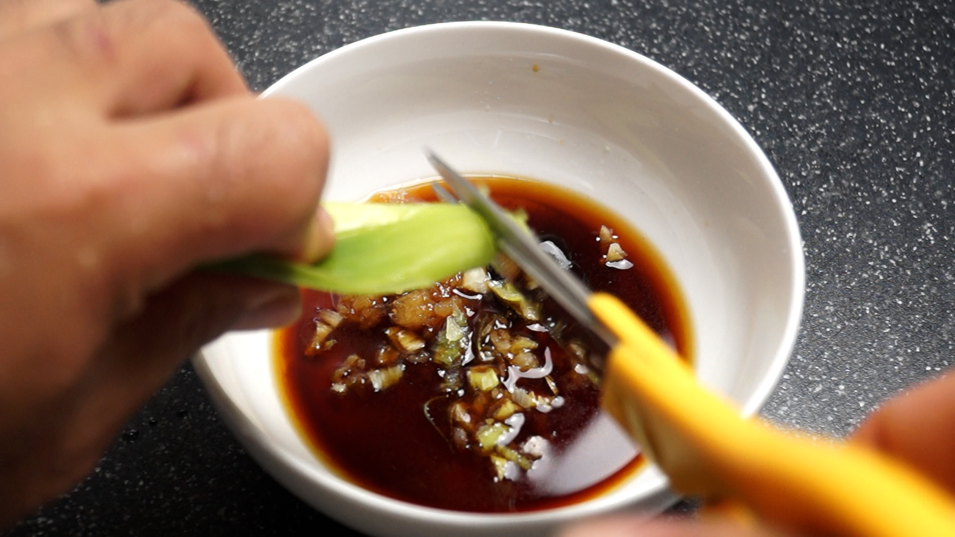 5. 대파를 1큰술 분량 잘게 썰어 넣어주세요. 도마쓸 일이 대파 밖에 없어서 저는 그냥 가위로 썰어 넣었습니다.