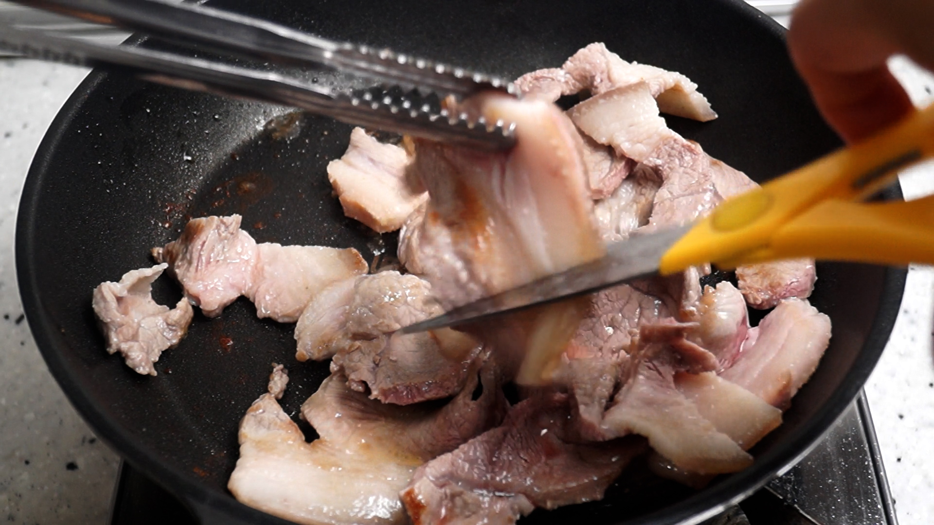 7. 팬을 강불로 달궈서 앞다리살이나 목살 구이용으로 파는것 중에 두께감이 너무 두꺼운거 말고 0.5~1cm 정도 되는 고기를 선택해서 강불에 90% 정도 익으면 먹기좋게 잘라주세요.