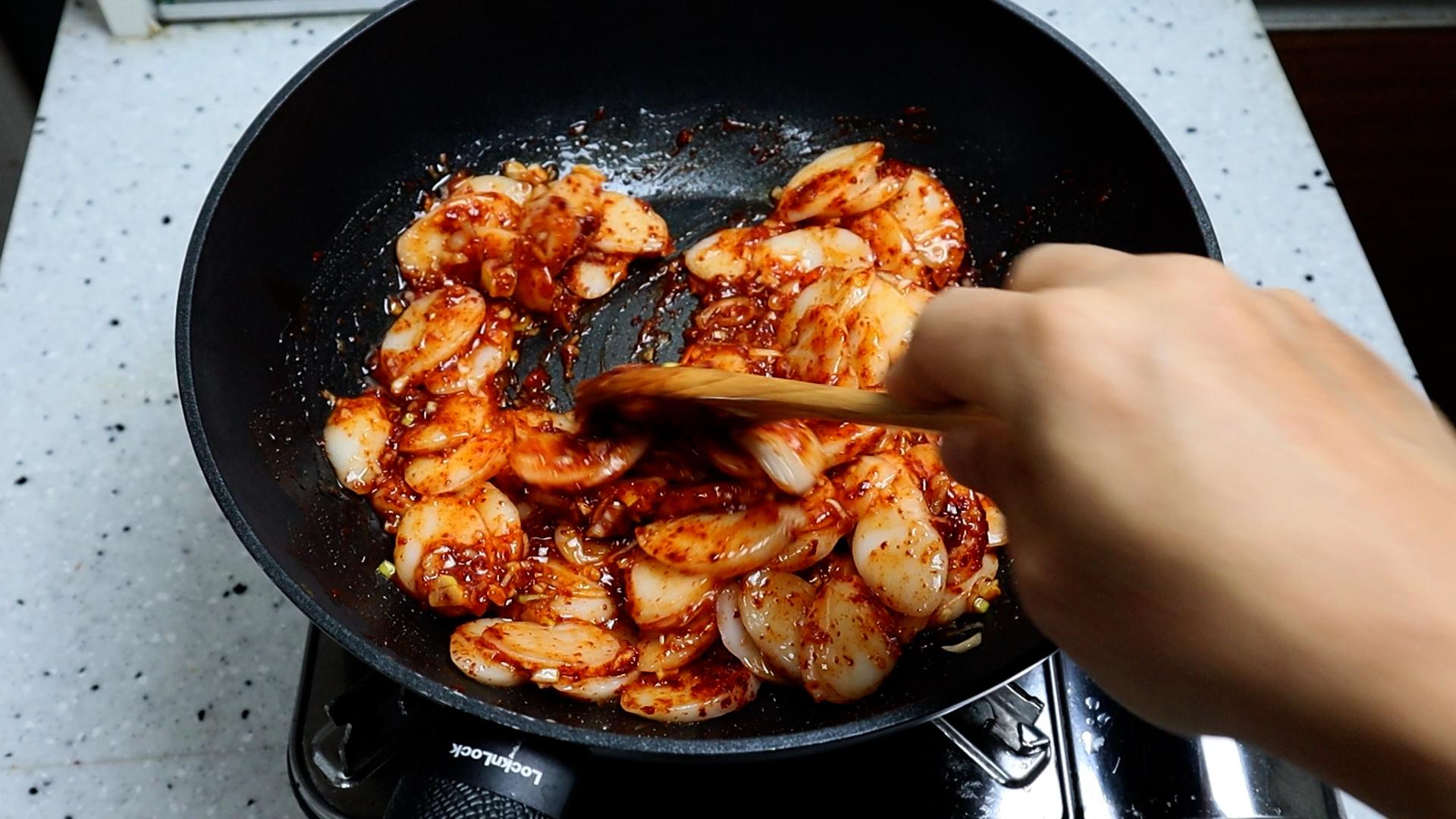 12. 팬은 가능하면 코팅팬을 사용해주시고 볶다 보면 떡끼리 달라 붙어 있을수 있는게 가능한 많이 떡을 떨어뜨려서 뜨거운 팬에서 양념과 함께 볶이게 해주세요. 그래야 편차없이 맛있는 떡볶음을 만들수 있습니다.