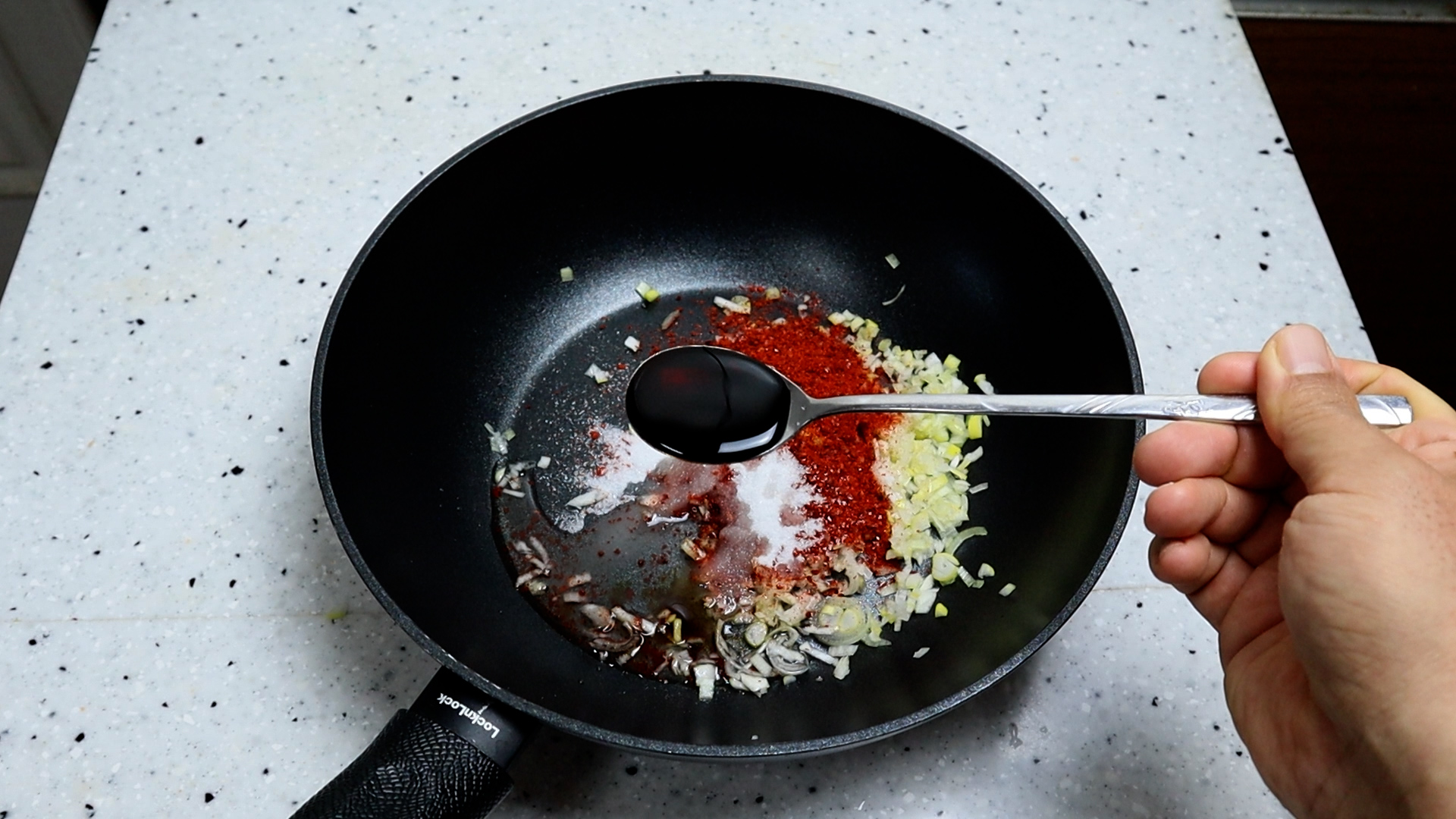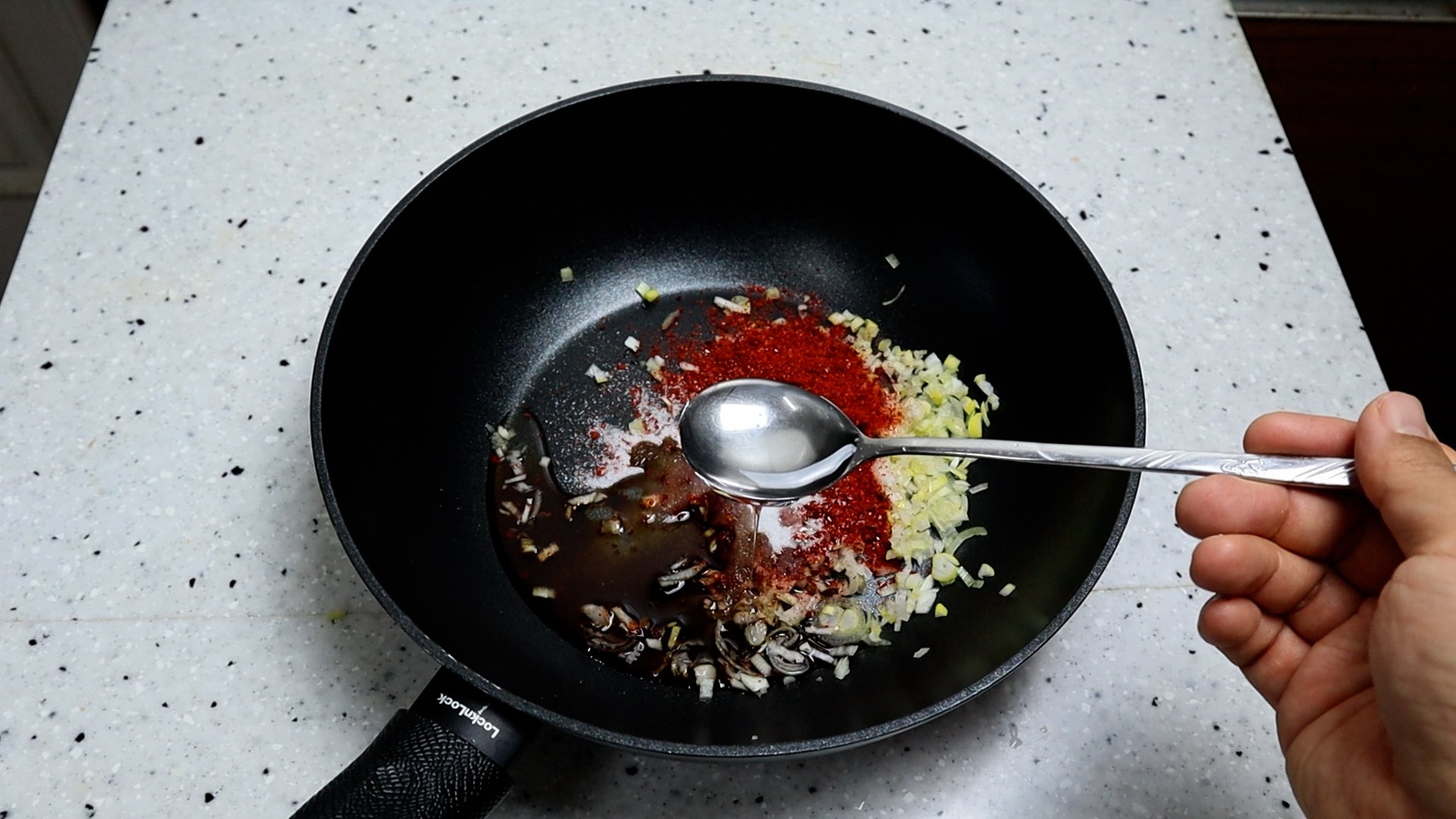 3. 웍에 대파를 넣고 양념란에 적힌 재료를 전부 넣어주세요. 고춧가루는 중간입자 고춧가루를 사용해주세요.