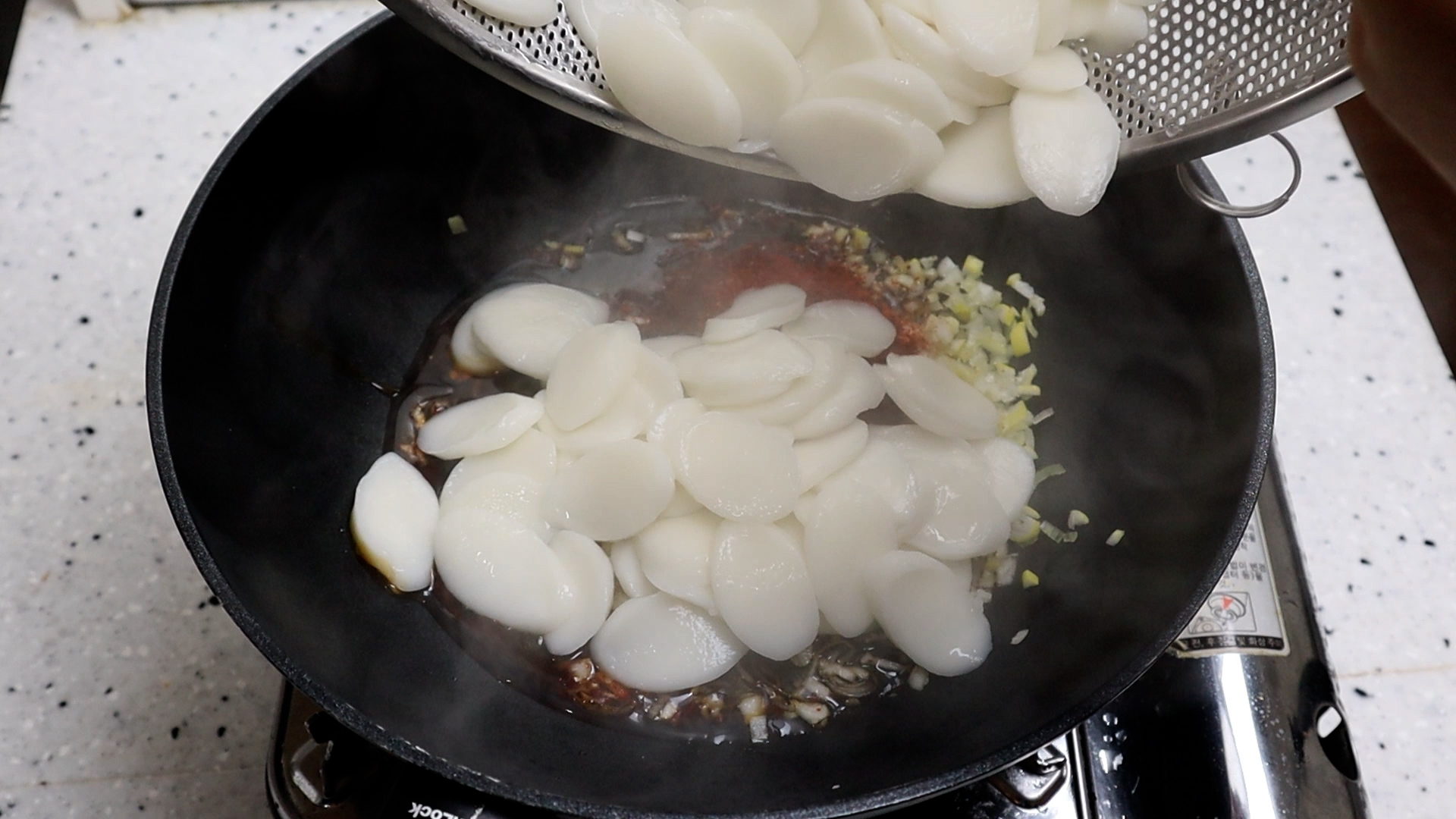 9. 떡을 건져서 양념에 전부 넣어주세요.
