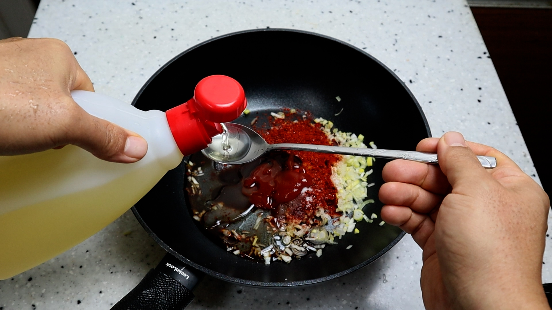 7. 식용유와 간마늘을 넣어주세요~ 식용유가 들어가면 양념들이 식용유에 튀겨지듯 볶아지면서 더욱 맛있는 맛을 낸답니다.